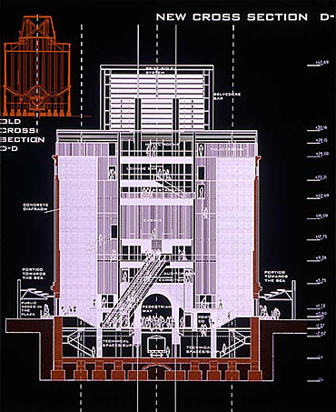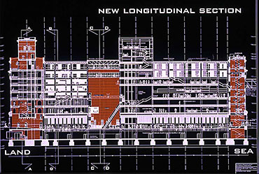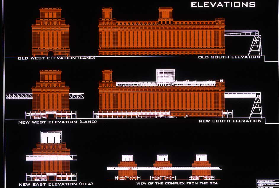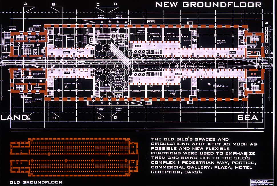 Conversion of an old silo into a multifunctional recreational complex at Constanta Harbour (on Black Sea Shore) Part 2 Project 2002 Irina Bancescu Ion Mincu University of Architecture and Urbanism | Romania The project’s site is the Old Port North in Constanta Harbour, area that along with the peninsula constitute the ancient core of both city and port. This zone is in a visible physical, economic and social decay and it is also isolated from the active city. In accordance with the new port master plan, the whole historic industrial site will be rehabilitated in the benefit of the city, given the high commercial and leisure potential of the redundant buildings.The project aims to establish a major landmark not only with visual impact, but also with a economic and social one. The adaptive reuse scheme tries to create flexible multifunctional spaces with urban features that have prime leisure destination. The approach to transforming the derelict silo stresses contrast, both for the internal and external spaces. New and old overlap, mediate and confront each other, the relationship between the two being regarded as vital. The new external image is based on the difference between the monumental brick facades and the semitransparent light final level which provides natural light and fine sea views.This “city within a city” focuses on the inside-out public space which aims to be a popular venue for all kind of social gatherings (the opened and covered atriums, the pedestrian way towards the sea, the terrace etc.), trying to make architecture a series of events and processes rather than an accumulation of objects and products. This project obviously contains a careful analysis of the problems of the context extended to the level of the city and a solution that shows a great concern for the urban space and the life it involves; it also celebrates diversity, recognizing the value of old and new and, most of all, the necessity of a dialogue between them. The arguments for the conversion are functional, financial, of urban development and preservation of the patrimony at the same time.At the urban level the new building would be absorbed by the existing, given the fact that the proposed functions correspond to a port city with a great flow of tourists; it would also mean a boost for the old peninsula. The conversion aims to maintain the qualities of the old silo while infusing it with elements that are entirely new and innovative; given the fact that the silo is a monument of architecture, the solution brings it to life, not prejudicing its initial image, but emphasizing it. The approach stresses the dichotomy new-old and studies the vital relationship between the two.The focus of the new complex is an open-summer plaza which is diluted into many other public multifunctional spaces; it is reached through a pedestrian way with a commercial gallery and portico which connect land and sea; the access is also lateral through a external portico. All this constitute themselves in a spectacular in-between public space, offering a great variety and flexibility of spaces in the spirit of the contemporary urban life characterized by individuality, uncertainty, chance and diversity, but restricted by the baggage of memory and experience.