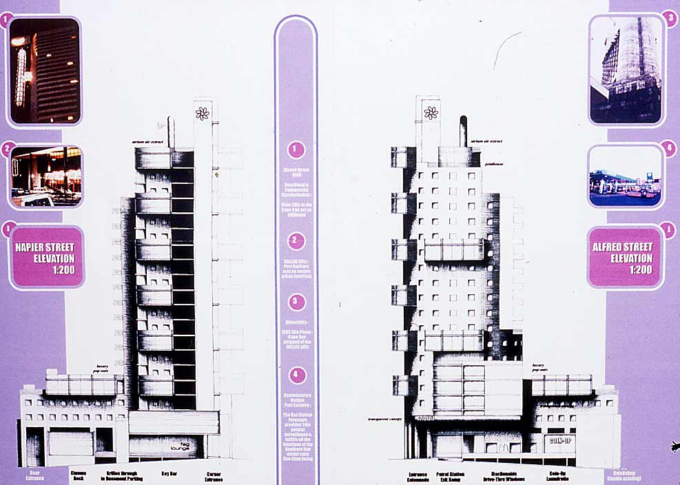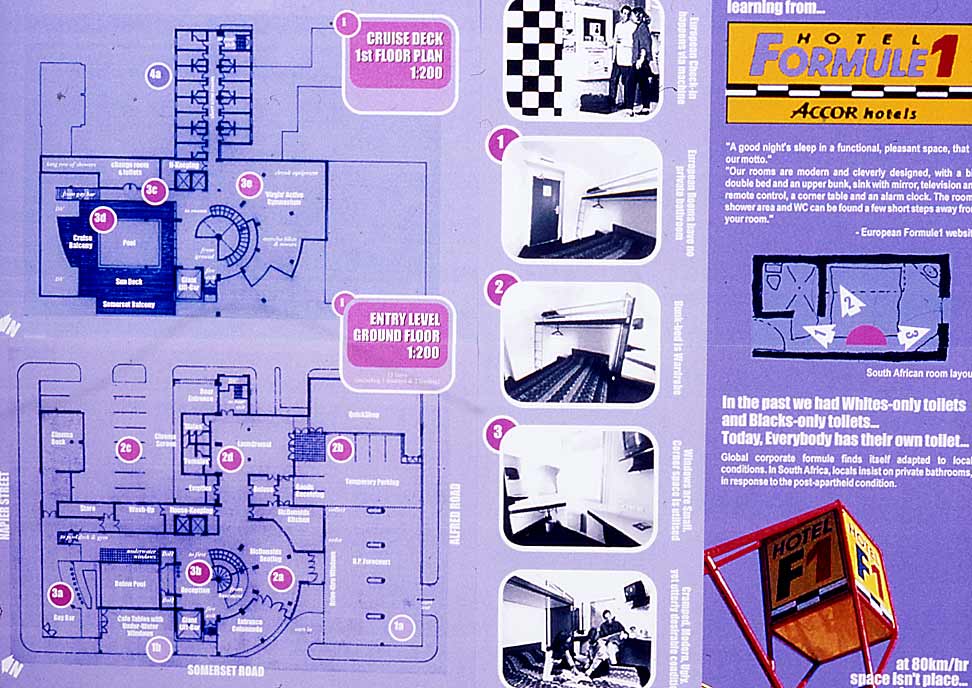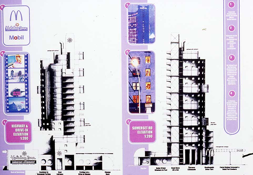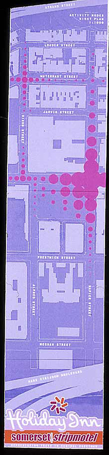 Renting A Room At The Tower of Babel | The Somerset Strip Motel, Cape Town, South Africa. Part 2 Project 2002 Robert Silke University of Cape Town | South Africa Brassai focuses his gaze on that most human of figures, the prostitute. In his photographs, she embodies the essence of the city, and is the human whose presence reveals the complexities of Paris, through her occupation of its streets and interiors.” – Katherine Shonfield, AJ, March2001District Five - a small, innercity, dockside neighbourhood of central Cape Town - was partially (andquite mysteriously) spared destruction - thanks, ironically, to efforts of the late Dr I.D. du Plessis, the ultra-nationalist apartheid cabinet minister – a closeted homosexual – and the man partly responsible for flattening District Six.A history of forced removals & homosexual worker worship today defines the white, gay & gentrified “de Waterkant” – once District Five, a poor, mixed-race fishing community.Recognising the anaemic state of urbanism in present-day Cape Town, a city torn apart byhighways, apartheid & 20th century town planning – the thesis identifies the seeds of a new, post-apartheid urban condition – piggy-backing on infrastructure once used by government to separate and control – the highway.This is an admittedly-imperfect program & brief for the ‘restoration’ of “de Waterkant” - by harnessing the basest of commercial forces in the aid of social transformation – represencing Trash, the exiled working class, into the Cape Town inner city … stripping off a few layers of "de Waterkant"'s debilitating tweeness,as a first step towards restoring Cape Town – that provincial old seaside whore – back to the kind of accidental, dangerous imperfection which just seems to elude her – the kind that makes cities great. TOPICAL THINKING - frames the discourse for the THESIS Bachelor of Architecture program. Although ‘design discourse' in the School Planning is directed at independent inquiry, current investigations by thesis candidates have tended to reflect the events and concerns in the contemporary SA city. The city, as perhaps the highest form of built human expression, therefore, becomes a natural locus for speculation and thinking topically. Individual topics have been specifically identified through a process of research around issues of transformation in relation to emerging political processes, as well as to contemporary architectural theory. In particular, the critique of type and its associative limitations in relation to the assumptions and certainty associated with the <western|apartheid|colonial> position have predominated. The discretionary influence of both precedent and the linear <date|place|building> method promoted by the previous conception of architectural history demands direct confrontation. Site and Program are interpreted as verbs demanding a researched and argued uncovering of ‘siting and programming' as core design generators. These issues have been re-interpreted through a ‘narrative process' whereby interactive exercises sought to provoke difference and effect new sets of social arrangements. Consequently, process has been privileged above that of final product, in an attempt to overturn that other hegemony; formalism | material culture, which seemingly predominates global value. Phenomenal experience and temporal possibility have become checks for developing a thoughtful and resilient material culture within the architectural inquiry. Robert's scheme was selected for its provocative and meaningful contribution to debate surrounding the post-apartheid city. 'Renting a Room at the Tower of Babel – The Someset Strip Motel, Cape Town' evolved an intelligent response to conditions of change in the inner city of Cape Town. Through in-depth readings of cultural constructs in the emerging city, his project has set new spatial relations for addressing the condition of the transforming city. With this submission, it has been the topic and thinking process, rather than purely formal resolution that premiated selection.