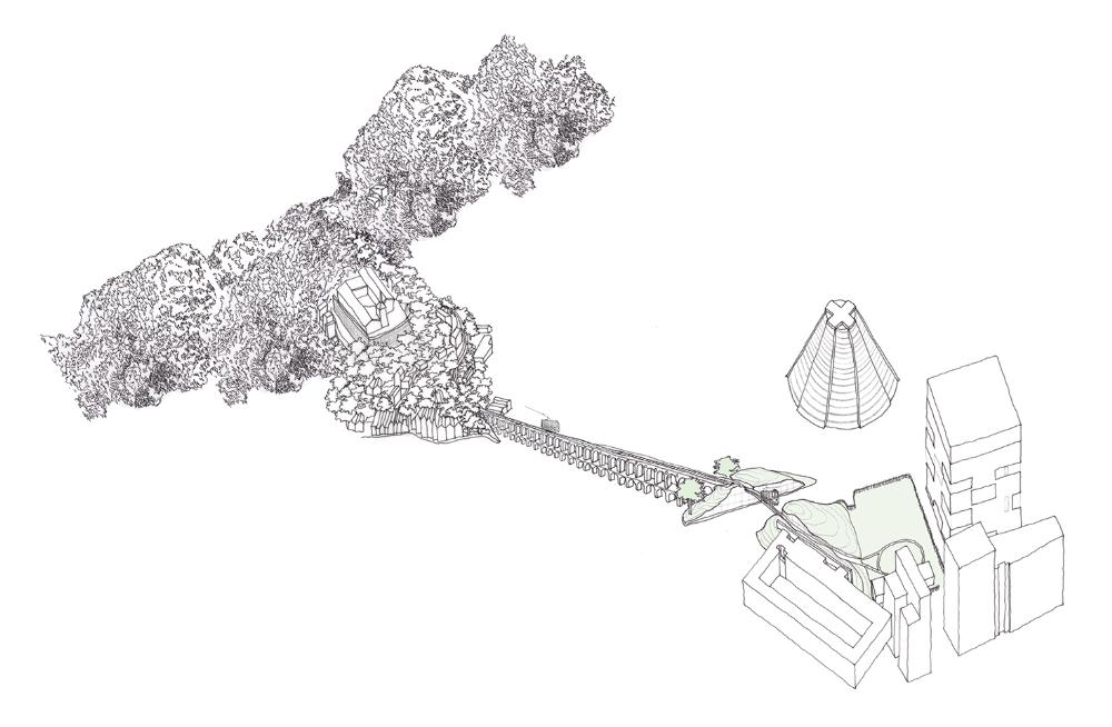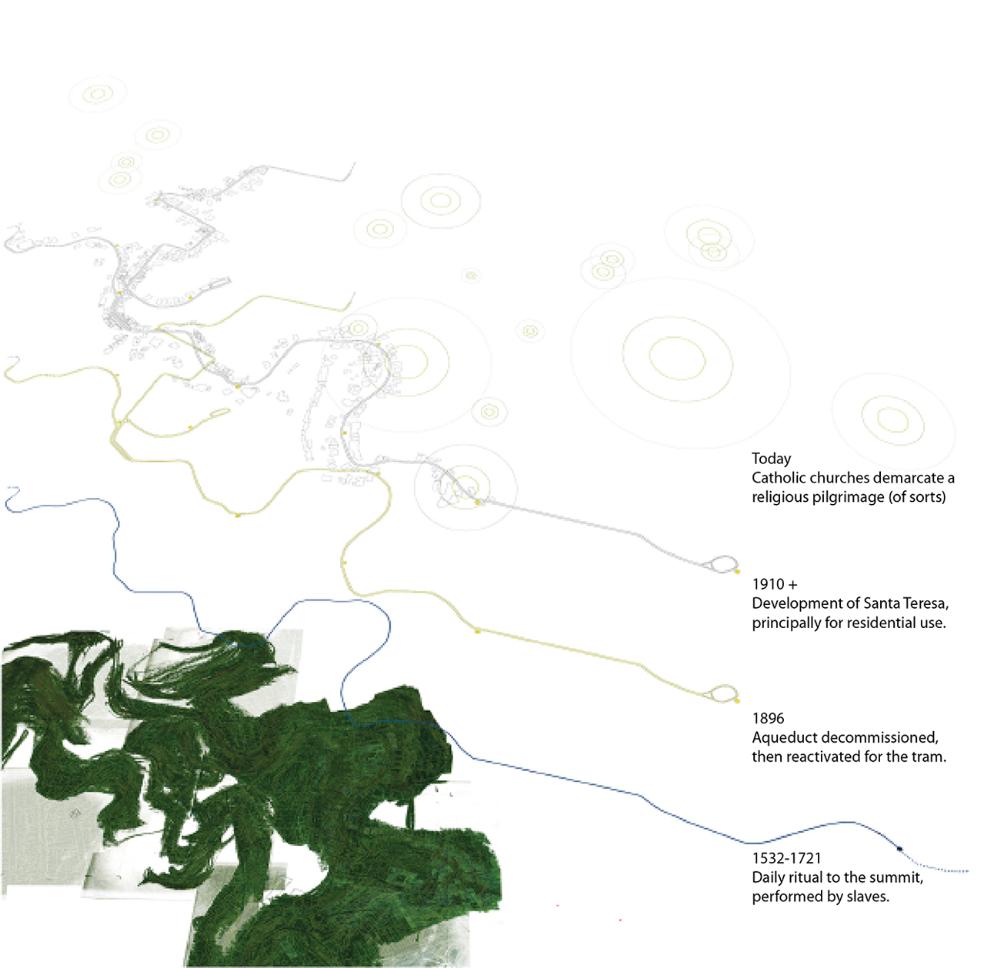 The Journeys In Between: On the Santa Teresa Tram Part 2 Dissertation 2010 Tala Akkawi The Bartlett School of Architecture, UCL | UK For over 113 years trams have travelled round and round a track that connects a modernist valley with a colonial hill, Santa Teresa. Never faltering from its course, the tram travels through a space at each end steered by a loop. Contained here is a certain lyricism and poetry. I have used the dissertation to investigate this poetry to situate in my design proposal of a transport interchange in Rio de Janeiro.Accompanying the primary understanding of the track as an inhabitable threshold are notions of journey and transience, of motion and experience, of living in a line and of different places including the liminal (the between).The dissertation begins with an historical evaluation of the origins of the tramway, based on ritual and repetition. By investigating how its origins evolved and manifest today, we are provided with an insight to the overwhelming notion of place present at Santa Teresa. This was most evident during my experience in the journey; explained through a description of the system(s) and, therefore, the nature of the various experiences had by myself, local and tourist. Focus is placed on the everyday, with each situation explored using a combination of methods, such as film, personal accounts and photography, considering various fields, such as behavioural cognition, ethnography and sports. This uncovered a need to reconsider boundaries, augmented by the transient aspect of the tram leading an observer in the system to constantly re-distinguish. The quality of this journey, as distinct yet repetitive, brings about the idea of a recursive circularity. One that tends to stability (the everyday) as demonstrated by Heinz Von Foerster’s Eigenvalues and self-referential Ouroboros snakes.The dissertation follows by materialising the analysis of this complex system into a moving model, based on the mechanism of an orrery. The machine provided an unexpected outcome – this was not a model of motion but a model for form, made evident through the projection of shadows and construction of spatial experiences. This ‘accident’ highlights a boundary of limitation to formal systems, where design requires a level of abstraction, of ideas and metaphors, in order to transcend the use of intuition. Tala Akkawi’s dissertation is based on very wide reading which has, in her writing, acquired a surprising coherence. It is concerned with the Santa Teresa tramway in Rio de Janeiro, and is rich in reference and information. There’s some delightful history with some very good historical drawings. But the key concept that emerges in Tala’s dissertation is the tramway (and its associated journey) as threshold and the in-betweenness associated with this. Threshold, as Tala discusses it, is more than the crossing between 2 places. Tala reflects on thresholds, distinctions/boundaries and liminal states, as explored in several disciplines from anthropology to cybernetics to logic, which she uses to enrich understanding of the quality of the tram journey. It’s not just that the tram journey itself is liminal. The rails themselves, for instance, create distinctions which are enacted by travellers. The circular passage of the tramway is taken to indicate the recursion of self-reference: a concept central to current thinking in boundary logic (distinction drawing: the creation of thresholds and thus the liminal). The mechanics of distinction drawing leads to a notion of the ephemeral (seen as quasi liminal), but also of constructing the constant from the ephemeral, the stable end point of a recursion.This appreciation allows Tala to give significance to and express the quality of the journey, and to consider a possible design response capitalising on the waiting, the liminal, the threshold inhabited offering the possibility for events to occur within events to fill in the “emptiness” of waiting, of being awkwardly in the in-between. She considers the tram interchange as a place of transition, the point being that the interchange is also a place in its own right (in the manner of the “space” of the thick wall of Mayan architecture, into which one must step as one transits between inside and out). Waiting becomes a positive act, not an empty interregnum.I found myself intrigued by the mechanism and projection she uses to capture the nature of her understanding such that it begins to suggest form, and then variety. Tutor(s) Professor Ranulph Glanville
