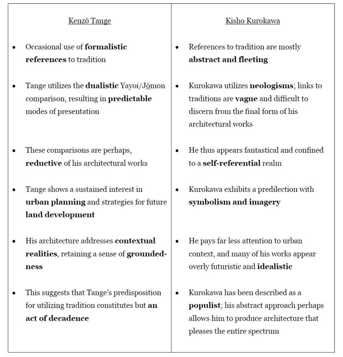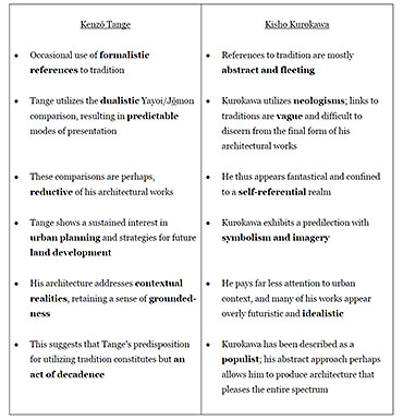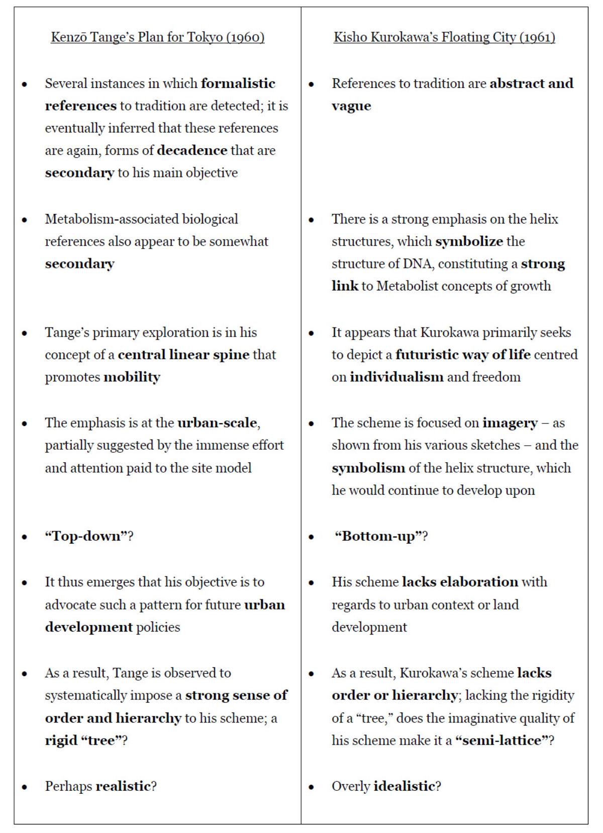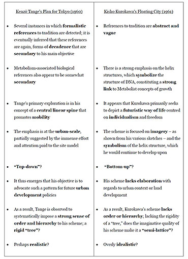 Tradition in Metabolism: The Varied Approaches of Kenzo Tange and Kisho Kurokawa in Their Utilization of Tradition in Architecture Part 2 Dissertation 2014 Terence Tang National University of Singapore | Singapore The utopian megastructural visions of the avant-garde Metabolists initially appear to suggest a new urbanism primarily driven by the employment of futuristic technology. However, a closer reading of the movement reveals itself as a critical response against functionalist modernism and an attempt to assimilate Japanese tradition into modern architecture. Does therein not lie a seeming contradiction, for do we not associate technology with the present, while tradition, the past?In The Invention of Tradition, Eric Hobsbawm challenges our common perception of tradition by suggesting that traditions are but deliberate constructs of modernity. Certainly, Japanese modernists in postwar Japan were observed to approach the use of tradition with an enthused, opportunistic attitude; why and how did they utilize tradition in the creation of modern Japanese architecture? A critical study of Kenzo Tange and Kisho Kurokawa, two figures central to Metabolism, reveals that both architects adopted distinctively different approaches in their utilization of tradition; while Tange is observed to adopt an occasionally formalistic – and arguably, predictable – approach, Kurokawa’s is characterized by the use of abstract philosophical references, littered with neologisms.The investigation will culminate in a comparison between their respective Metabolist proposals for the city: Tange’s Plan for Tokyo (1960) and Kurokawa’s Floating City (1961). Elucidating the differences between the two schemes, this paper will analyze and critique how Tange’s and Kurokawa’s varied approaches towards the use of tradition have resulted in two markedly different visions for the future cit Tutor(s) Tsuto Sakamoto