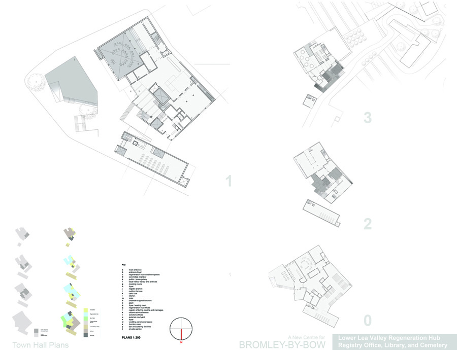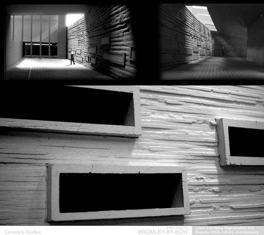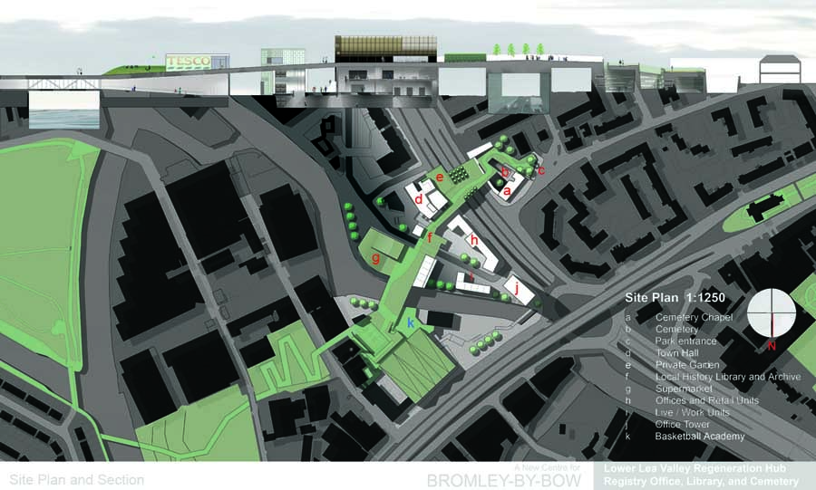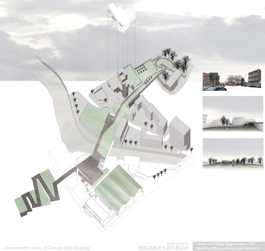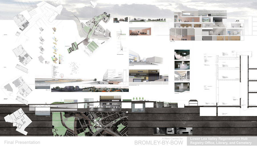 Lea Valley Regeneration Hub, Registry and Cemetery Part 2 Project 2005 Peter Foulk Kingston University Kingston | UK An existing cemetery, situated west of the A12, is reworked as a series of mausoleums/tombs, the roof of which forms a park, which bridges over the A12 towards the registry and regeneration hub. Archives are situated below the new ground, thus the records and graves form the foundation of this new community facility. The regeneration hub is a temporary base to oversee the regeneration of the lower lea valley. Constructed in timber, it can be removed once its purpose is fulfilled, leaving the permanent concrete structure of the registry as a ruin, which mediates between the new and old ground. The site is to the South of the Mile End Road on the fringes of the London Olympic bid. The land currently remains cut off from the surrounding area in programme and content. This project links Bow to the new works of the Lea Valley by redeveloping a disused cemetery and creating a raised park which joins to a public forum over the road. This civic building is rooted in the ground by an archive, evolves into a debating chamber and finally a registry which opens out onto the park above. The scheme also accommodates other important civic amenities.