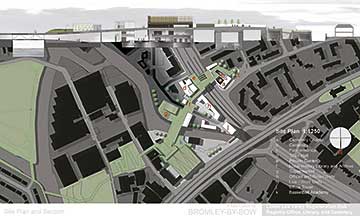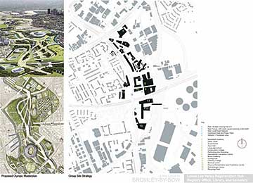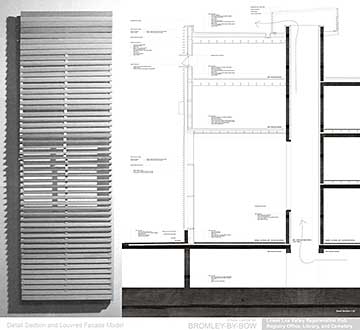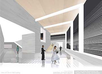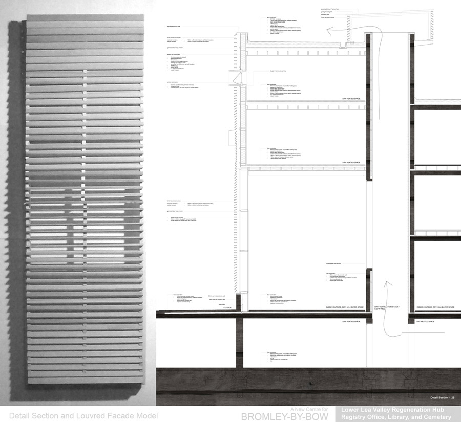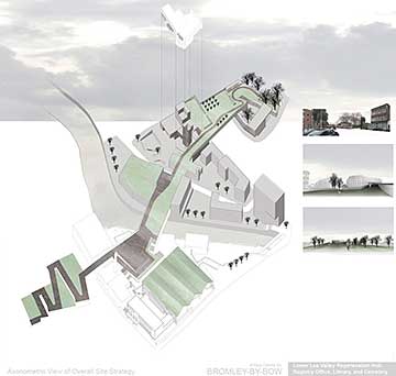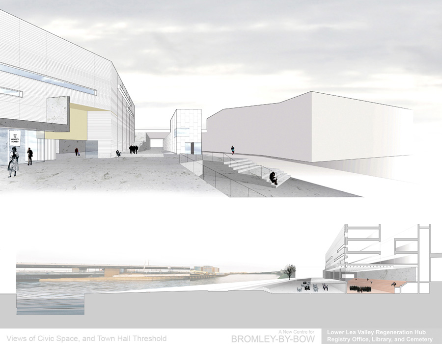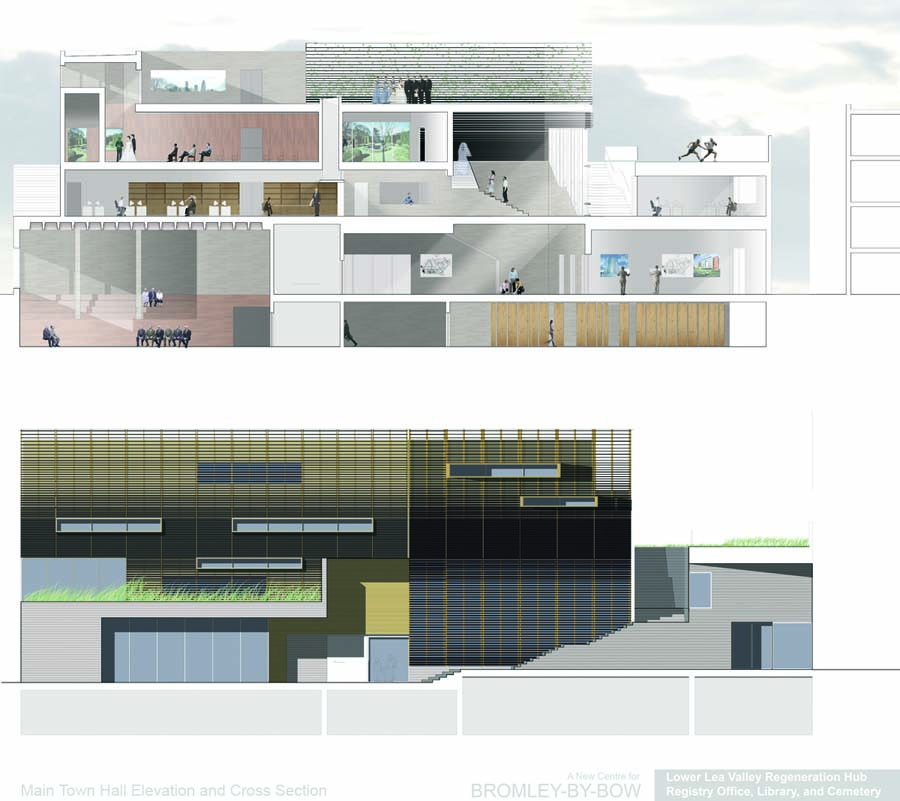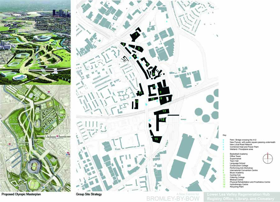 Lea Valley Regeneration Hub, Registry and Cemetery Part 2 Project 2005 Peter Foulk Kingston University Kingston | UK An existing cemetery, situated west of the A12, is reworked as a series of mausoleums/tombs, the roof of which forms a park, which bridges over the A12 towards the registry and regeneration hub. Archives are situated below the new ground, thus the records and graves form the foundation of this new community facility. The regeneration hub is a temporary base to oversee the regeneration of the lower lea valley. Constructed in timber, it can be removed once its purpose is fulfilled, leaving the permanent concrete structure of the registry as a ruin, which mediates between the new and old ground. The site is to the South of the Mile End Road on the fringes of the London Olympic bid. The land currently remains cut off from the surrounding area in programme and content. This project links Bow to the new works of the Lea Valley by redeveloping a disused cemetery and creating a raised park which joins to a public forum over the road. This civic building is rooted in the ground by an archive, evolves into a debating chamber and finally a registry which opens out onto the park above. The scheme also accommodates other important civic amenities.