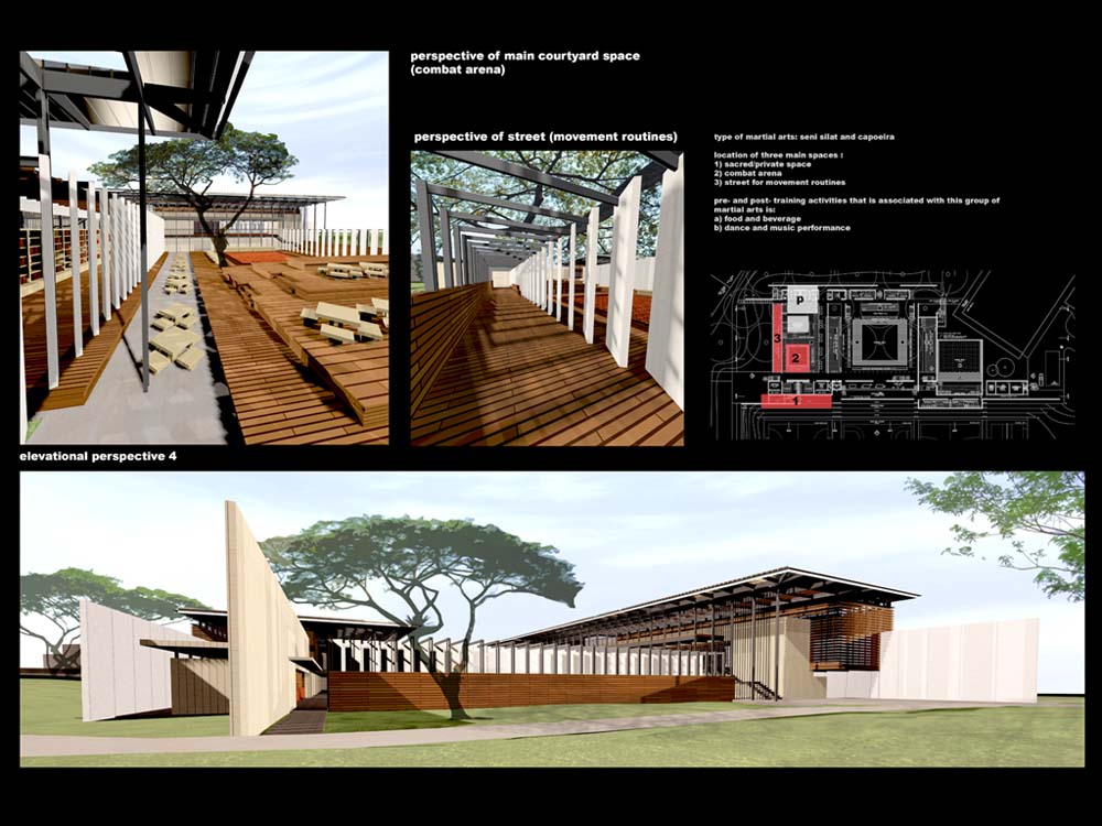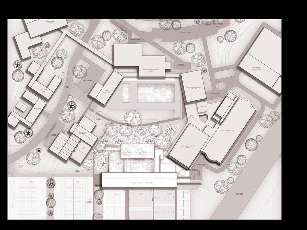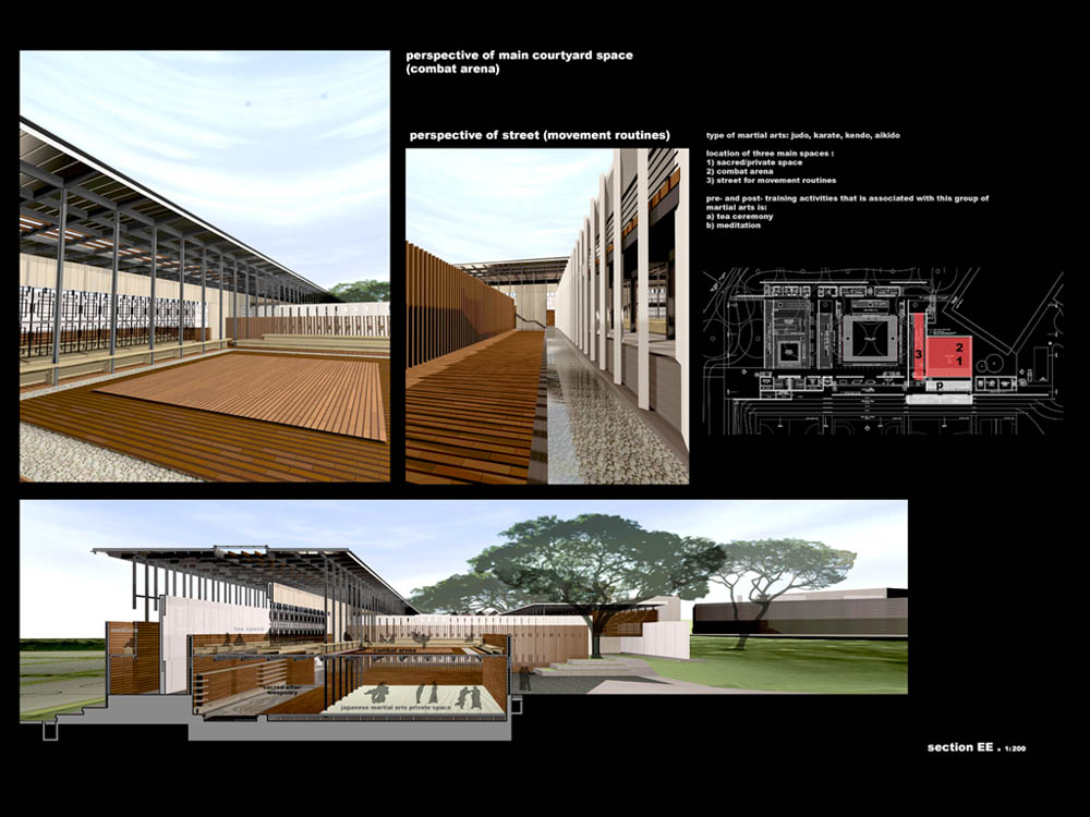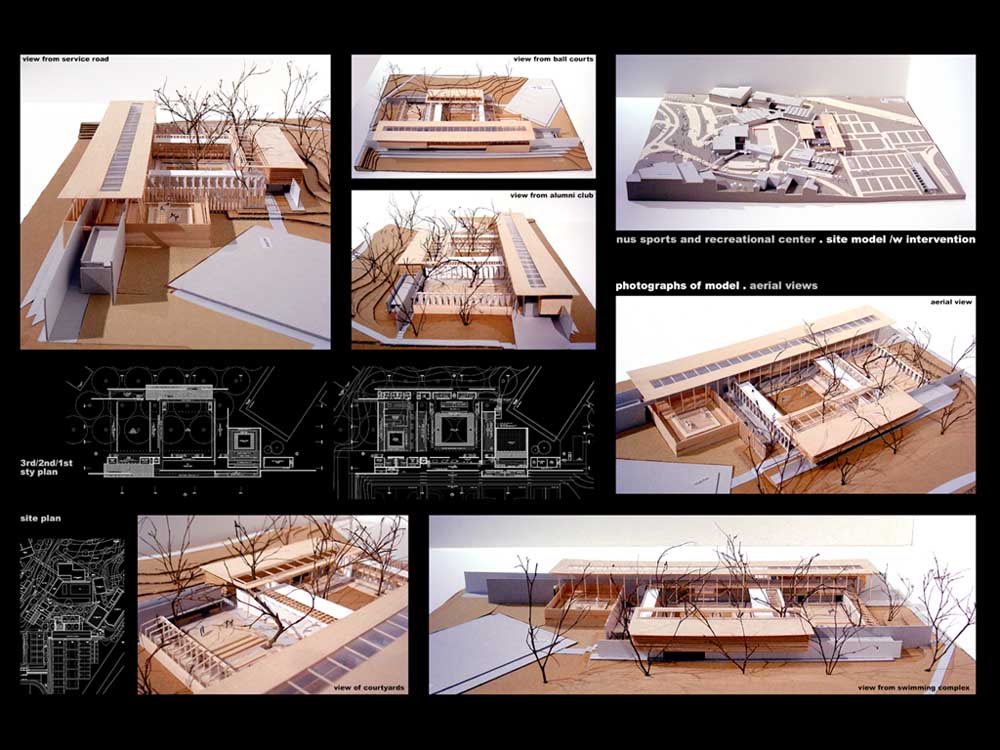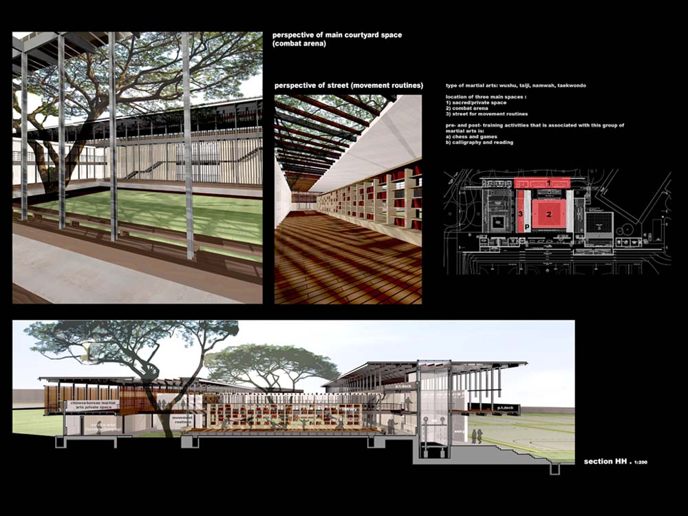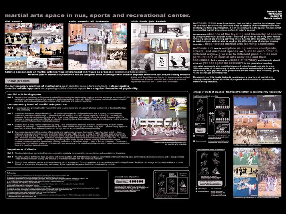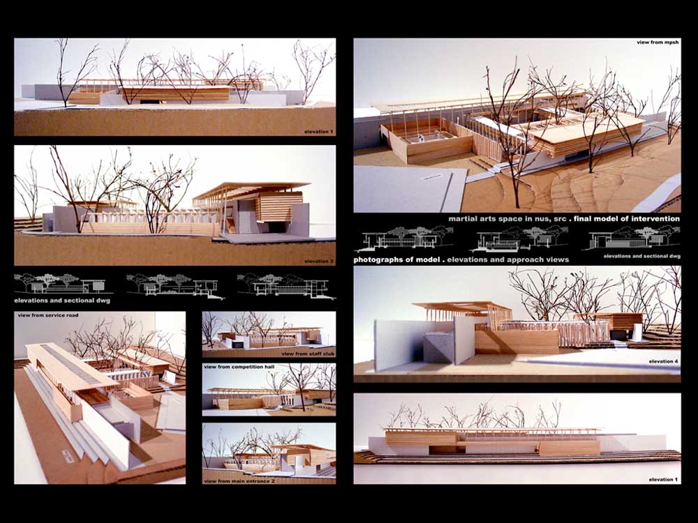 Martial Arts Space in National University of Singapore, Sports and Recreational Center Part 2 Project 2005 Bernard Lee Yeow Siong National University of Singapore | Singapore This is a critic of contemporary martial arts practice spaces, which lacks the quality for practitioners to enjoy the practice process of martial arts. Key design emphasis are:1) Layering the spatial sequence –Pre and post-practice rituals, robing, belongings, ceremonies, warm-up, moving, static routines, sparring, and quiet study spaces were sequenced and layered for ritualistic legibility and architectural interest.2) Use of screens and layered transparency –Screens filter different layers of spatial transparency, which also respond to the equatorial climate, allowing users to enjoy the context of beautiful trees and canopies of filtered light. 3) Hierarchy of materials – Architectural legibility of diffused spatial boundaries between public and private domains is expressed using the contrast between opaque masonry elements (public domain) and lighter timber and steel construction (public domain).4) Infiltration of public into private domains and landscape into architecture –The design is not a closed box but an intervention of screens, where public context of recreational, sports and pre-post-examination functions are integrated, revolving around a set of existing beautiful mature rain-trees, allowing them to define spaces so architecture and landscape can overlap seamlessly into one entity.Architectural expression is used honestly, without cosmetics, with minimal intervention to generate maximum enjoyment of spaces for its users. The hopeful end result is the creation of a memorable martial arts place. The thesis project is premised on a real challenge experienced by the student body on campus concerning a martial arts facility.The project raises the question on what kind of architecture would be relevant in the context of a contemporary campus sports facility yet provide the appropriate spirit of ritualistic discipline steeped in martial arts tradition? The filmic idea that martial arts is taught in traditionally architectured pugilist schools led by a heroic master is cliched and irrelevant to a 25,000 strong premier campus. Yet the teaching and the practice of the martial arts forms is not without ritual and order.The two extreme conditions are complex challenges given an additional requirement that any campus building should be flexible enough for accommodating other functions including the hosting of competitions and the semestrial examsgiven its location adjacent to existing sports complexes and multi purpose halls The site strategy has in a brilliant stroke provided the spatial layering required to connect the scheme to the campus sports network whilst filtering access into pugilists' practice coutyards and street spaces without compromising meditation and sensei domains. Practice courtyards are formed around existing treeskeeping the past elements of the site as relevant markers for the futureThe planar composition shields private spaces from direct view but allows viewing from galleries which connect to campus pathways.One side of the scheme fronts the existing tennis courts as a grandstand whilst framing the practice courts in the other direction. The scheme is delicately balanced with an architecture of planar screens of varying opaqueness defining courtyards, tunnels, streets and walls which are naturally lit and ventilated.The scheme allows a degree of interchangeabilty in the useage of its indoor and outdoor spaces for the range of art forms it accommodatesThe proportions of the constructional elements and the