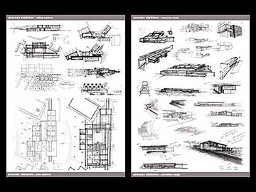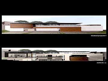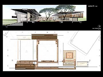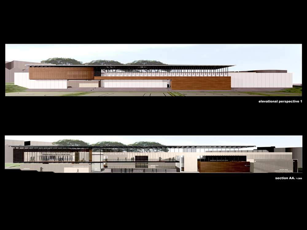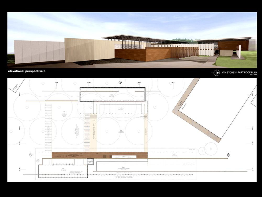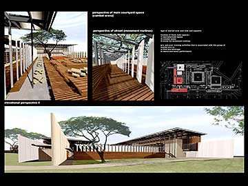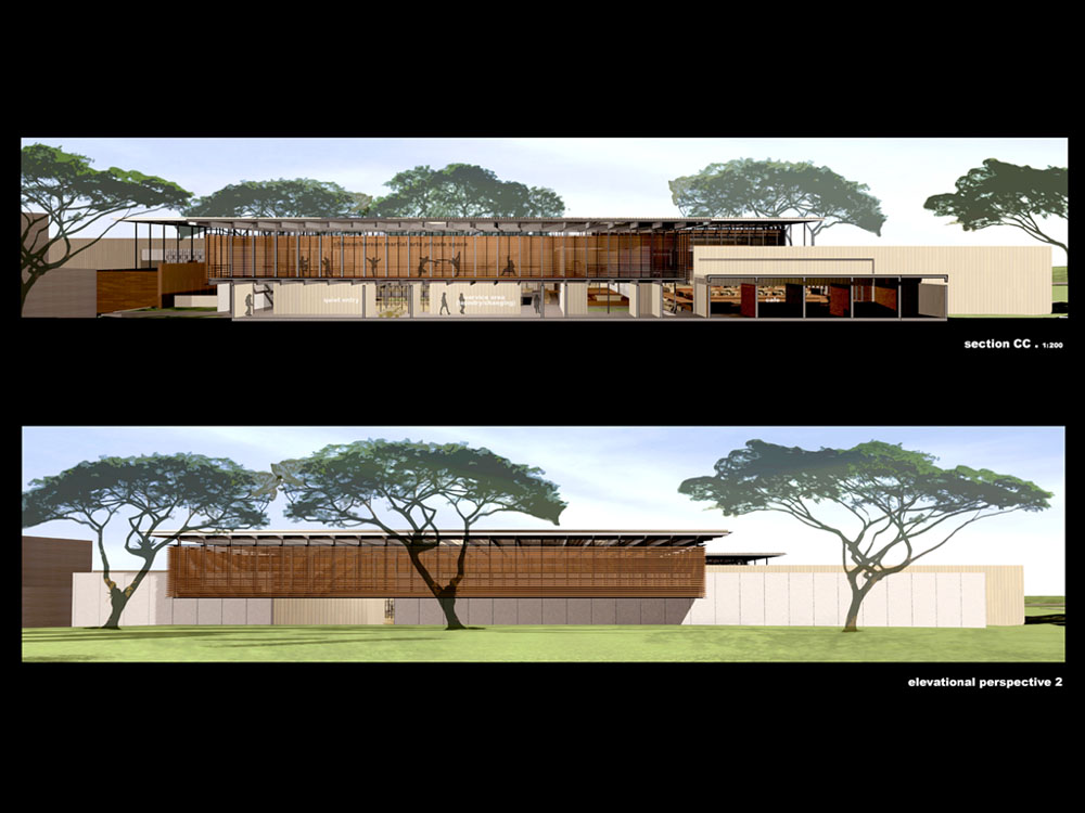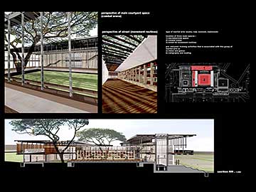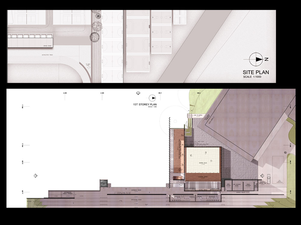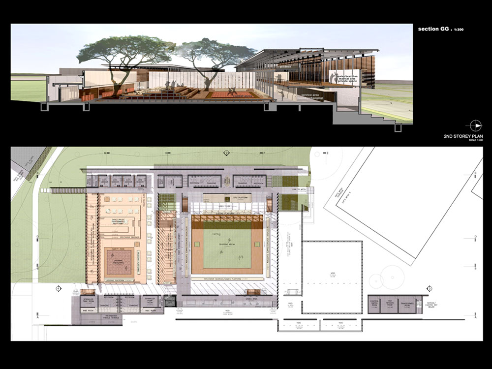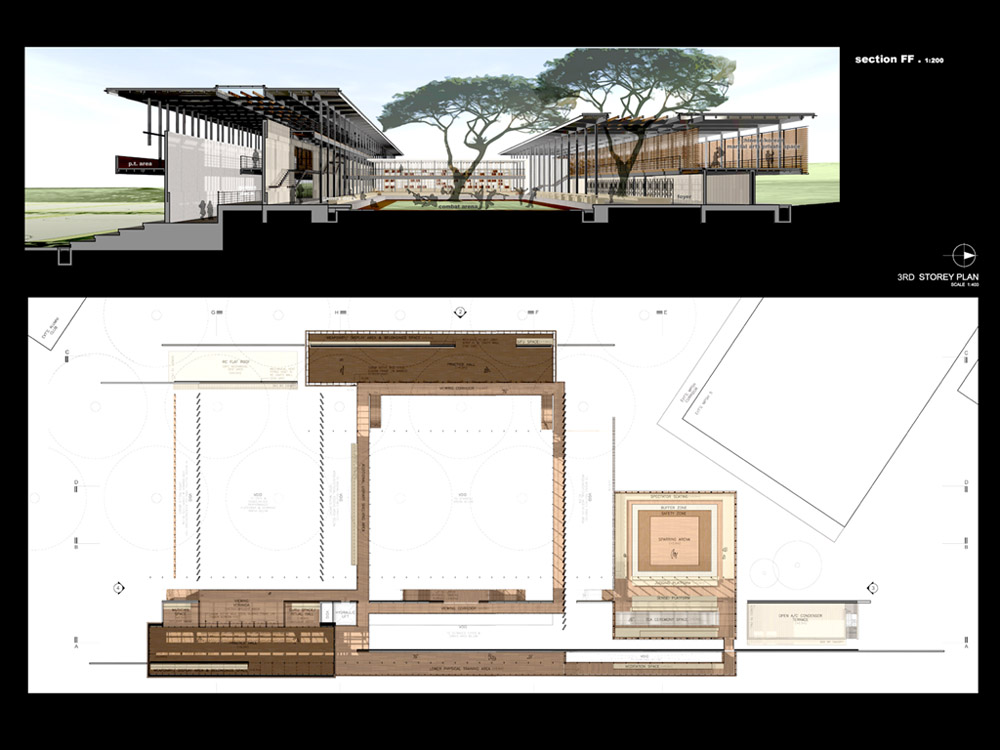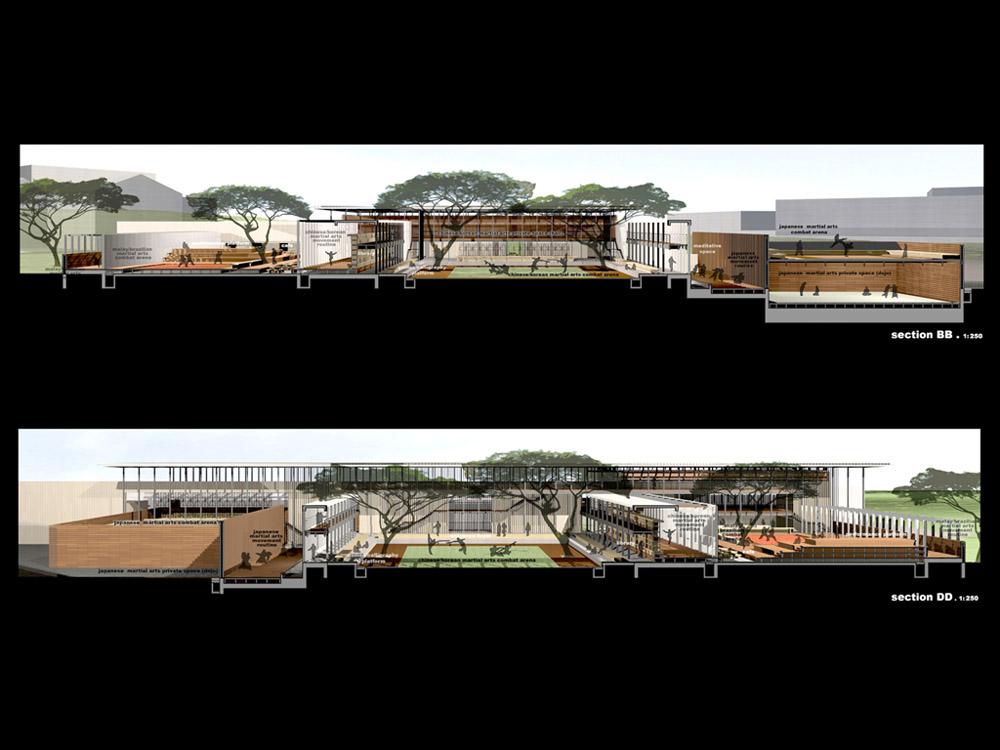Martial Arts Space in National University of Singapore, Sports and Recreational Center Part 2 Project 2005 Bernard Lee Yeow Siong National University of Singapore | Singapore This is a critic of contemporary martial arts practice spaces, which lacks the quality for practitioners to enjoy the practice process of martial arts. Key design emphasis are:1) Layering the spatial sequence –Pre and post-practice rituals, robing, belongings, ceremonies, warm-up, moving, static routines, sparring, and quiet study spaces were sequenced and layered for ritualistic legibility and architectural interest.2) Use of screens and layered transparency –Screens filter different layers of spatial transparency, which also respond to the equatorial climate, allowing users to enjoy the context of beautiful trees and canopies of filtered light. 3) Hierarchy of materials – Architectural legibility of diffused spatial boundaries between public and private domains is expressed using the contrast between opaque masonry elements (public domain) and lighter timber and steel construction (public domain).4) Infiltration of public into private domains and landscape into architecture –The design is not a closed box but an intervention of screens, where public context of recreational, sports and pre-post-examination functions are integrated, revolving around a set of existing beautiful mature rain-trees, allowing them to define spaces so architecture and landscape can overlap seamlessly into one entity.Architectural expression is used honestly, without cosmetics, with minimal intervention to generate maximum enjoyment of spaces for its users. The hopeful end result is the creation of a memorable martial arts place. The thesis project is premised on a real challenge experienced by the student body on campus concerning a martial arts facility.The project raises the question on what kind of architecture would be relevant in the context of a contemporary campus sports facility yet provide the appropriate spirit of ritualistic discipline steeped in martial arts tradition? The filmic idea that martial arts is taught in traditionally architectured pugilist schools led by a heroic master is cliched and irrelevant to a 25,000 strong premier campus. Yet the teaching and the practice of the martial arts forms is not without ritual and order.The two extreme conditions are complex challenges given an additional requirement that any campus building should be flexible enough for accommodating other functions including the hosting of competitions and the semestrial examsgiven its location adjacent to existing sports complexes and multi purpose halls The site strategy has in a brilliant stroke provided the spatial layering required to connect the scheme to the campus sports network whilst filtering access into pugilists' practice coutyards and street spaces without compromising meditation and sensei domains. Practice courtyards are formed around existing treeskeeping the past elements of the site as relevant markers for the futureThe planar composition shields private spaces from direct view but allows viewing from galleries which connect to campus pathways.One side of the scheme fronts the existing tennis courts as a grandstand whilst framing the practice courts in the other direction. The scheme is delicately balanced with an architecture of planar screens of varying opaqueness defining courtyards, tunnels, streets and walls which are naturally lit and ventilated.The scheme allows a degree of interchangeabilty in the useage of its indoor and outdoor spaces for the range of art forms it accommodatesThe proportions of the constructional elements and the