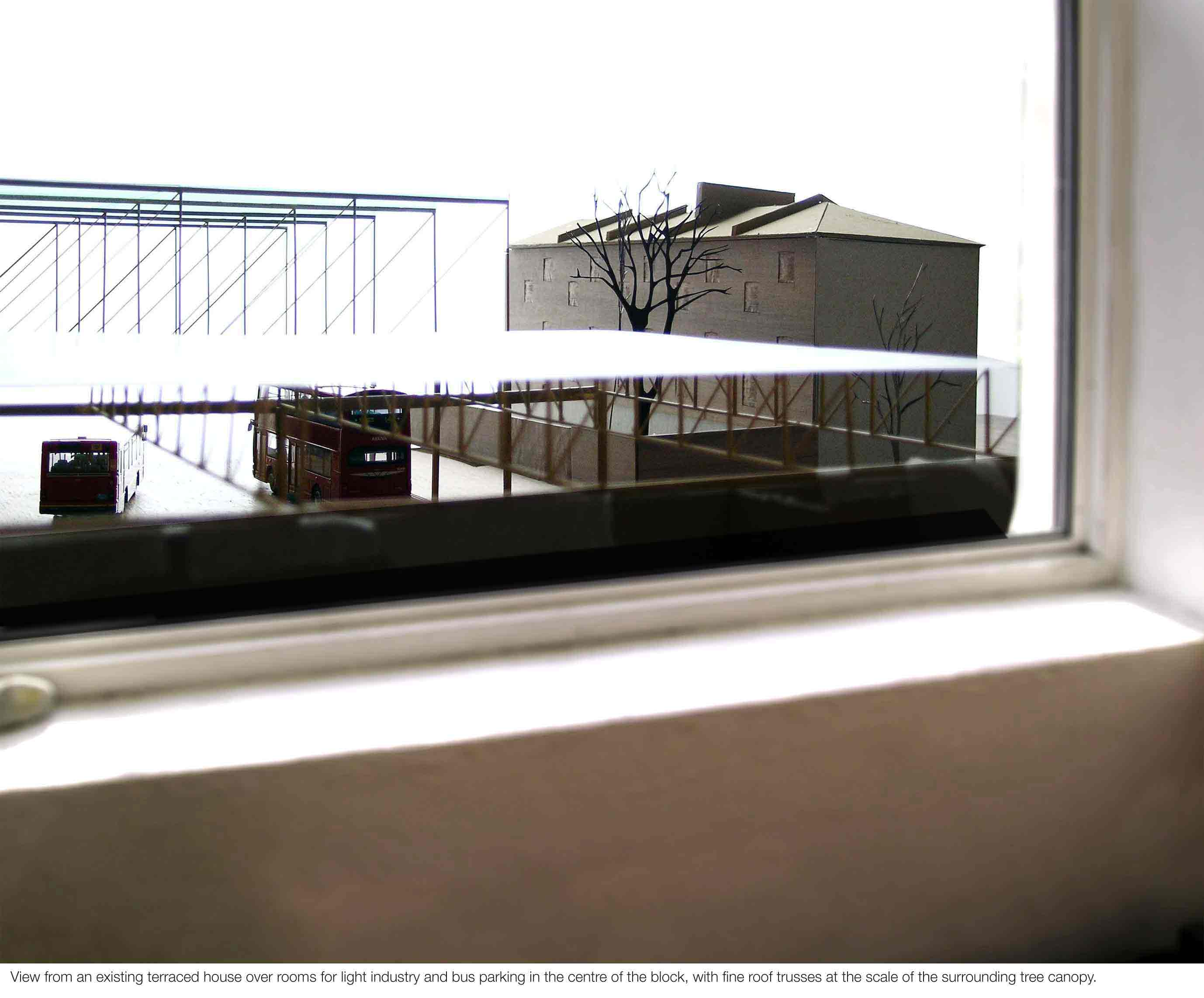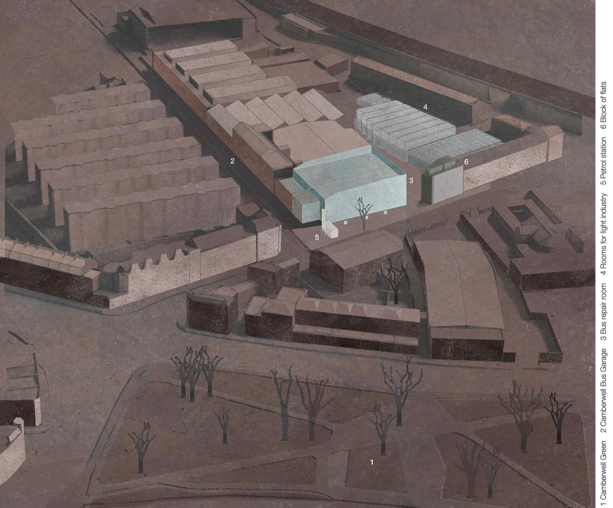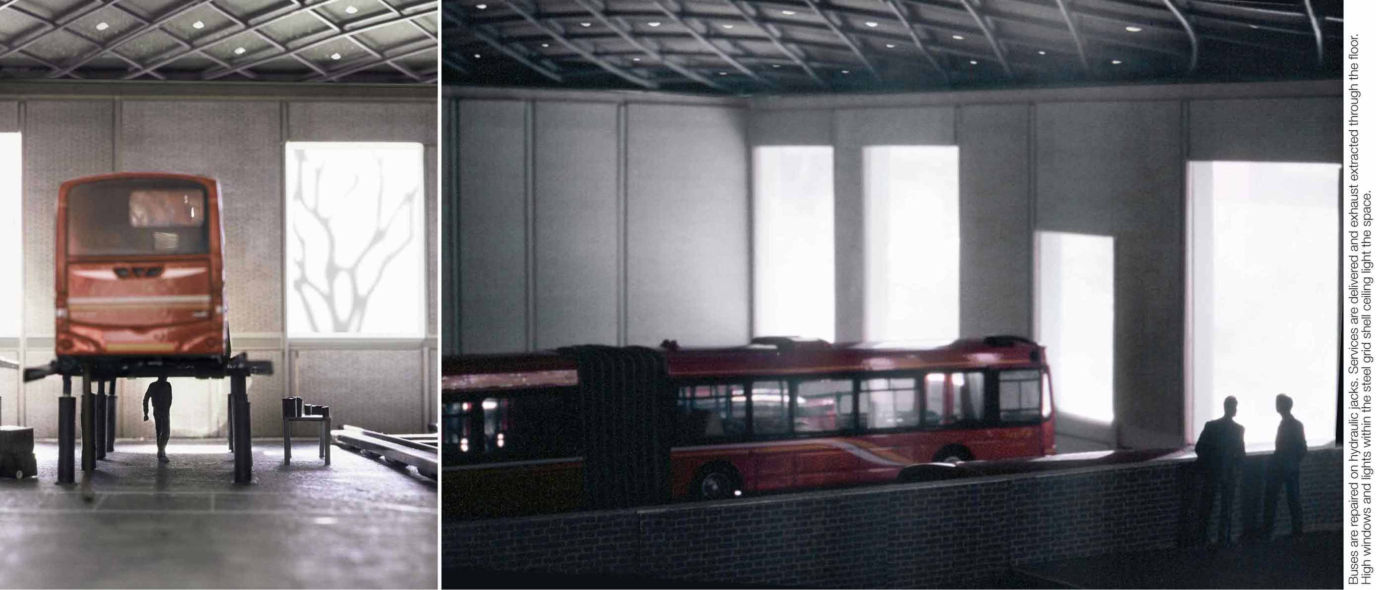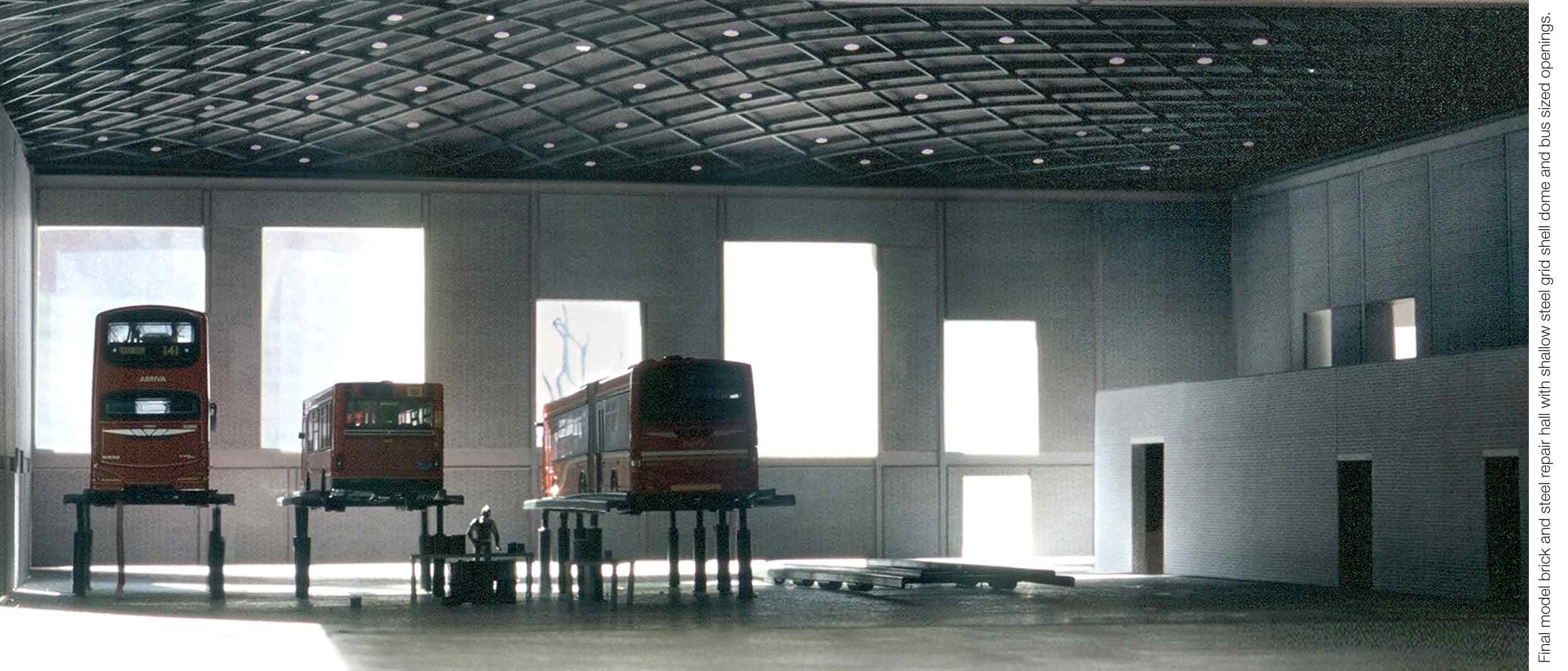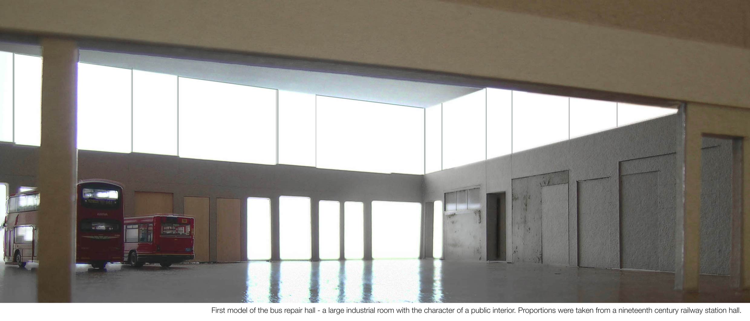 Camberwell Bus Garage Part 2 Project 2005 Emily Greeves London Metropolitan University | UK Designs for Camberwell Bus Garage seek out particular architectural qualities that might give industry a more stable and valued presence in London, against a context of rapid displacement. Industrial rooms with a canopy of fine trusses fit beside garden walls of terraced houses behind the garage. A petrol station and block of houses share public spaces in front. A bus repair room on the high street is given the character and proportions of a public hall. It celebrates the spectacle of a room filled with buses - lifted up for servicing, they appear behind the windows at unexpected heights. Industy in the City was the subject of the design research programme this year. How might industry have a civic presence and offer vitality to a public space? Emily’s research about vanishing industries in inner city London is outstanding. She has designed a small portfolio of urban repair projects at the Camberwell Bus Garage, near Camberwell Green. The design of the Repair Hall shows a refined imagination and a precision of judgement. It has a firm public presence in Camberwell. The design of the interior of this hall with its large windows is similarly well developed. Its steel and brick wall structure inside and out, and shallow dome has a remarkable dignity for a bus garage, reminiscent of the direct and generous quality of a Wren church.