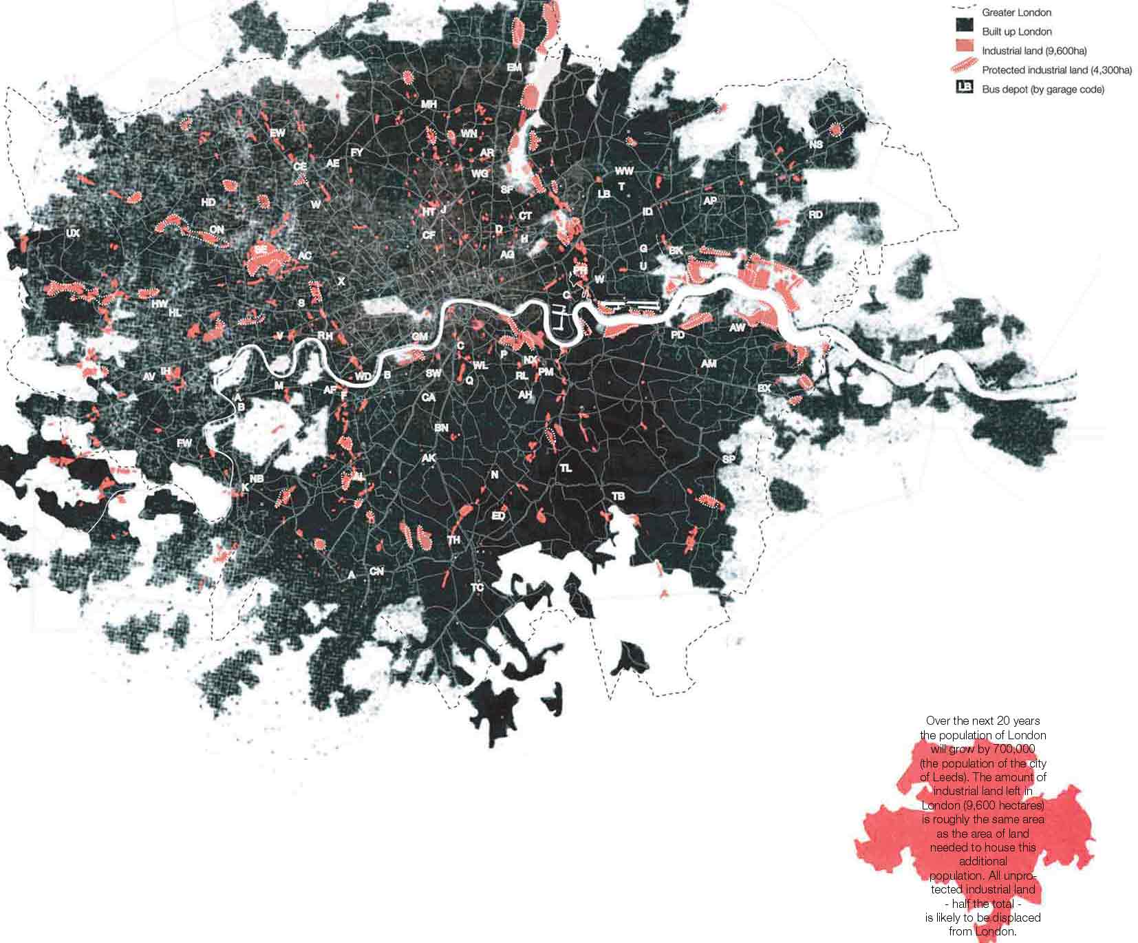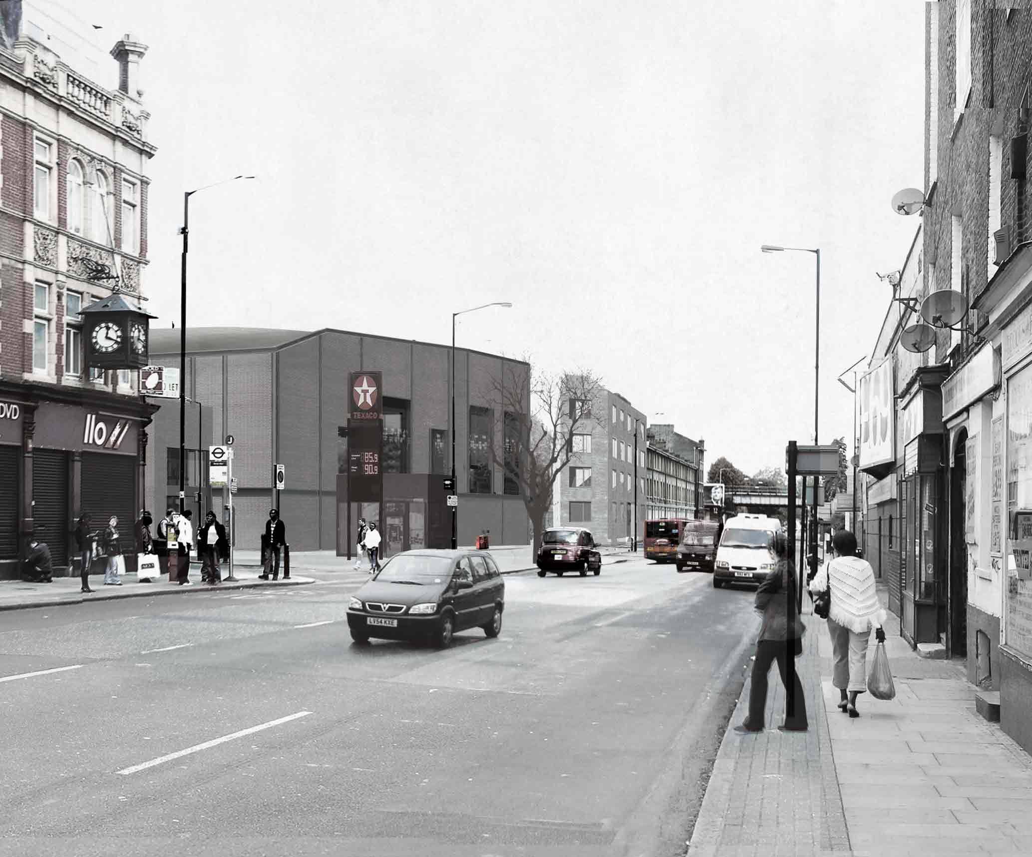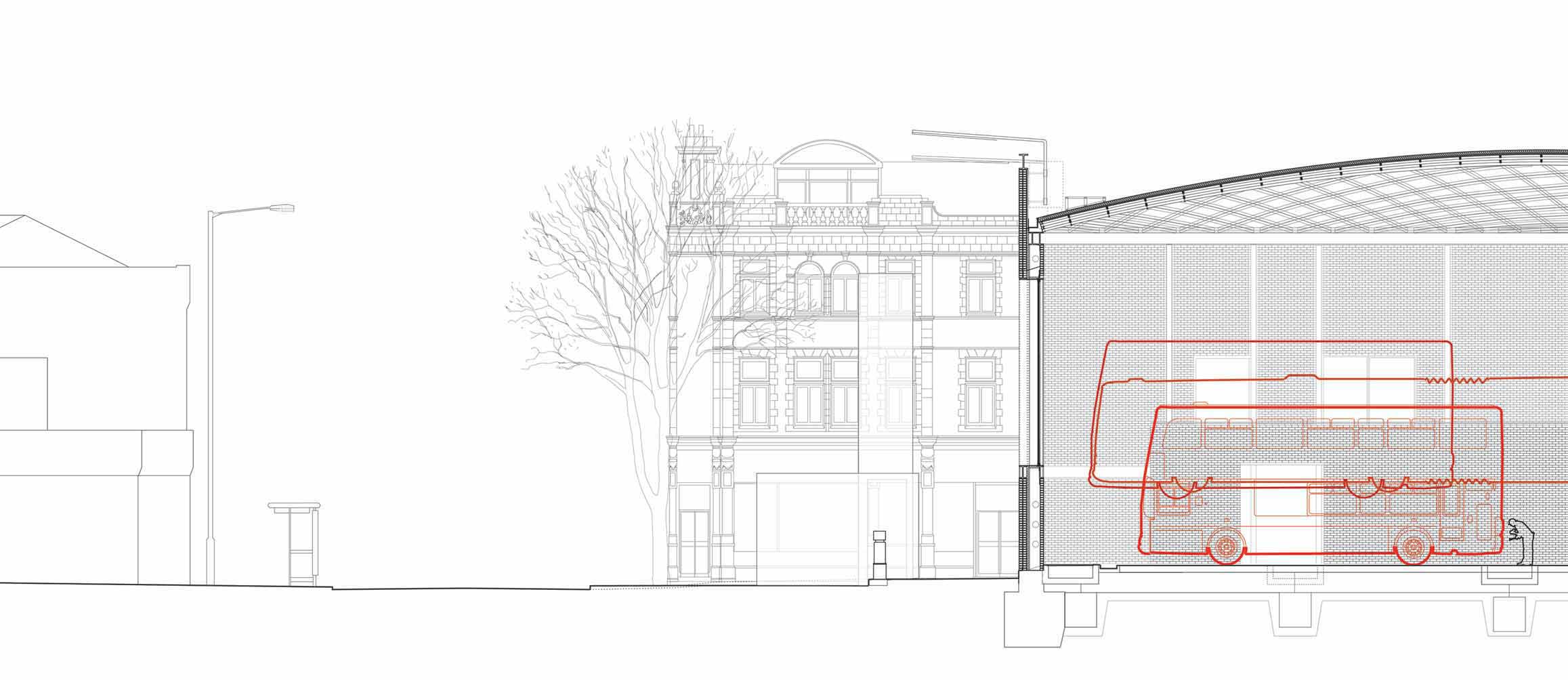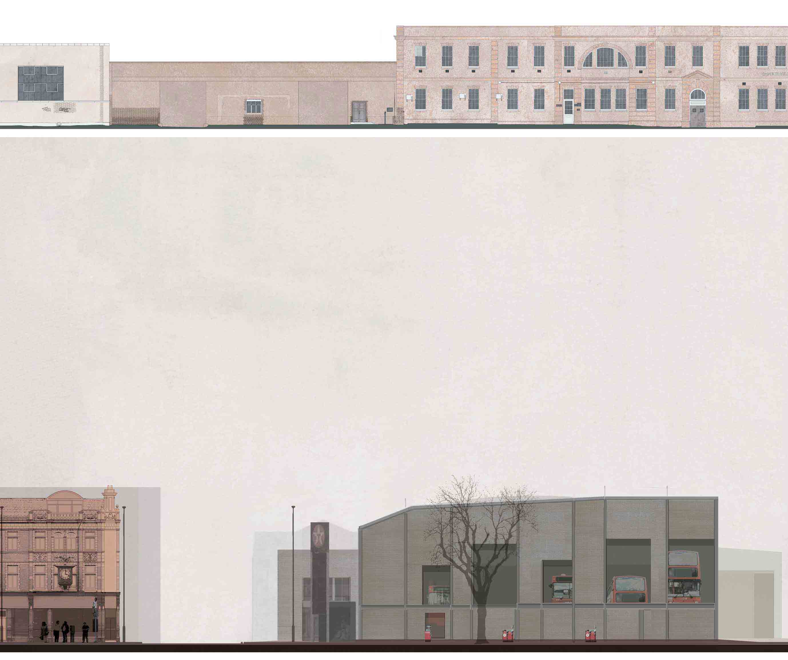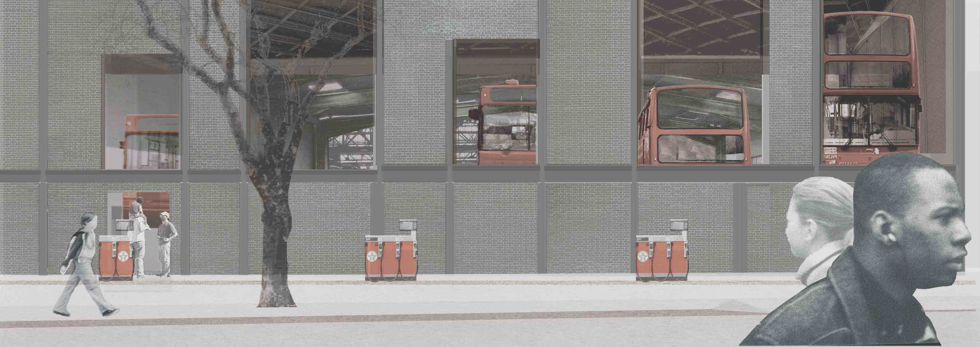 Camberwell Bus Garage Part 2 Project 2005 Emily Greeves London Metropolitan University | UK Designs for Camberwell Bus Garage seek out particular architectural qualities that might give industry a more stable and valued presence in London, against a context of rapid displacement. Industrial rooms with a canopy of fine trusses fit beside garden walls of terraced houses behind the garage. A petrol station and block of houses share public spaces in front. A bus repair room on the high street is given the character and proportions of a public hall. It celebrates the spectacle of a room filled with buses - lifted up for servicing, they appear behind the windows at unexpected heights. Industy in the City was the subject of the design research programme this year. How might industry have a civic presence and offer vitality to a public space? Emily’s research about vanishing industries in inner city London is outstanding. She has designed a small portfolio of urban repair projects at the Camberwell Bus Garage, near Camberwell Green. The design of the Repair Hall shows a refined imagination and a precision of judgement. It has a firm public presence in Camberwell. The design of the interior of this hall with its large windows is similarly well developed. Its steel and brick wall structure inside and out, and shallow dome has a remarkable dignity for a bus garage, reminiscent of the direct and generous quality of a Wren church.