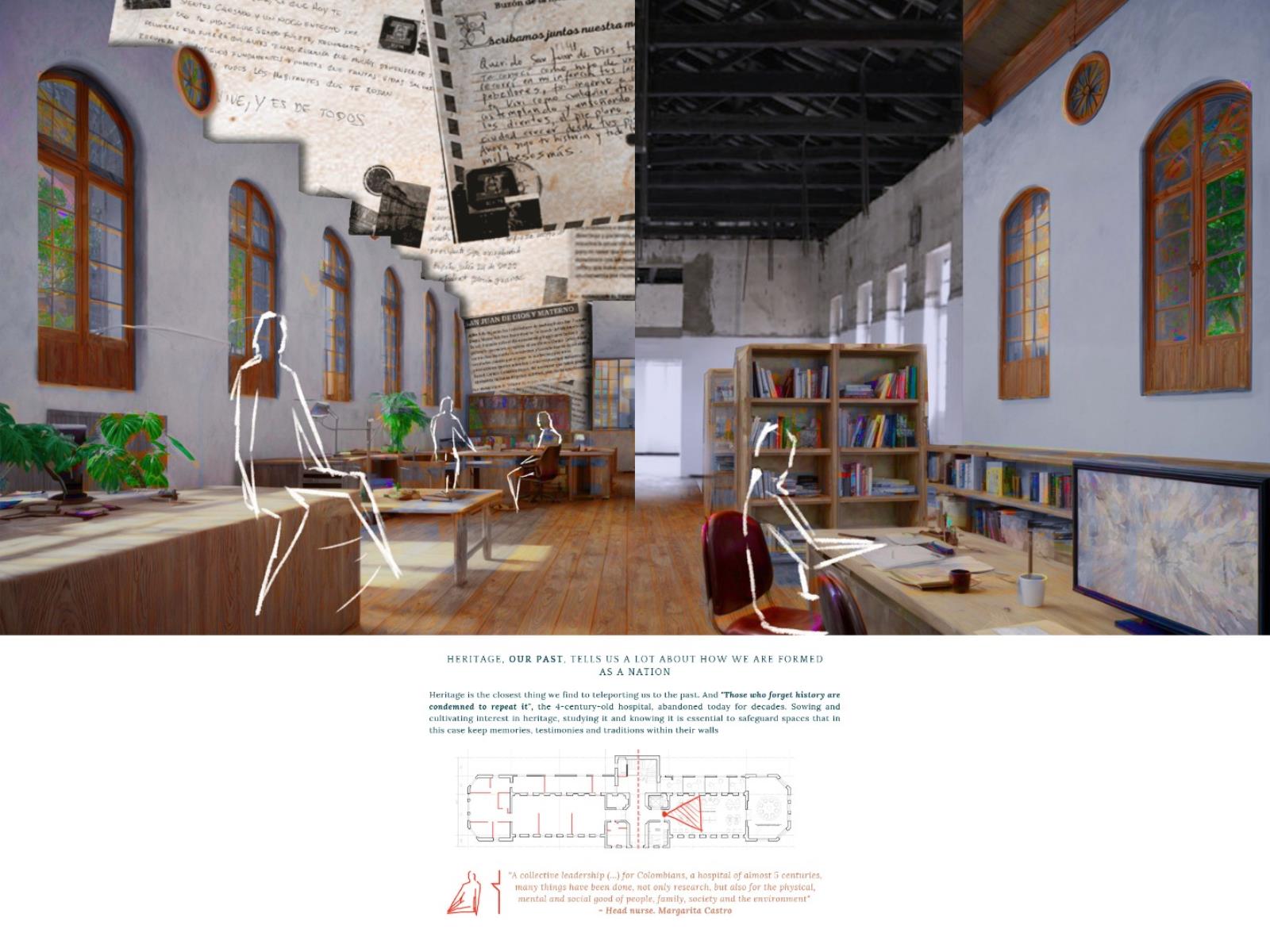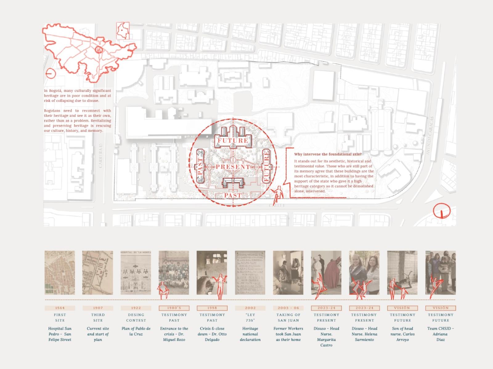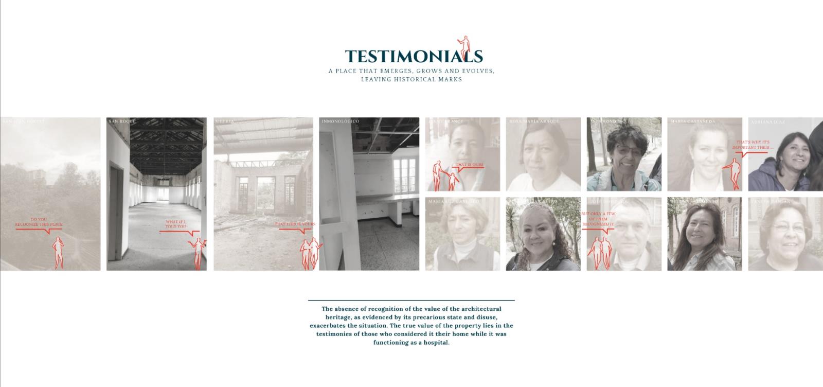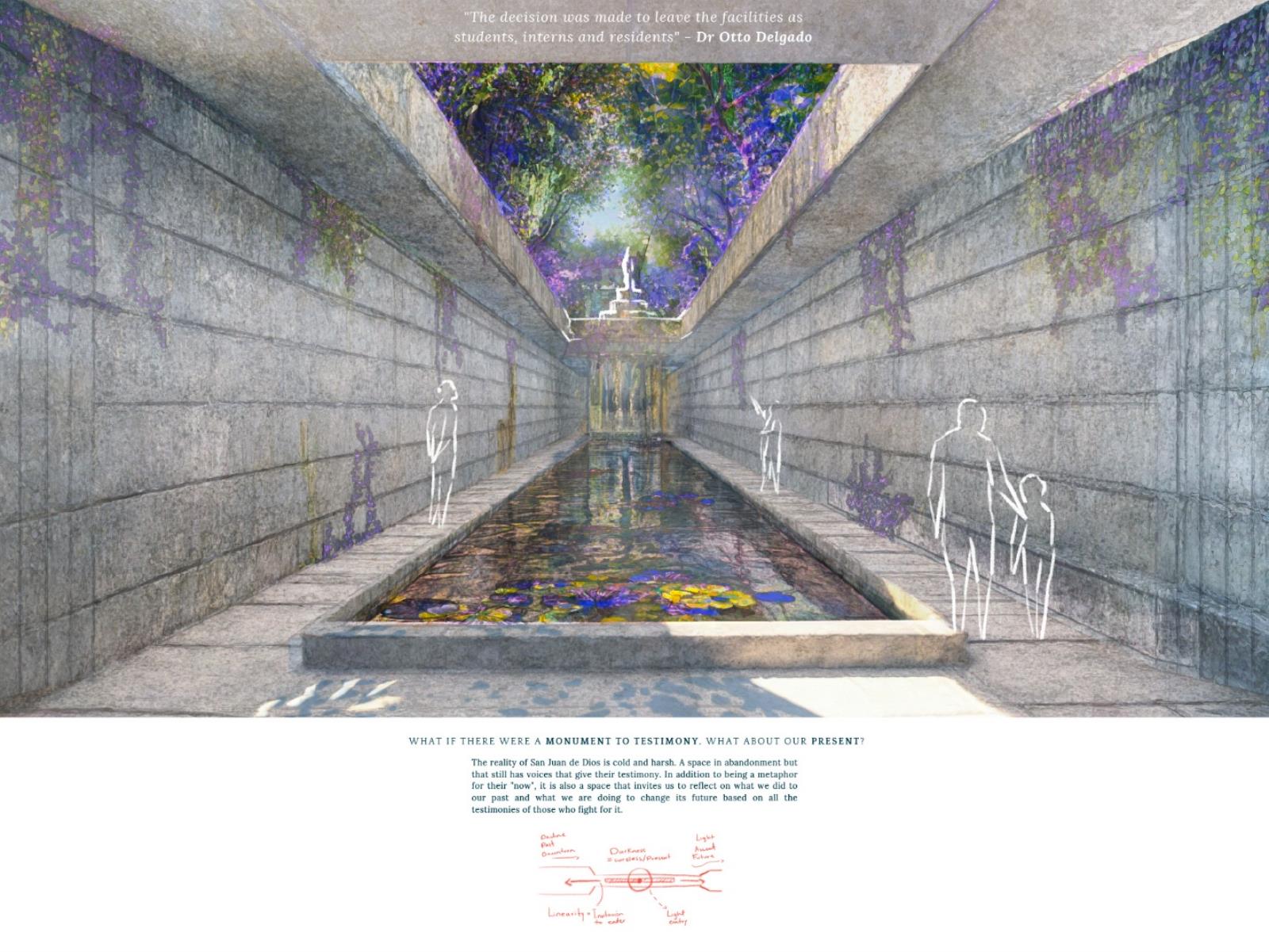 Testimonials: A Place that Emerges, Grows and Evolves, Leaving Historical Marks Part 2 Dissertation 2024 Valentina Mosos Vargas Pilot University of Colombia Bogota | Colombia Testimonials project aims to rescue the essence of the San Juan de Dios Hospital, with 459 years of history, but which closed its operations 25 years ago. The proposal is proposed under the concept of ""Adaptive Reuse"", which includes the opening of new public spaces, the preservation of the historic medicinal forest, the restoration of 4 buildings and the creation of a monument to testimony.The intervention originates from the testimonial investigation of people linked to the hospital, which serve as a narrative to build a comprehensive and sensitive project. Testimonial memory is considered intangible heritage that adds value and meaning to the architectural heritage, which is why it is proposed as a design means to evoke the history and essence of the old hospital. The Memory Center will be dedicated to studying the past, reflecting on the present and projecting the national architectural heritage into the future.This research opens a debate about heritage in Bogotá and its management, suggesting an intervention that allows heritage to be resilient and evolve with the city, guided by those whot inhabited it and still recognize it as part of their history and tradition. Tutor(s) Natalia del Pilar Correal Avilán