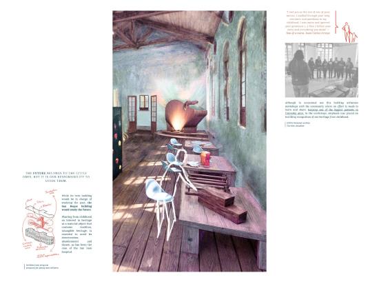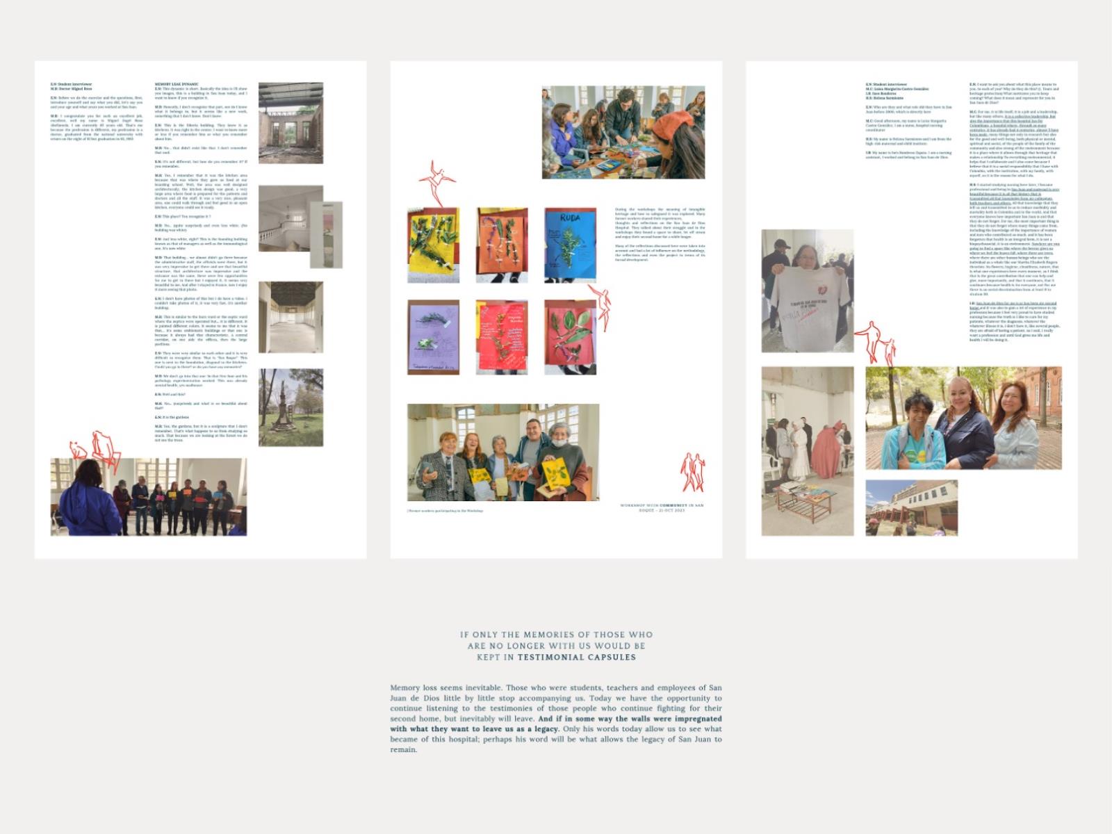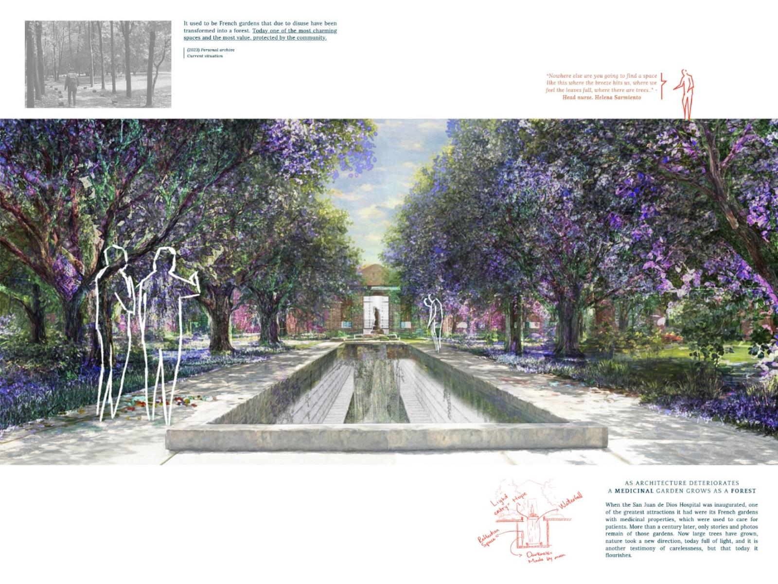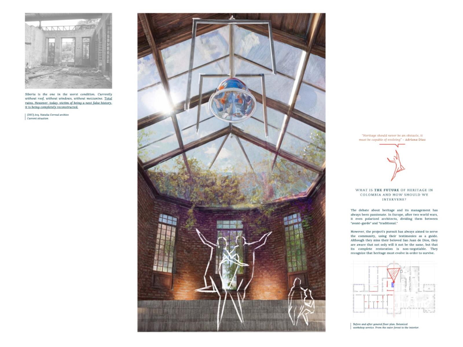 Testimonials: A Place that Emerges, Grows and Evolves, Leaving Historical Marks Part 2 Dissertation 2024 Valentina Mosos Vargas Pilot University of Colombia Bogota | Colombia Testimonials project aims to rescue the essence of the San Juan de Dios Hospital, with 459 years of history, but which closed its operations 25 years ago. The proposal is proposed under the concept of ""Adaptive Reuse"", which includes the opening of new public spaces, the preservation of the historic medicinal forest, the restoration of 4 buildings and the creation of a monument to testimony.The intervention originates from the testimonial investigation of people linked to the hospital, which serve as a narrative to build a comprehensive and sensitive project. Testimonial memory is considered intangible heritage that adds value and meaning to the architectural heritage, which is why it is proposed as a design means to evoke the history and essence of the old hospital. The Memory Center will be dedicated to studying the past, reflecting on the present and projecting the national architectural heritage into the future.This research opens a debate about heritage in Bogotá and its management, suggesting an intervention that allows heritage to be resilient and evolve with the city, guided by those whot inhabited it and still recognize it as part of their history and tradition. Tutor(s) Natalia del Pilar Correal Avilán