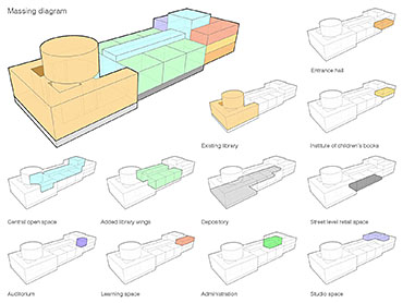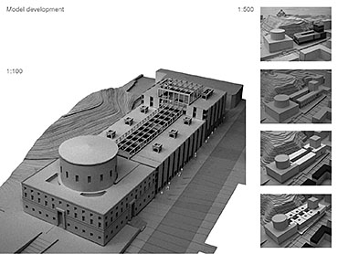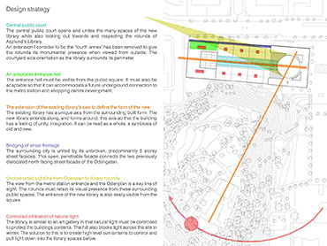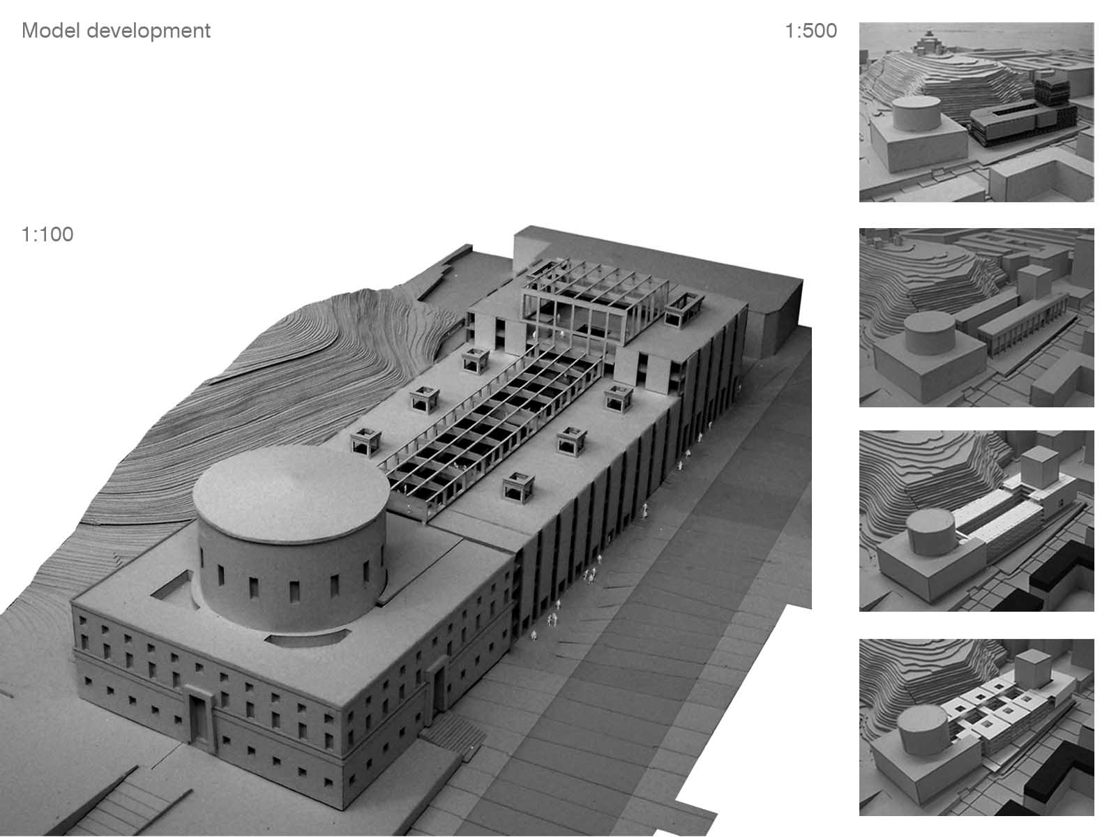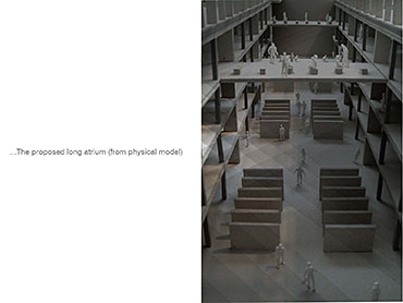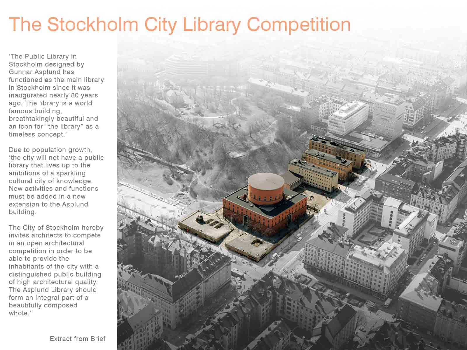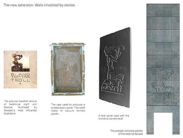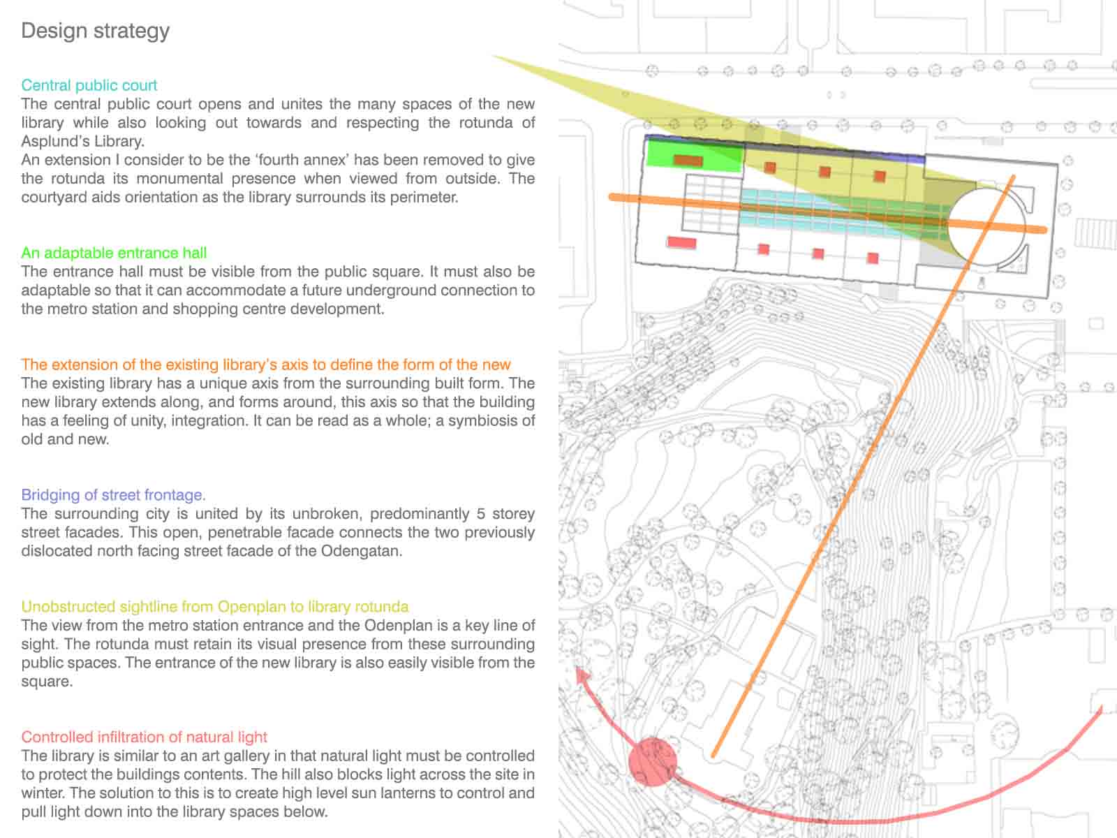 Proposal for an addition to the Stockholm Public Library Part 1 Project 2007 Christopher Drummond Robert Gordon University | UK The Stockholm library extension expands upon the concepts of procession, walls inhabited with stories and the ‘Temple of knowledge’ of Asplund’s original design. The extension respects the existing by joining with it strongly - creating a symbiosis between old and new and challenging the notion of “touching the building lightly”.The long atrium continues Asplund’s processional route and introduces another key space imbued with awe, capacity for knowledge and monumental scale. The extension’s walls, which celebrate illustrations of Swedish folklore and also hark back to the original library’s Egyptian theme, transmit their stories like the pages of a book. This student presents a design that responds well to the challenges of an extremely complex design brief. The level of detailed resolution is mature and thorough, drawing comparison from Asplunds existing building, its heritage and Swedish literary culture. The design is explored at a variety of scale from the urban thru the immediacy of its external elevations to the point of the user in an intimate examination of key internal spaces.