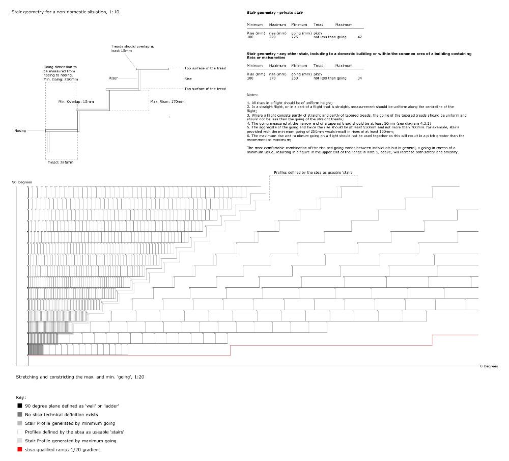 Tom’s study of the Scottish Building Standards identifies a minimal content common to all building; regulation requires building to limit the threat it poses our health and safety, limits and threat which are indexed in every building through its compliance. Regulation 4.3.2 limits public and private stair geometry - every stair tread indexes the range of our safe and comfortable gait, in a given circumstance.