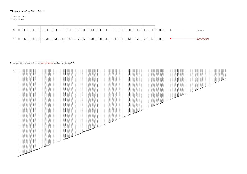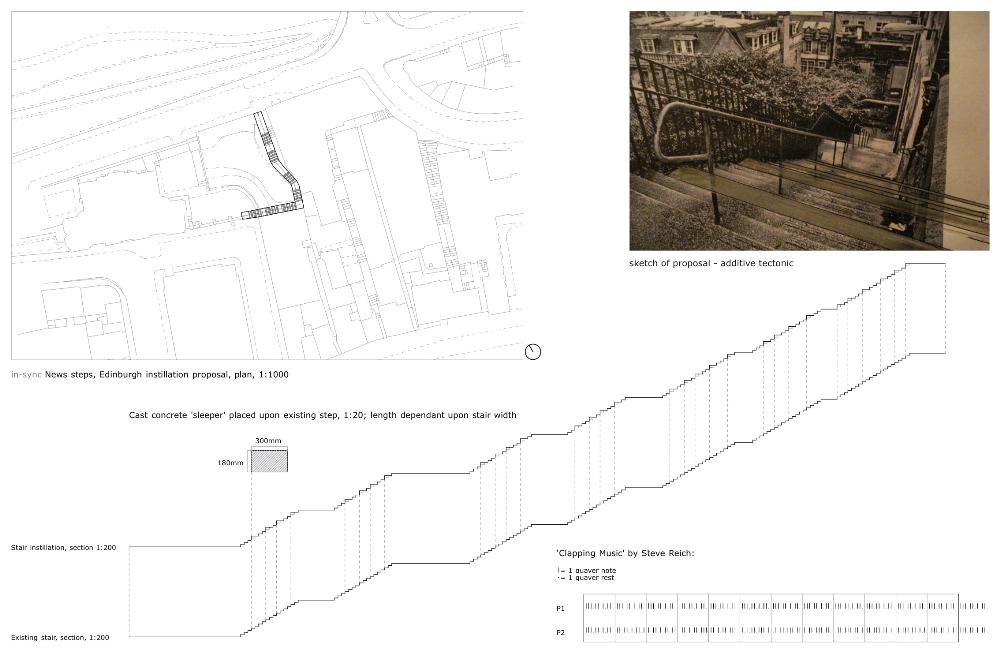 The ‘in-sync’ steel stair, a public route of passage , is inspired by the Minimalist music of Steve Reich and a proposal for the News Steps site in Edinburgh Old Town. The stair consists of six equal flights (orientated North – South) and one irregular flight (orientated East – West). A regular syncopation of three single steps broken by a double-step ‘landing’ is maintained throughout experience of the stair. In contrast to this a set of private, irregular stairs (a parallel echo to the public stair in plan) allow circulation between three residential duplex units and a basement workshop and small ground floor apartment. These private, ‘out-of-sync’ stairs are constructed from concrete and inspired by the work of performance artist Bruce Naumann and a proposal for a landscape stair climbing the slopes of Arthur's Seat.
