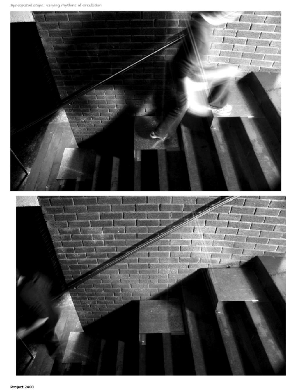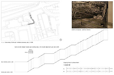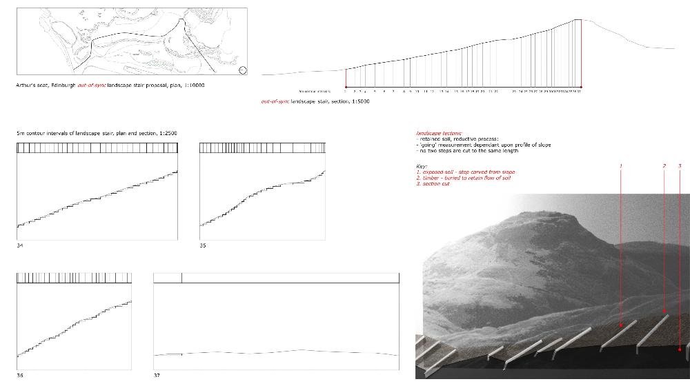 Two proposals for new public stairs in Edinburgh enjoy this communicative limit. 'New News Steps' enjoys the stair as a prescriptive device, creating a syncopated rhythmic effect for two stair-climbers. 'Steps for Arthur’s Seat' enjoys the stair as an inscriptive devise, taking a measure of Edinburgh’s volcanic landscape by writing a stair across it.