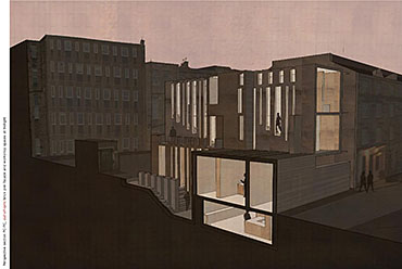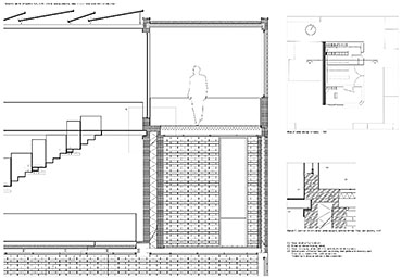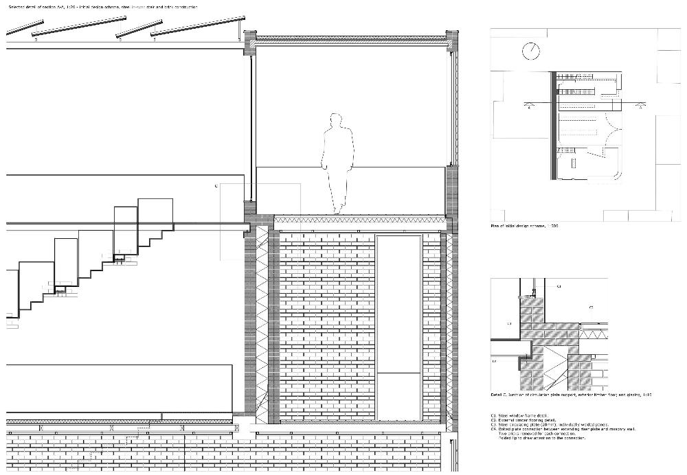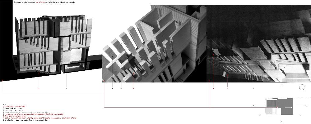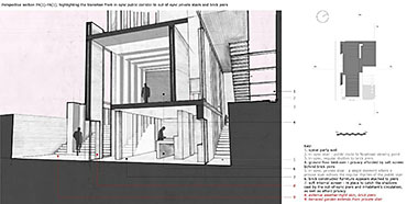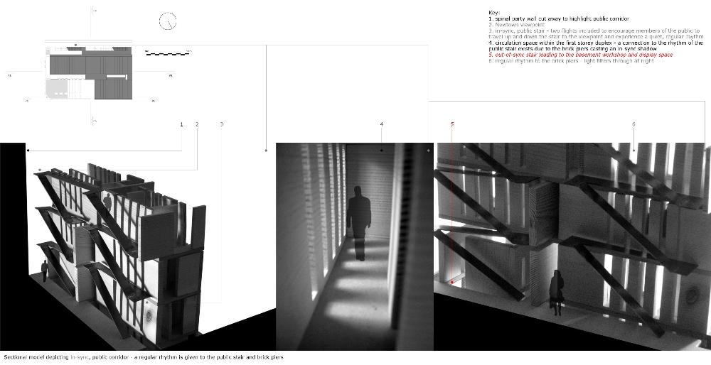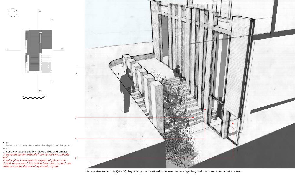A public steel stair, consisting of 156 steps and based upon the module of a standard brick, is placed on the site providing circulation around, and through, a vertical brick landscape. Together with the party wall, structural brick piers extend upwards through the site, thus supporting floor plates and allowing the creation of kitchen, bedroom and living spaces via ‘excavation’.