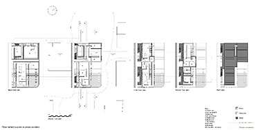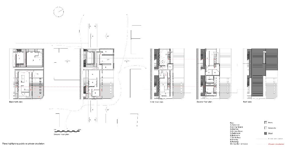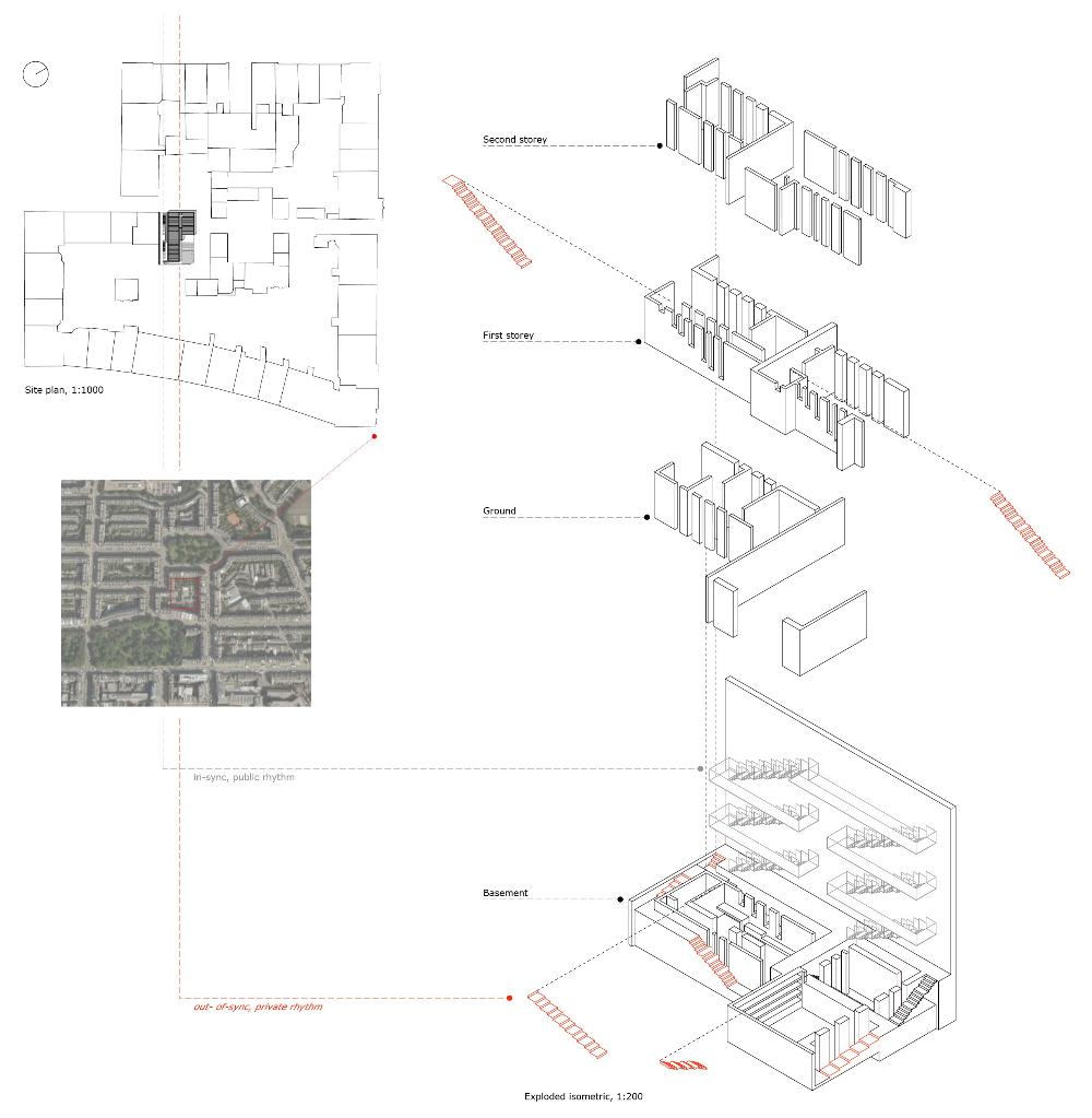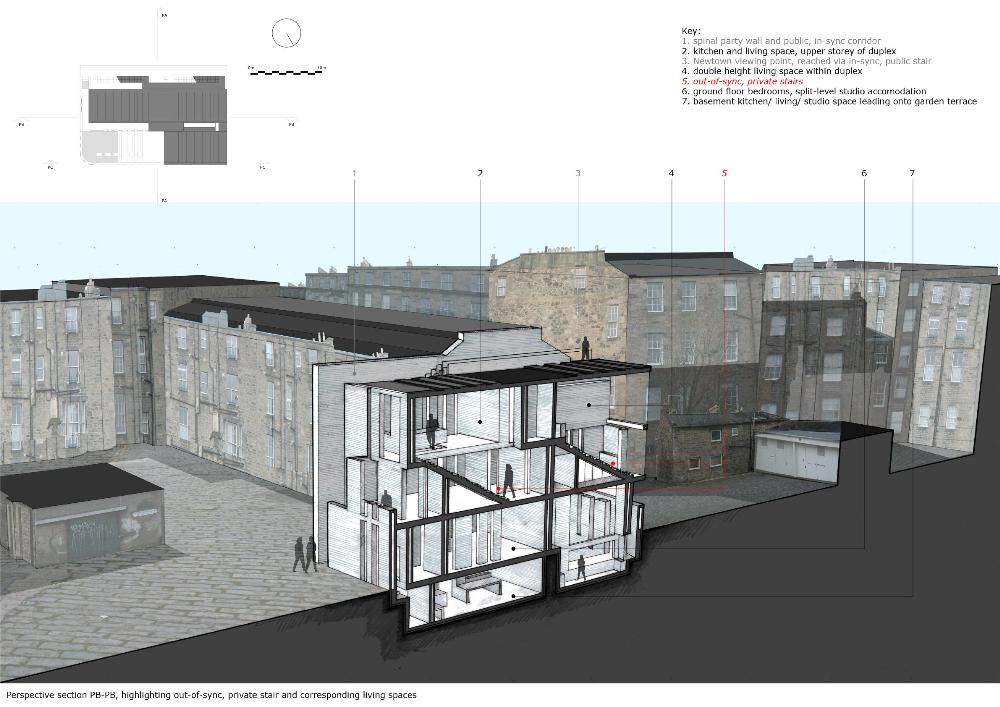 Circulation to each property demands an interaction with the ‘spinal’ party wall and structural brick piers. The inhabitants are intended to experience a subtle syncopation and movement out of, and back into, phase as they circulate through combinations of private and public spaces. A focus upon the experience of circulation as extraordinary, and possible of generating multiple readings of a single space and everyday condition, is implemented via the manipulation of the Scottish Building Regulations regarding stair construction.