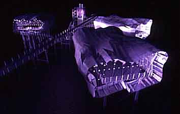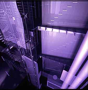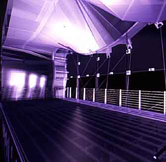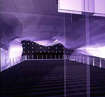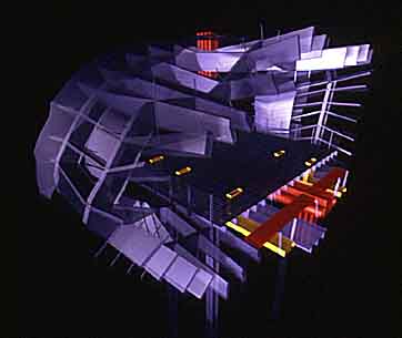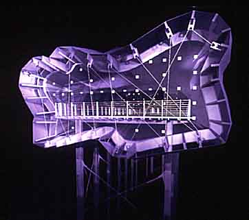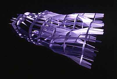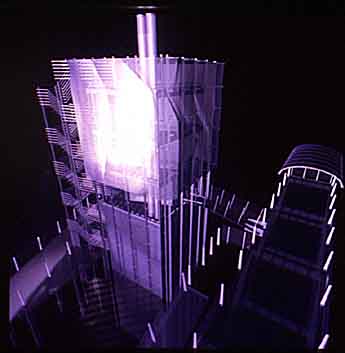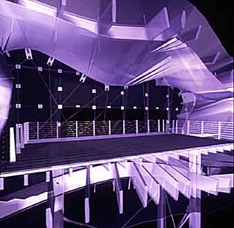 This realisation was used to create a new type of theatre. The structure itself can be thought of in terms of a hydraulic-tensile from, that in a pre-programmed way can reform, mould, bend and deform itself as though it was participating in an intelligent dialogue with the conditions that surround it. A tensile fabric is stretched around the structural framework, and kept separate from the framework by a collection of hydraulic units allowing the structure to re-present itself differently. Networking the hydraulic elements together, then allows a piece of software to drive the configuration of the new architectural envelope, and gives rise to the performer being able to entirely re-configure the space from moment to moment as a means of extending the capabilities of their dance.