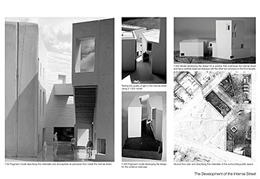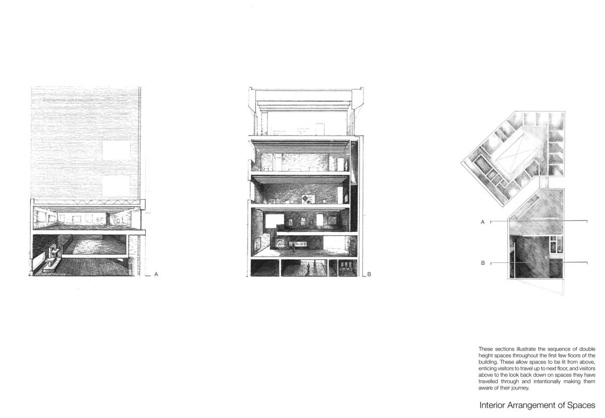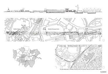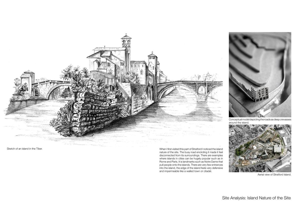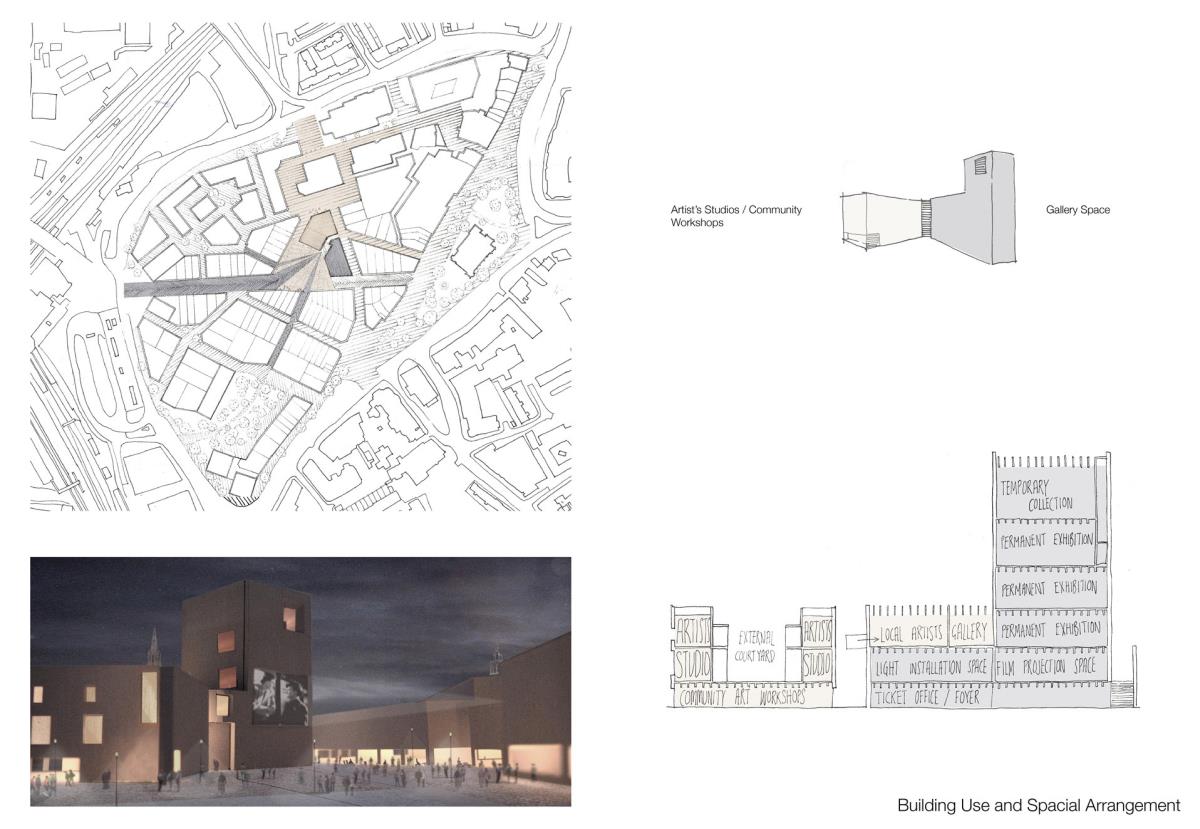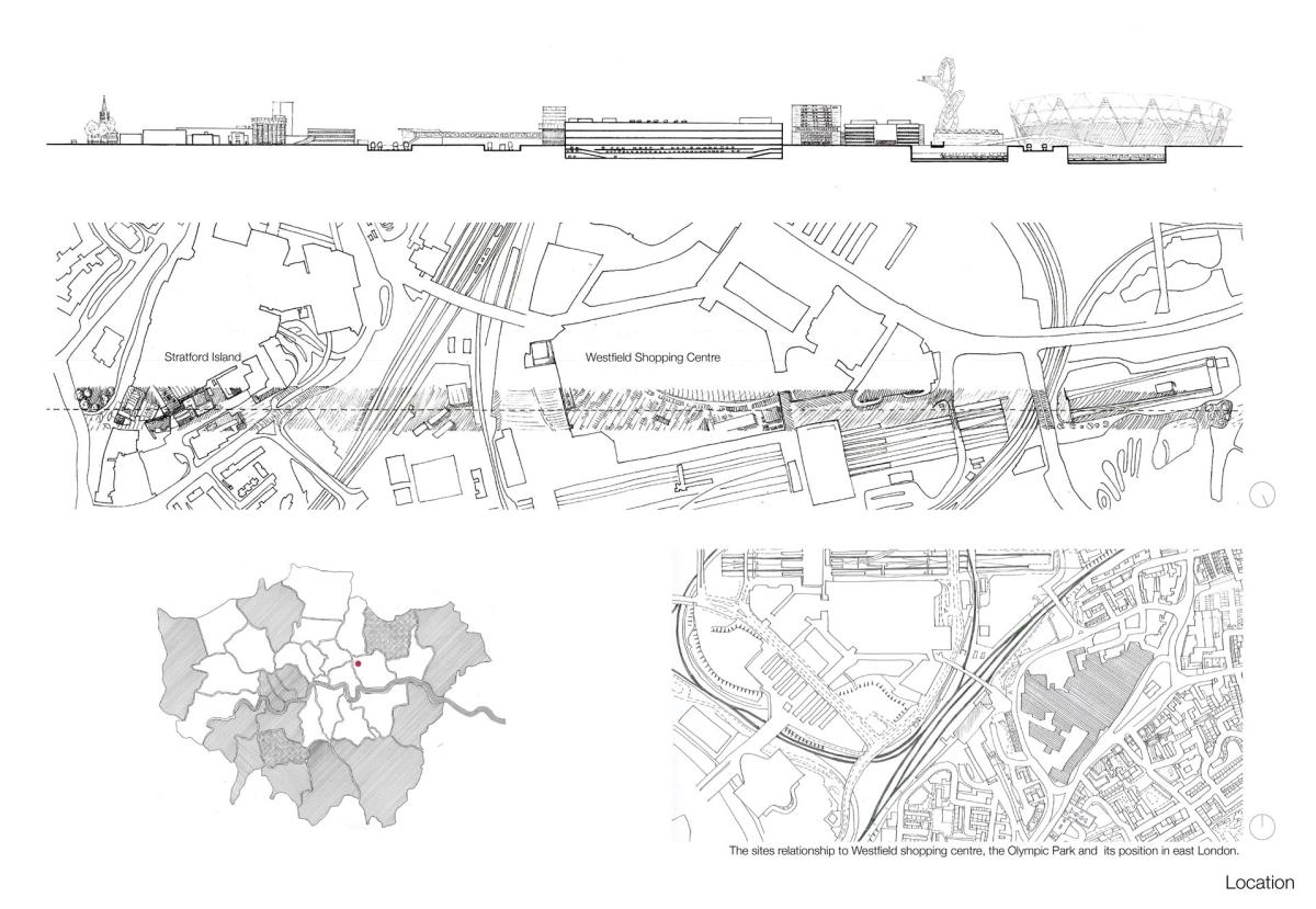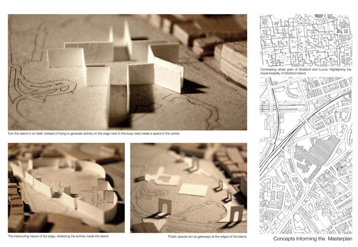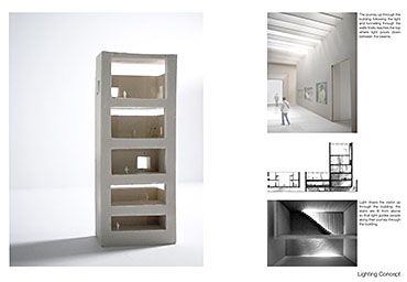 A Beacon for Stratford Island Part 1 Project 2013 Araminta Sainsbury University of Cambridge | UK A 1960’s gyratory road system intended to improve connections across London has confined an area of Stratford, preventing it from expanding and isolating it from its immediate surroundings. The master plan attempts to celebrate this island nature, harbouring activity in the centre of the site whilst strengthening the gateway points onto the island. The dense mass of buildings that currently exists is opened up allowing for a hierarchy of routes and connections to permeate across the island. The Arts Centre acts as a marker for the public space in the centre of the island. Its height gives the building prominence and draws visitors over from the station as well as inviting in the local communities from Stratford. Providing space for a variety of users informed the decision for the physical separation of the gallery and the community studios. The monolithic precast concrete facades give prominence to the entrance and act as a backdrop for activity in the public space that addresses the building. A change in materiality defines the front elevation from the rest of the brick walls. An internal street divides the Arts Centre and provides the entrances to the gallery spaces, café, gift shop, community workshops and artists’ studios. Imagining how people would move between the sequences of gallery spaces informed the design. Light draws visitors along their journey up through the tower. They enter into a darker space at ground level but gradually climb up the tower between rooms that increase in height and luminosity. The rhythm of the exposed concrete roof beams remains constant throughout the building, which emphasises the arrival at the top room where light pours down between the deep beams giving the impression that the top of the building has been peeled off. The stairs are embedded in the walls, tunnelling through the mass of the building towards the lighter space above. Tutor(s) Nikolai Delvendahl Eric Martin