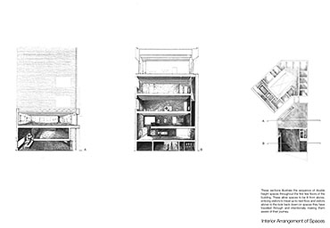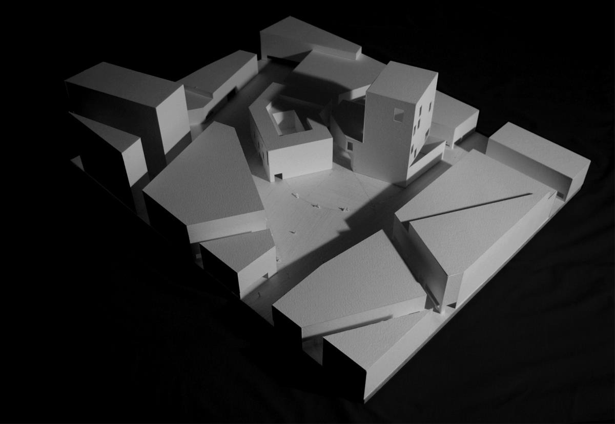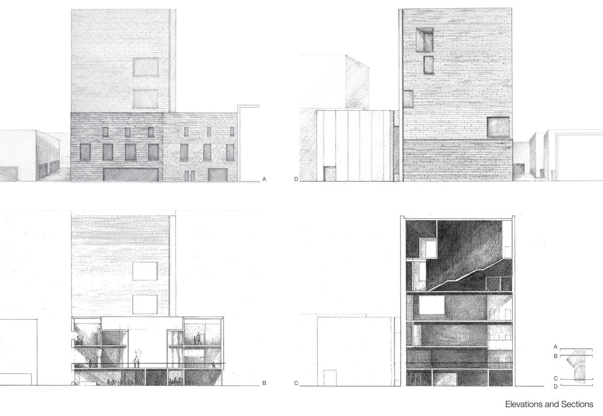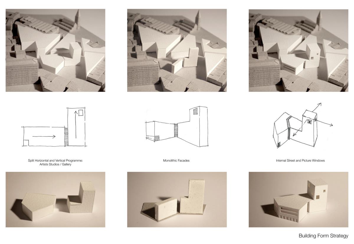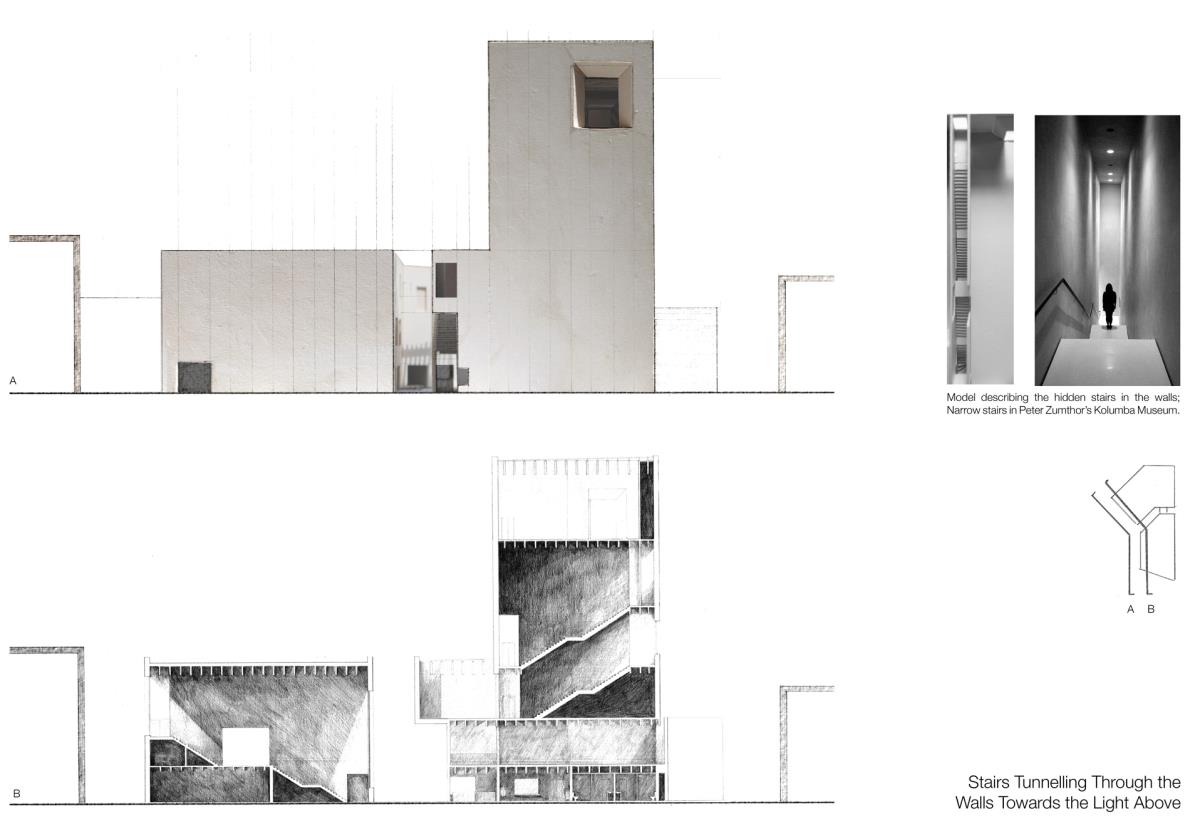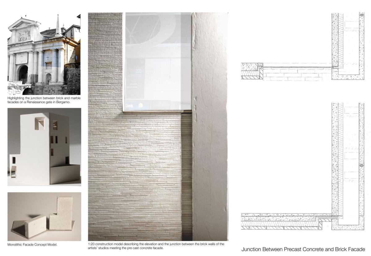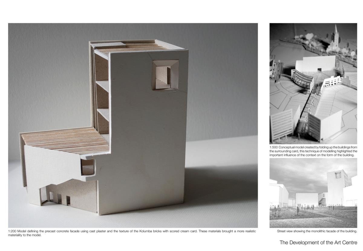 A Beacon for Stratford Island Part 1 Project 2013 Araminta Sainsbury University of Cambridge | UK A 1960’s gyratory road system intended to improve connections across London has confined an area of Stratford, preventing it from expanding and isolating it from its immediate surroundings. The master plan attempts to celebrate this island nature, harbouring activity in the centre of the site whilst strengthening the gateway points onto the island. The dense mass of buildings that currently exists is opened up allowing for a hierarchy of routes and connections to permeate across the island. The Arts Centre acts as a marker for the public space in the centre of the island. Its height gives the building prominence and draws visitors over from the station as well as inviting in the local communities from Stratford. Providing space for a variety of users informed the decision for the physical separation of the gallery and the community studios. The monolithic precast concrete facades give prominence to the entrance and act as a backdrop for activity in the public space that addresses the building. A change in materiality defines the front elevation from the rest of the brick walls. An internal street divides the Arts Centre and provides the entrances to the gallery spaces, café, gift shop, community workshops and artists’ studios. Imagining how people would move between the sequences of gallery spaces informed the design. Light draws visitors along their journey up through the tower. They enter into a darker space at ground level but gradually climb up the tower between rooms that increase in height and luminosity. The rhythm of the exposed concrete roof beams remains constant throughout the building, which emphasises the arrival at the top room where light pours down between the deep beams giving the impression that the top of the building has been peeled off. The stairs are embedded in the walls, tunnelling through the mass of the building towards the lighter space above. Tutor(s) Nikolai Delvendahl Eric Martin