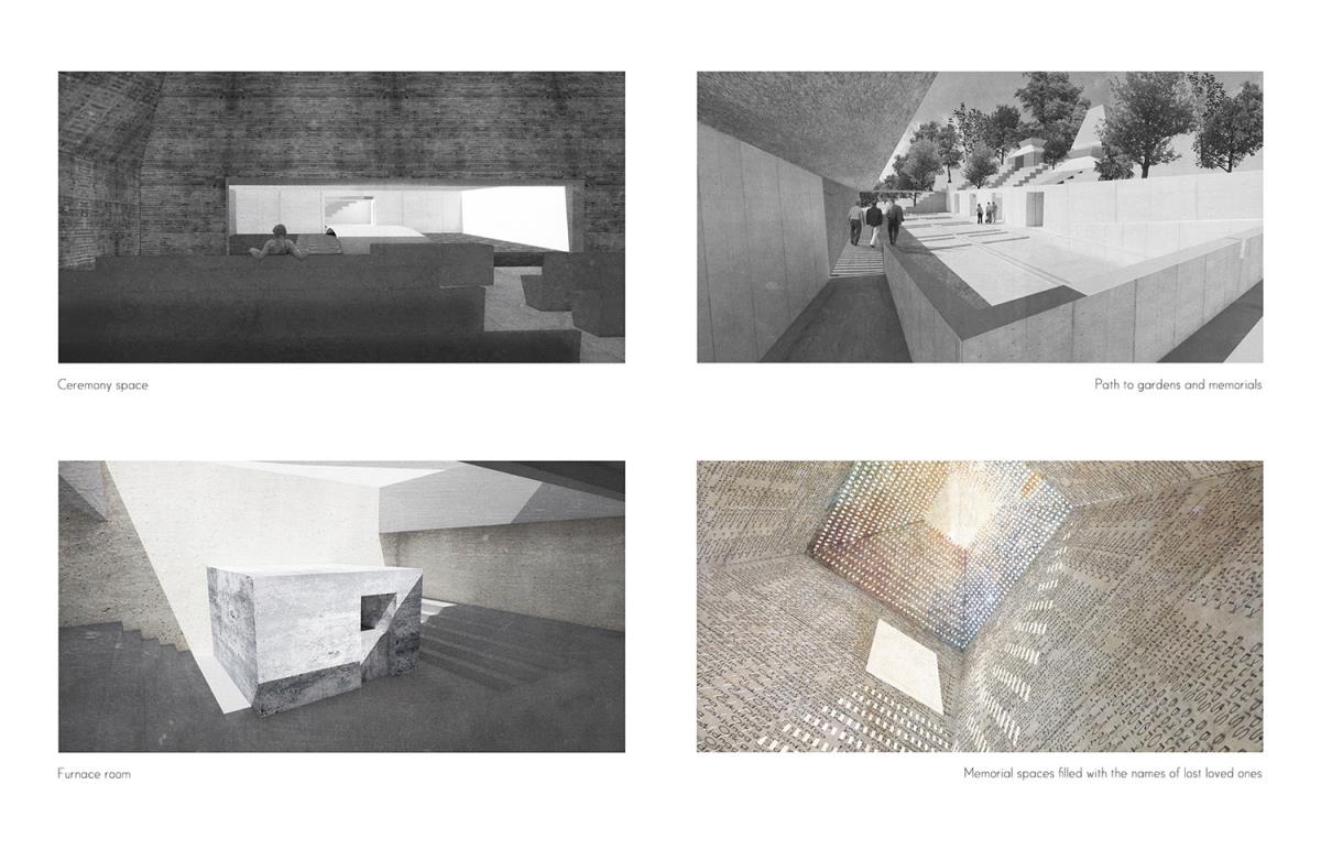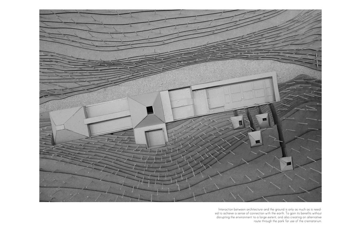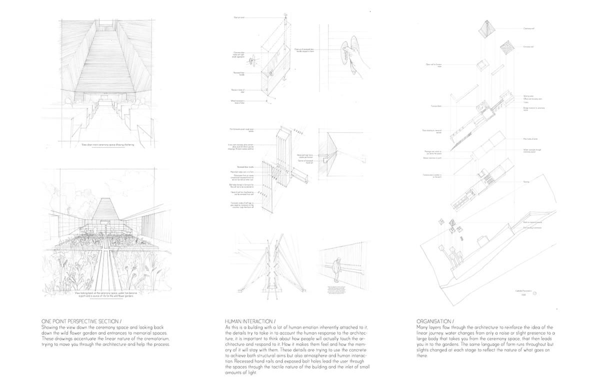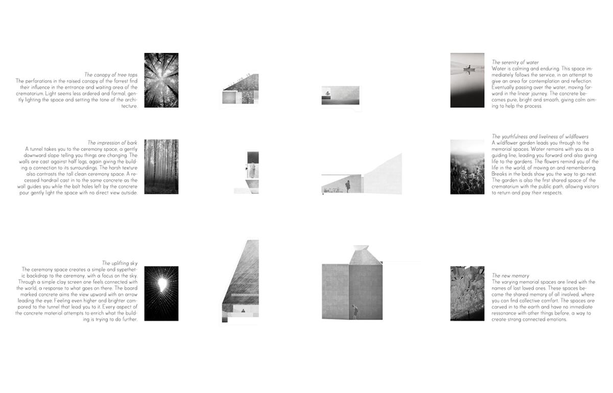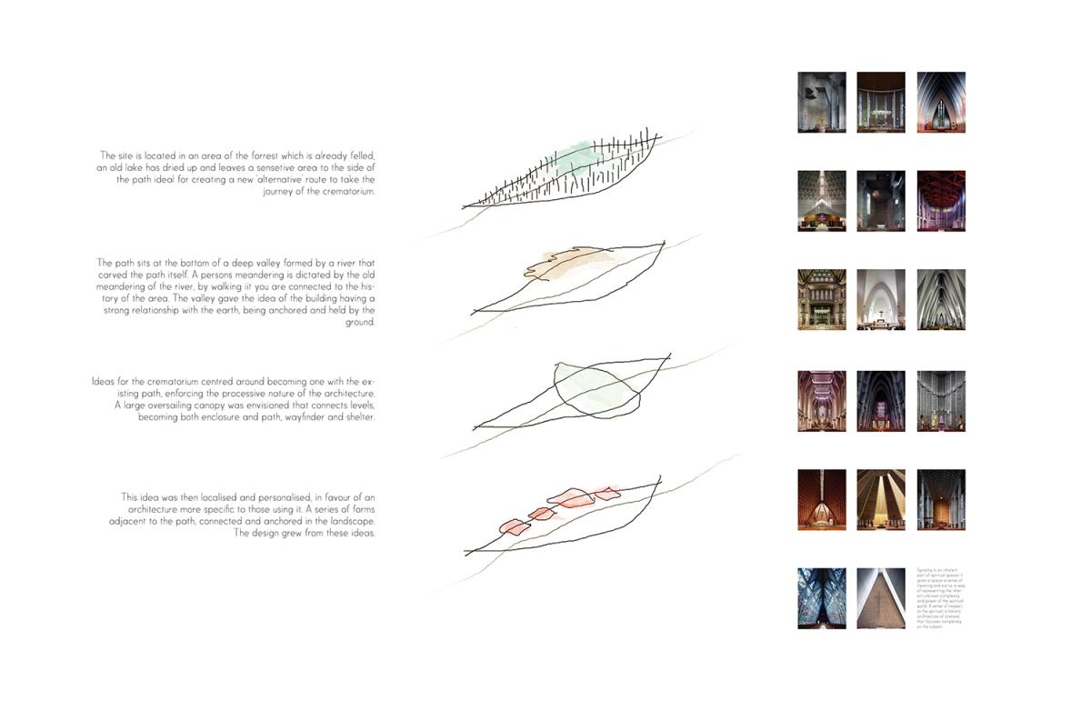 The Remembrance of Things Past Part 1 Project 2013 Tony Lees University of Liverpool | UK “In the same way as in art and literature, but in a less easily ignored way, architecture contributes to our collective memory”, Adam Caruso.There is an unavoidable dialogue between building and place. The crematorium fully absorbs its purpose and context, allowing it to inform the essence of its architecture, and vibrates with the history of all those that made the journey before, helping to create genuine and lasting memories. A single linear process guiding you through the architecture parallels the different stages of life, grieving, memory and the crematorium itself. The journey of the path and its sense of progression becomes a metaphor for the whole project. Enhanced through sensual stimulation, water guides you on the journey, first through sound, then through sight, then as a guiding path giving life to a vibrant garden of wild flowers revealing entrances to memorial spaces. Traces of those before you and the world around you are imprinted upon the building, creating a deep sense of oneness in this intervention reinforcing a worldly connection with the earth and things primitive. It is an open air space occupying a site sensitive to an existing route; merely becoming a temporary meander from the usual treaded path. Eventually you re-join the path that is Otterspool Park and continue onwards, not looking back, but looking forward with the memory of those dear to you.The building finds its being in the existence of the forest. How can a material interact emotionally with a human being? The impersonal nature of concrete takes on a familiarity and atmospheric quality that conjures up memories and emotions of the past by taking on textures, plays of light, shadows, and smells of the forest around it, all of a more personal and base human connection. Like chiaroscuro the building becomes a perforated canopy of trees, and shows the imprint of burnt out branches whilst smells lingers on. An active exploration has been made in to the inherent memory of materials, or rather, how a material manifests itself, whilst the contextual nature of the building leads to a more powerful and holistic experience. Tutor(s) Professor Neil Jackson