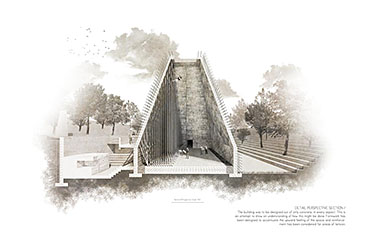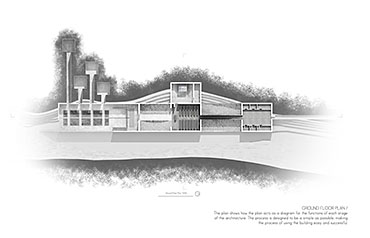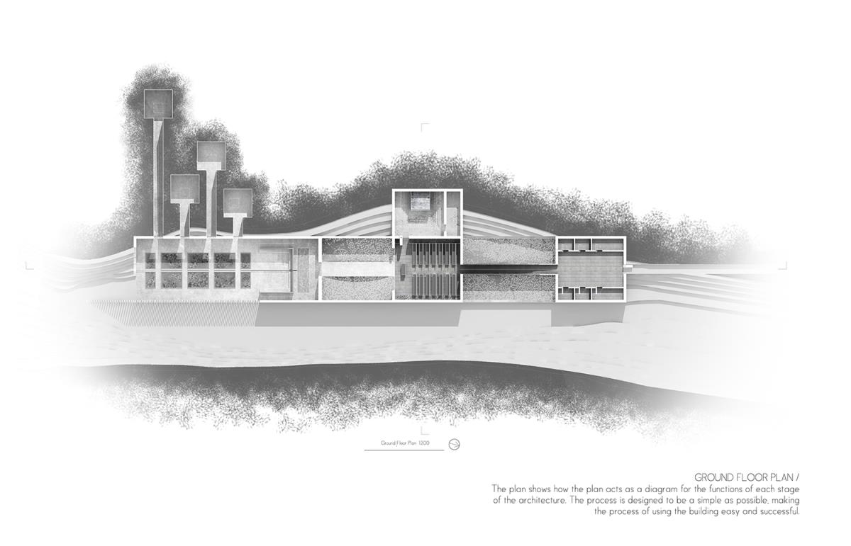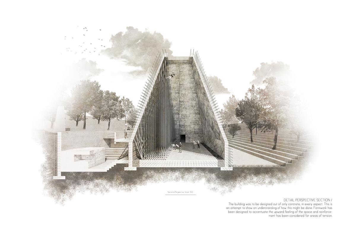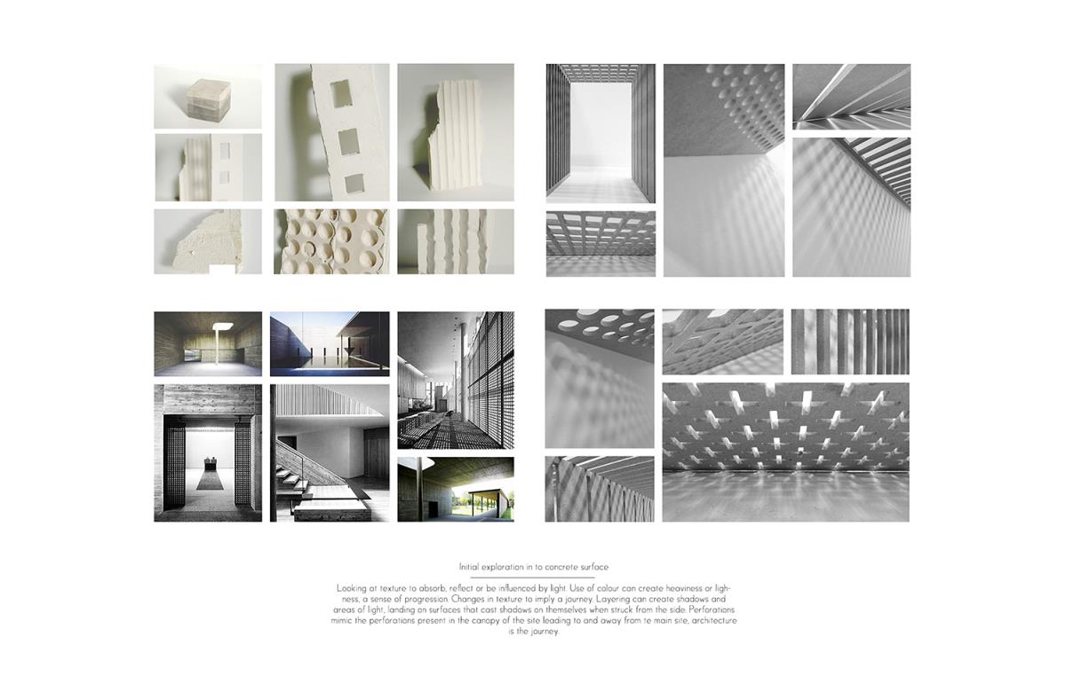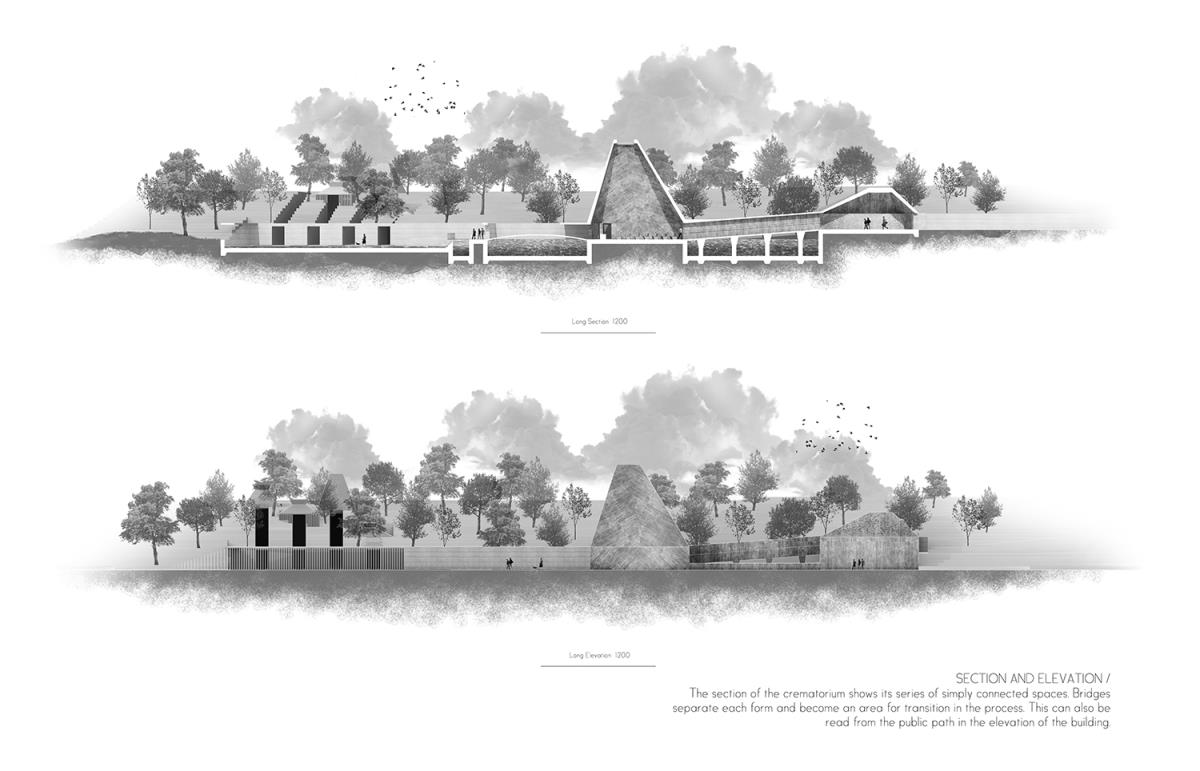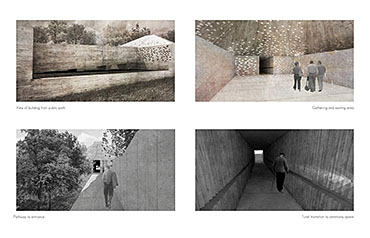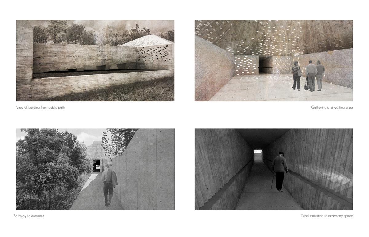 The Remembrance of Things Past Part 1 Project 2013 Tony Lees University of Liverpool | UK “In the same way as in art and literature, but in a less easily ignored way, architecture contributes to our collective memory”, Adam Caruso.There is an unavoidable dialogue between building and place. The crematorium fully absorbs its purpose and context, allowing it to inform the essence of its architecture, and vibrates with the history of all those that made the journey before, helping to create genuine and lasting memories. A single linear process guiding you through the architecture parallels the different stages of life, grieving, memory and the crematorium itself. The journey of the path and its sense of progression becomes a metaphor for the whole project. Enhanced through sensual stimulation, water guides you on the journey, first through sound, then through sight, then as a guiding path giving life to a vibrant garden of wild flowers revealing entrances to memorial spaces. Traces of those before you and the world around you are imprinted upon the building, creating a deep sense of oneness in this intervention reinforcing a worldly connection with the earth and things primitive. It is an open air space occupying a site sensitive to an existing route; merely becoming a temporary meander from the usual treaded path. Eventually you re-join the path that is Otterspool Park and continue onwards, not looking back, but looking forward with the memory of those dear to you.The building finds its being in the existence of the forest. How can a material interact emotionally with a human being? The impersonal nature of concrete takes on a familiarity and atmospheric quality that conjures up memories and emotions of the past by taking on textures, plays of light, shadows, and smells of the forest around it, all of a more personal and base human connection. Like chiaroscuro the building becomes a perforated canopy of trees, and shows the imprint of burnt out branches whilst smells lingers on. An active exploration has been made in to the inherent memory of materials, or rather, how a material manifests itself, whilst the contextual nature of the building leads to a more powerful and holistic experience. Tutor(s) Professor Neil Jackson