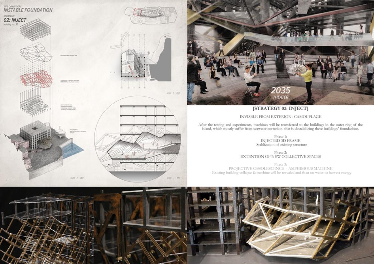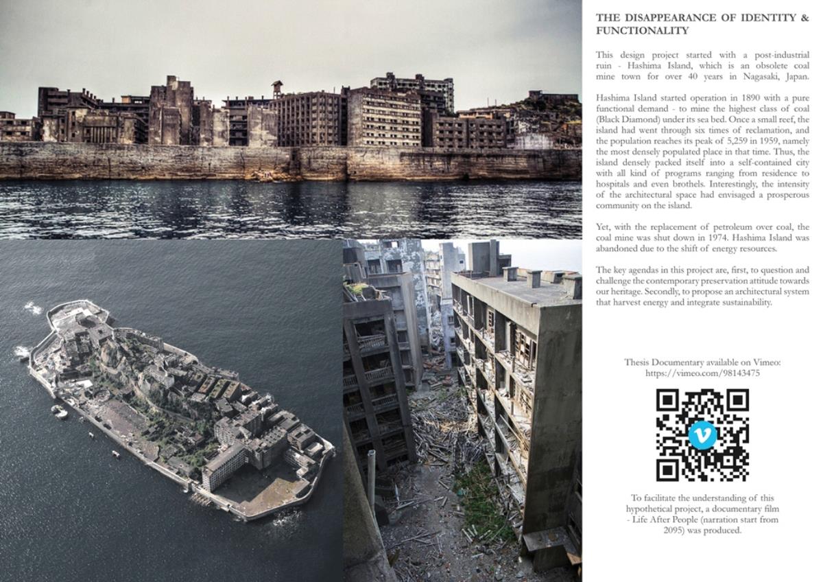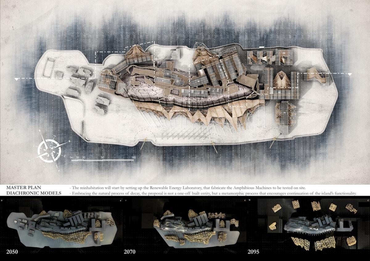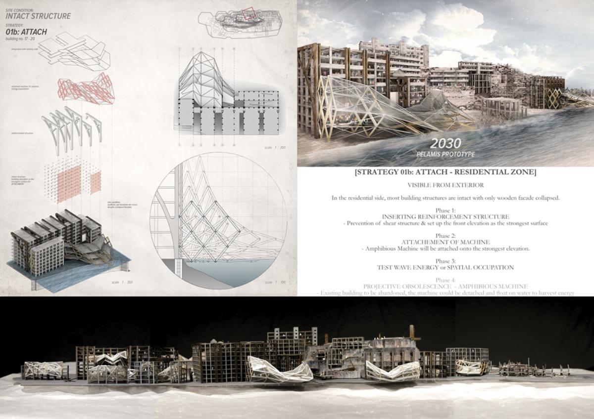 Life after People: Projective Obsolesence of the Techno-Ruin Part 2 Project 2014 Yok Fai (Arnold) Wong University of Hong Kong | China Site: Hashima Island, JapanThe project started with a post-industrial ruin - Hashima Island in Nagasaki, Japan. Once a thriving coal-mining town for almost 100 years, the island was abandoned when the major energy resource in Japan changed from petroleum to coal in 1974. Typical Treatments To Post-Industrial RuinsThe key agenda in this project is to challenge the contemporary attitude towards the definition of preservation. Typical preservation methods such as immortalization and revitalization, passively react to the natural process of decay, by either freezing the site without productivity, or injecting program that is not related to the site. In fact, Hashima Island is undergoing these typical treatments. ProposalRather than following the usual trajectory, the proposal intends to anticipate the process of decay and to harvest energies and useful by-products. The design proposal is not a one-off built entity, but a metamorphic process that encourages continuation of the island's identity and functionality. The well-established infrastructure and climatic conditions of the island, make it an ideal site for a renewable energy laboratory, that will undergo continual construction and adaption to the fast-evolving industry as well as occupants' needs. The proposed system - the Amphibious Machine can generate power through wave motion as well as create habitable spaces.Four design objectives1. Resurrection- to preserve and reinforce specific architectural qualities that signify the identity of the island2. Adaptation- to allow dynamic spatial changes according to the occupants' needs, and also for the fast-evolving energy industry3. Energy Production- to test prototypes for power generation and establish the island as a self-sustaining city.4. Projective Obsolescence-by embracing the natural decay process taking place on the island as well, it would allow us to anticipate the intervention might become obsolete too.Projective ObsolescenceUltimately, the project anticipates the obsolescence of the island again, while the Amphibious Machines remain and establish the island as a techno-ruin.Documentary Film https://vimeo.com/98143475 Tutor(s) Eunice Seng