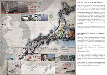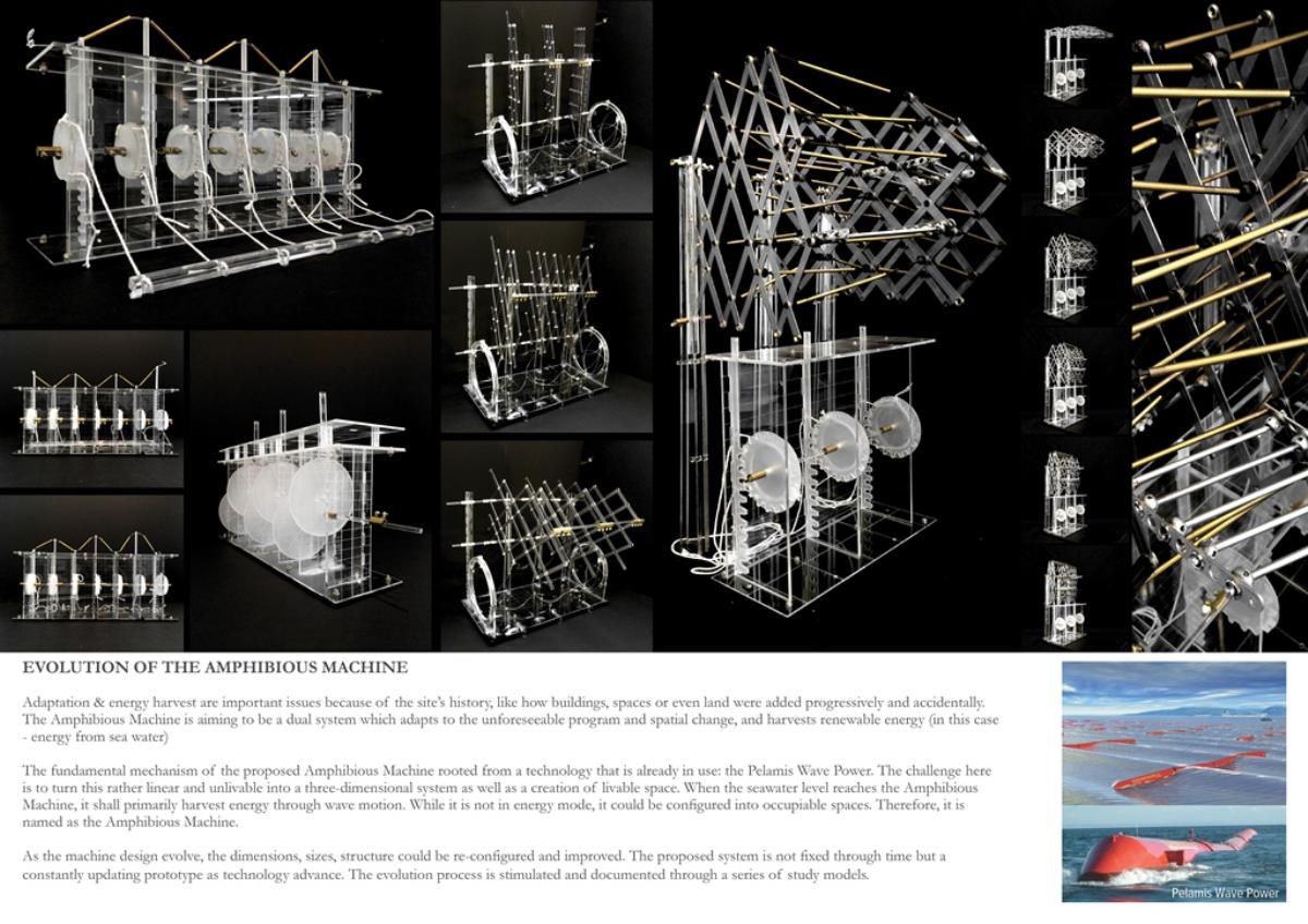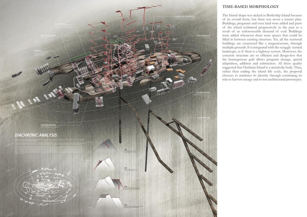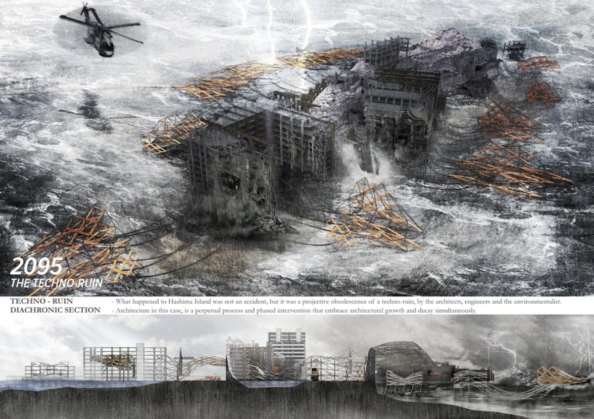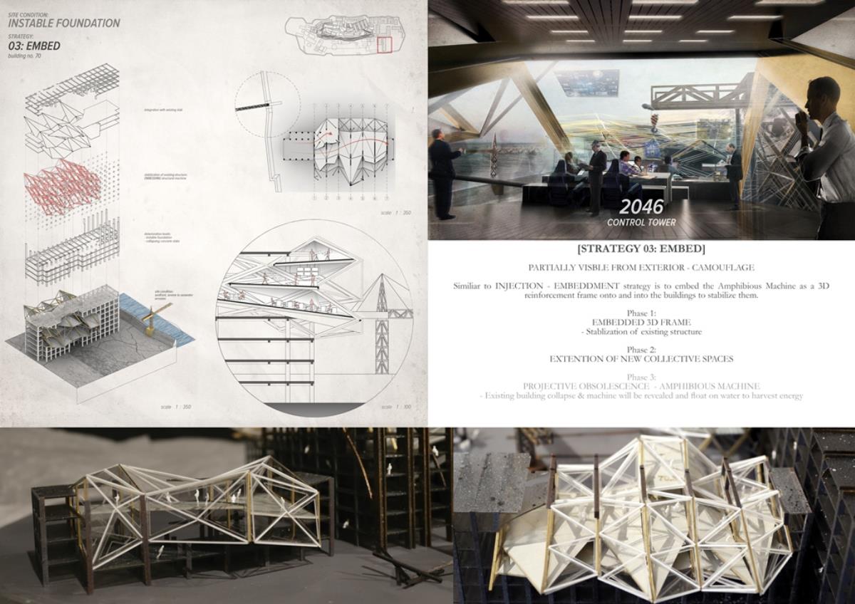 Life after People: Projective Obsolesence of the Techno-Ruin Part 2 Project 2014 Yok Fai (Arnold) Wong University of Hong Kong | China Site: Hashima Island, JapanThe project started with a post-industrial ruin - Hashima Island in Nagasaki, Japan. Once a thriving coal-mining town for almost 100 years, the island was abandoned when the major energy resource in Japan changed from petroleum to coal in 1974. Typical Treatments To Post-Industrial RuinsThe key agenda in this project is to challenge the contemporary attitude towards the definition of preservation. Typical preservation methods such as immortalization and revitalization, passively react to the natural process of decay, by either freezing the site without productivity, or injecting program that is not related to the site. In fact, Hashima Island is undergoing these typical treatments. ProposalRather than following the usual trajectory, the proposal intends to anticipate the process of decay and to harvest energies and useful by-products. The design proposal is not a one-off built entity, but a metamorphic process that encourages continuation of the island's identity and functionality. The well-established infrastructure and climatic conditions of the island, make it an ideal site for a renewable energy laboratory, that will undergo continual construction and adaption to the fast-evolving industry as well as occupants' needs. The proposed system - the Amphibious Machine can generate power through wave motion as well as create habitable spaces.Four design objectives1. Resurrection- to preserve and reinforce specific architectural qualities that signify the identity of the island2. Adaptation- to allow dynamic spatial changes according to the occupants' needs, and also for the fast-evolving energy industry3. Energy Production- to test prototypes for power generation and establish the island as a self-sustaining city.4. Projective Obsolescence-by embracing the natural decay process taking place on the island as well, it would allow us to anticipate the intervention might become obsolete too.Projective ObsolescenceUltimately, the project anticipates the obsolescence of the island again, while the Amphibious Machines remain and establish the island as a techno-ruin.Documentary Film https://vimeo.com/98143475 Tutor(s) Eunice Seng
