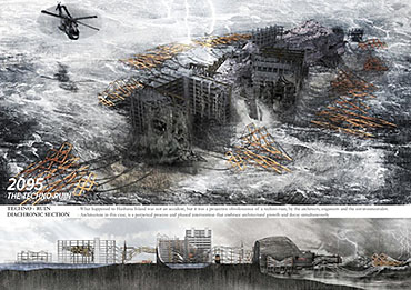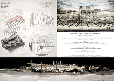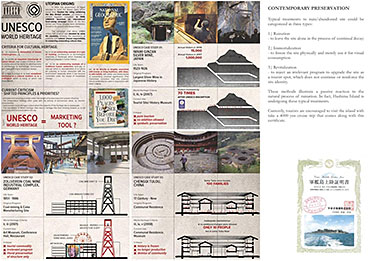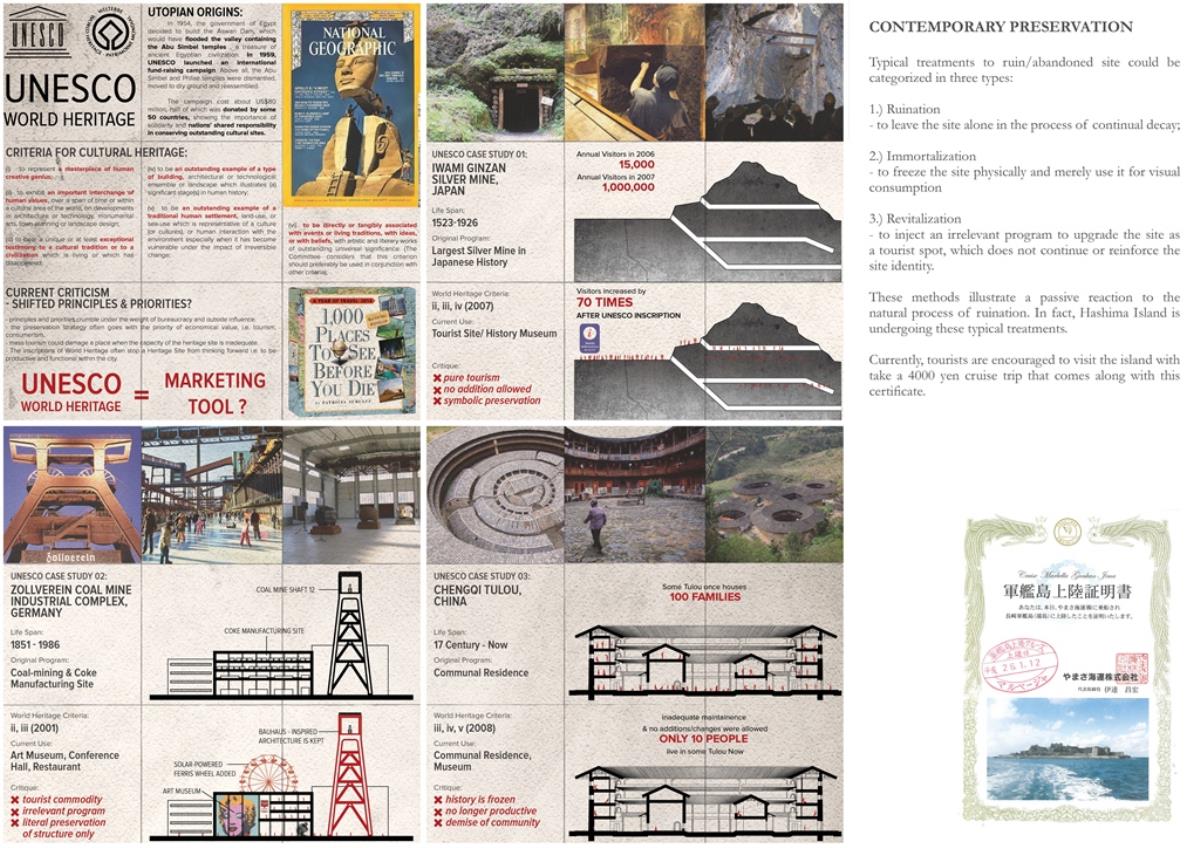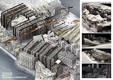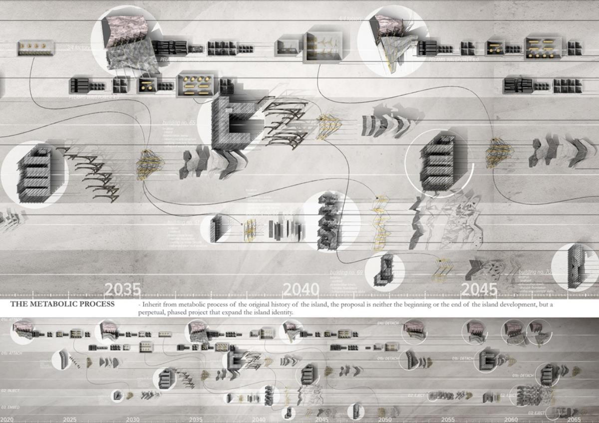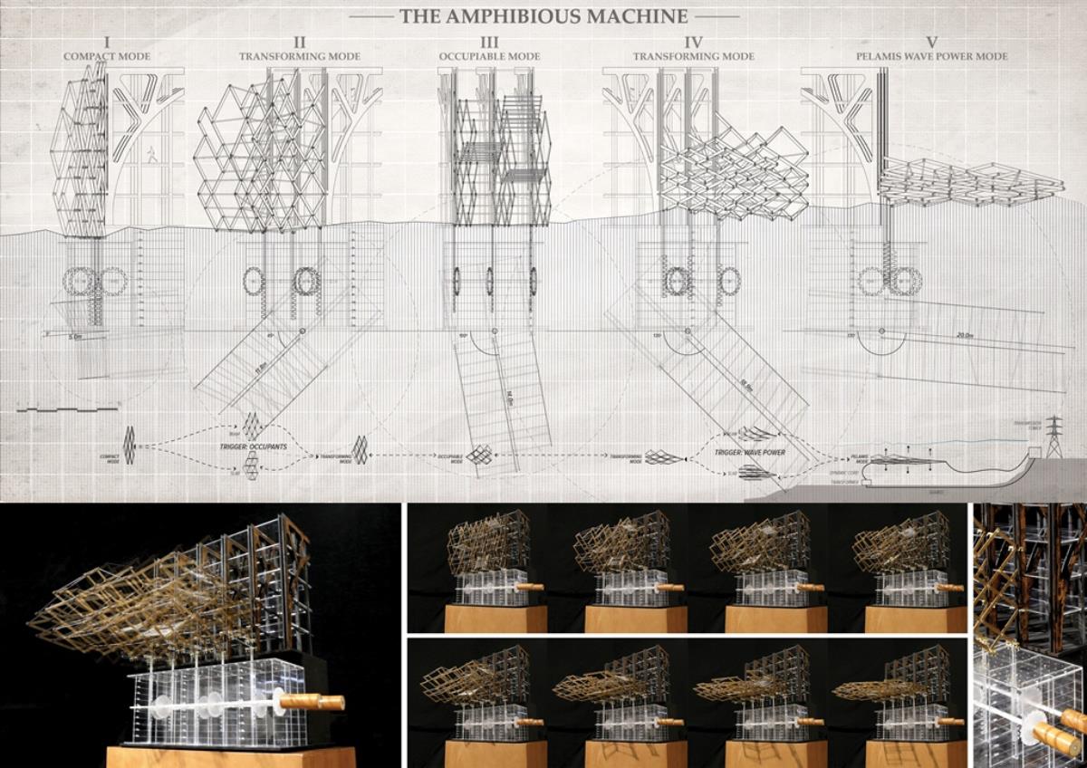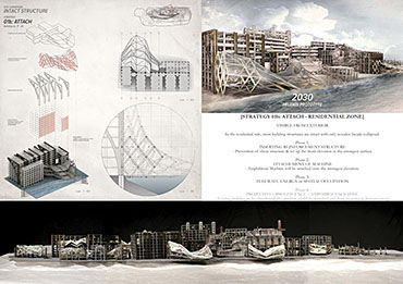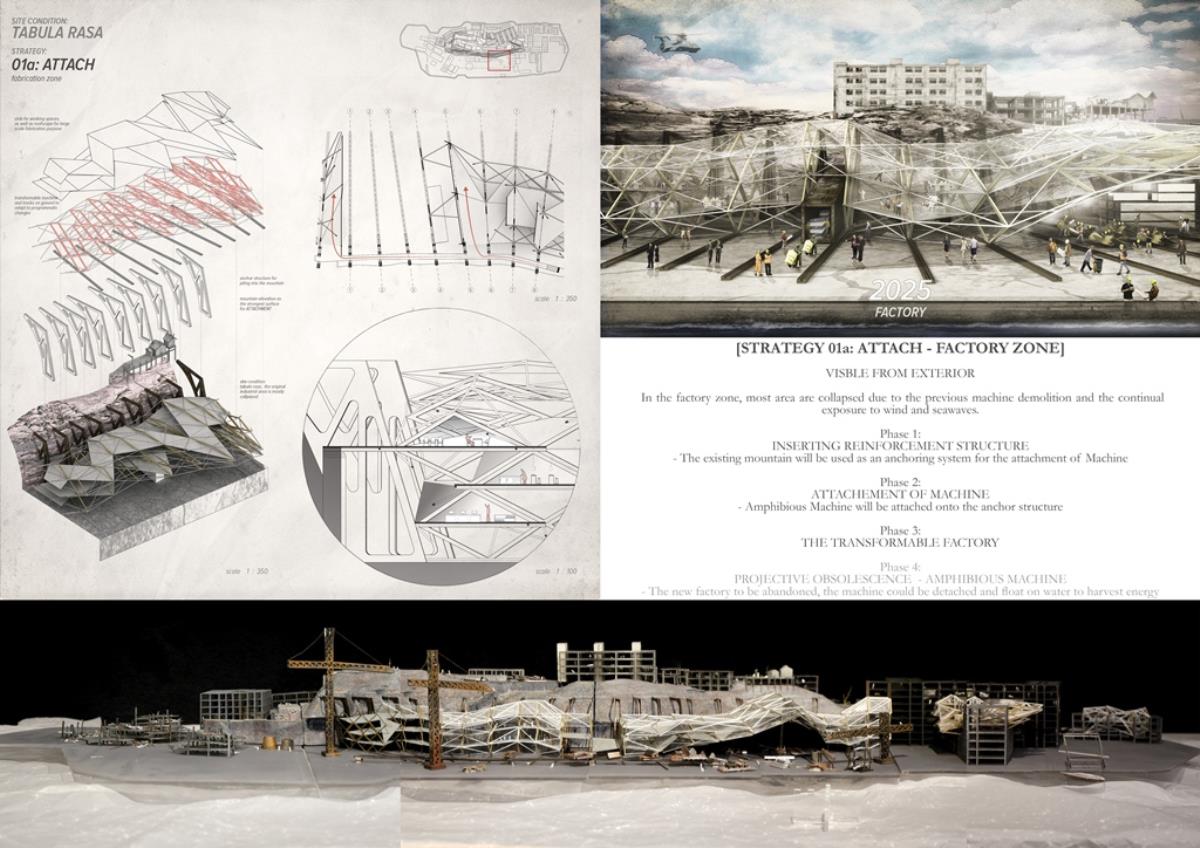 Life after People: Projective Obsolesence of the Techno-Ruin Part 2 Project 2014 Yok Fai (Arnold) Wong University of Hong Kong | China Site: Hashima Island, JapanThe project started with a post-industrial ruin - Hashima Island in Nagasaki, Japan. Once a thriving coal-mining town for almost 100 years, the island was abandoned when the major energy resource in Japan changed from petroleum to coal in 1974. Typical Treatments To Post-Industrial RuinsThe key agenda in this project is to challenge the contemporary attitude towards the definition of preservation. Typical preservation methods such as immortalization and revitalization, passively react to the natural process of decay, by either freezing the site without productivity, or injecting program that is not related to the site. In fact, Hashima Island is undergoing these typical treatments. ProposalRather than following the usual trajectory, the proposal intends to anticipate the process of decay and to harvest energies and useful by-products. The design proposal is not a one-off built entity, but a metamorphic process that encourages continuation of the island's identity and functionality. The well-established infrastructure and climatic conditions of the island, make it an ideal site for a renewable energy laboratory, that will undergo continual construction and adaption to the fast-evolving industry as well as occupants' needs. The proposed system - the Amphibious Machine can generate power through wave motion as well as create habitable spaces.Four design objectives1. Resurrection- to preserve and reinforce specific architectural qualities that signify the identity of the island2. Adaptation- to allow dynamic spatial changes according to the occupants' needs, and also for the fast-evolving energy industry3. Energy Production- to test prototypes for power generation and establish the island as a self-sustaining city.4. Projective Obsolescence-by embracing the natural decay process taking place on the island as well, it would allow us to anticipate the intervention might become obsolete too.Projective ObsolescenceUltimately, the project anticipates the obsolescence of the island again, while the Amphibious Machines remain and establish the island as a techno-ruin.Documentary Film https://vimeo.com/98143475 Tutor(s) Eunice Seng
