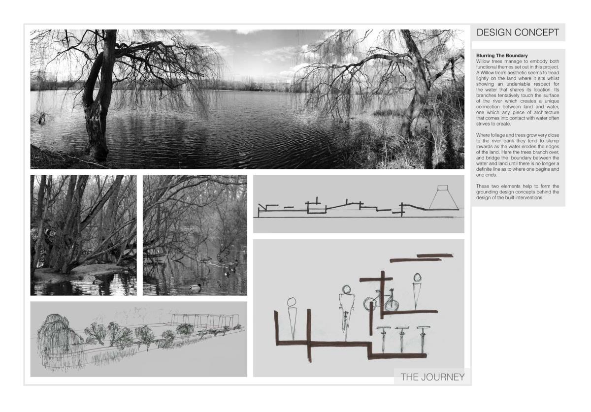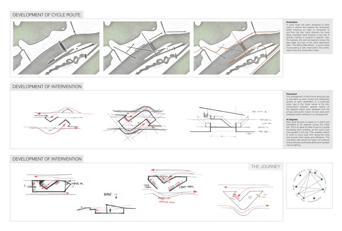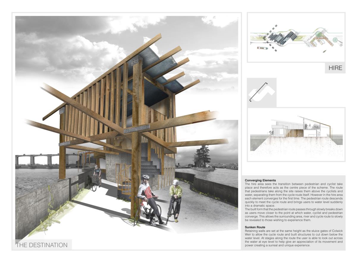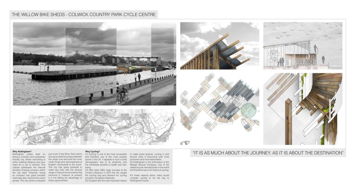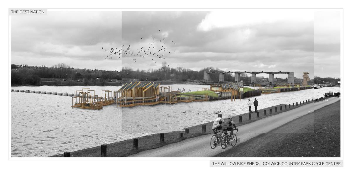 The Willow Bike Sheds Part 1 Project 2014 Miles Kelsey Nottingham Trent University | UK “There is a distinct boundary and relationship between water and land, through colour, texture, sound and many other elements. There are few instances when this boundary is successfully bridged, however riverbank vegetation, in particular Willow Trees manage to display how this barrier can be crossed and interacted with, to create a unique and romantic connection between two very different environments.”Nottingham has great potential to create seamless connections to its rural surroundings due to its compact city structure. However, at present the area is not making the most of these opportunities. The River Trent lies just south of the city centre and inadvertently acts as a constraint and a barrier to the southern expanses of countryside and natural beauty. The Willow Bike Sheds aim to turn this constraint into an opportunity by distinctly highlighting the beauty between man-made and natural, built form and landscape, water and land.Latching onto an area renown for water based activity and recreational use, The Willow Bike Sheds propose an intimate cycle centre and landscaped cycle route, uniquely placed on a linear strip of land within the river itself. Key links between the city centre and the countryside south of the River Trent are exposed to their fullest potential, allowing users to appreciate Nottingham’s ideal placement within the scenery of the Midlands.A series of spaces including a café, hire centre, retail outlet, repair space and observation tower emerge out of a twisted, undulating cycle route, and act as checkpoints or pit stops to both cyclists and pedestrians. These built elements appear as lightweight permeable structures that extend the land on which they sit, challenging the boundary between land and water. The aesthetic approach is inspired by the vegetation around the site and its influence on the relationship between these two elements. The plant life, in particular Willow Trees, that line the riverbanks act as bridging elements that compliment the relationship between water and land and it is this factor that is expanded upon, reproduced and explored through the design and delivery of The Willow Bike Sheds. Tutor(s) Andrew Wheeler