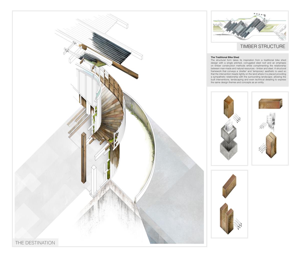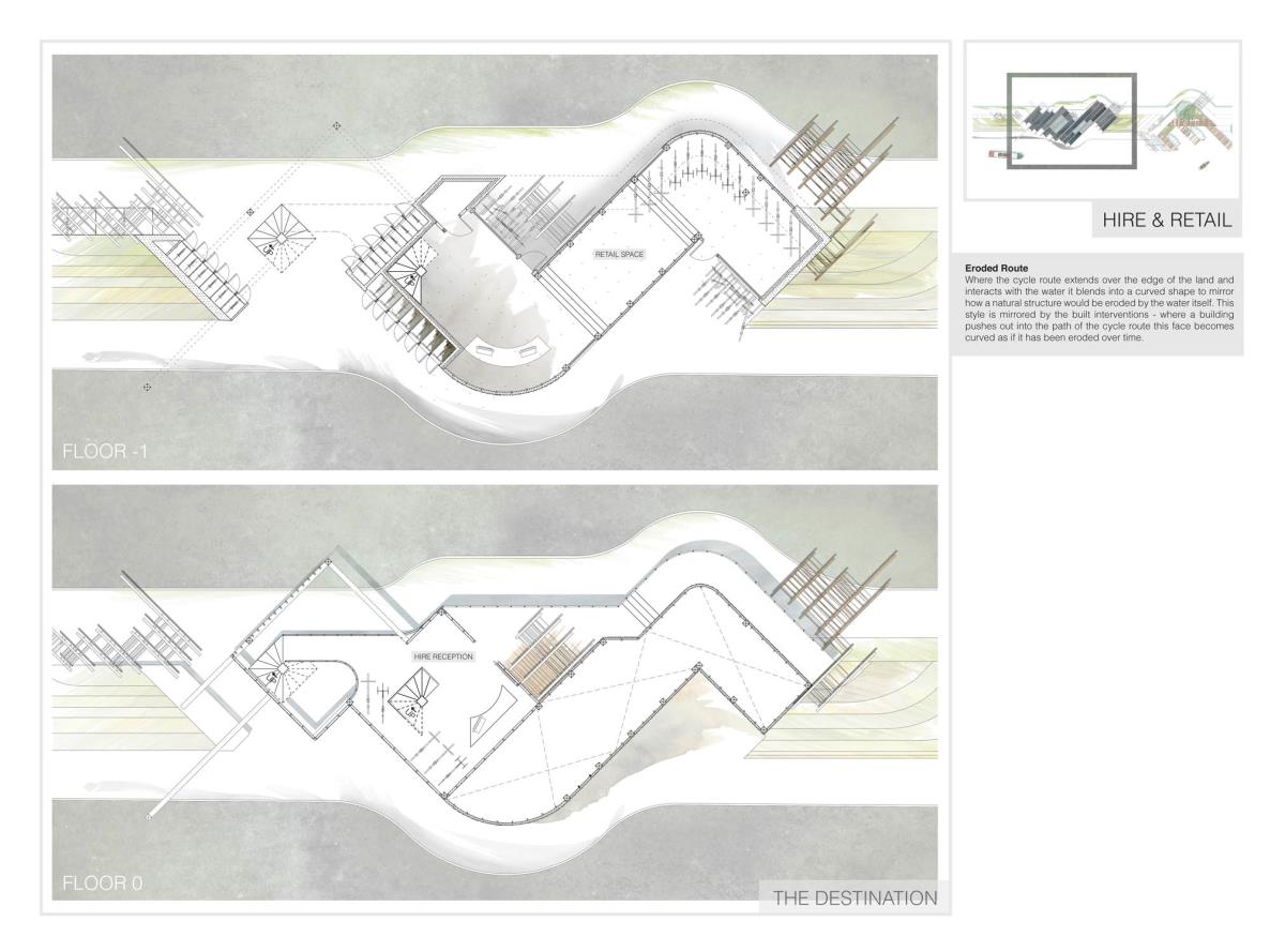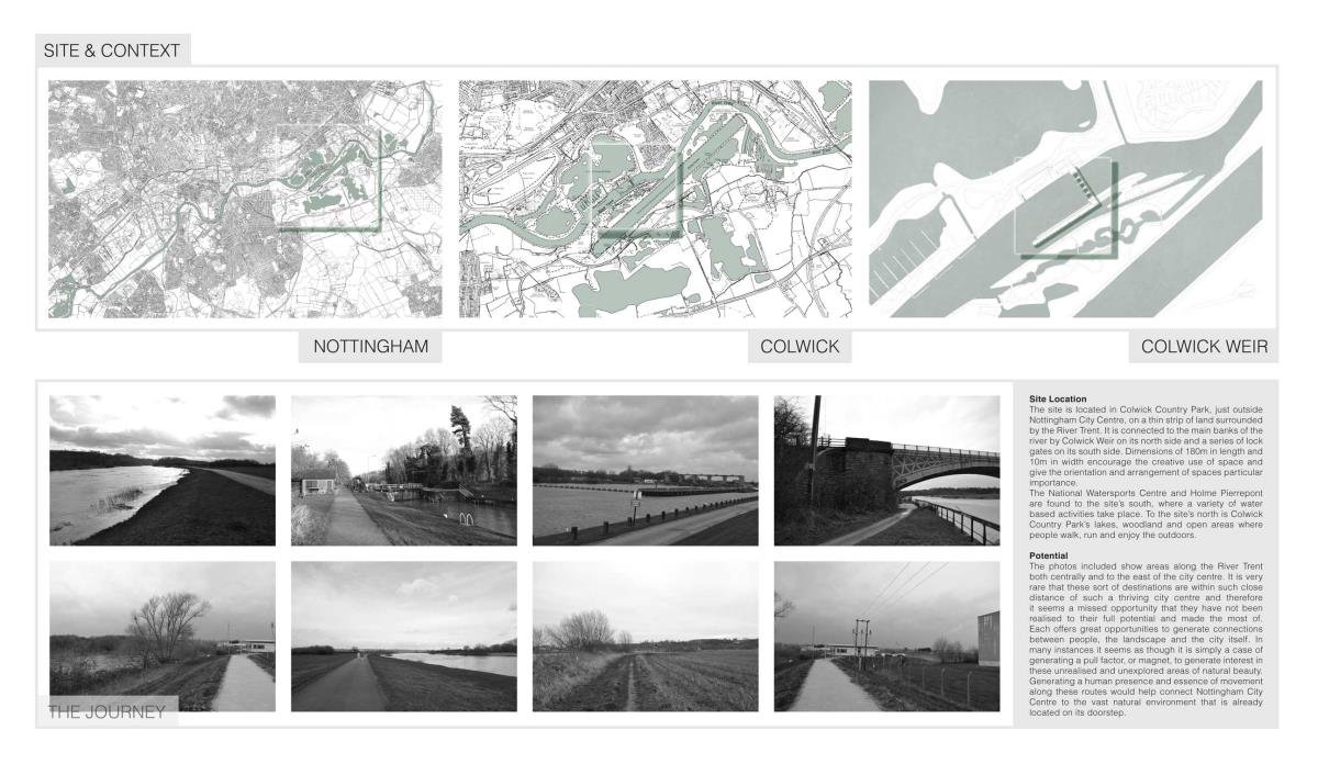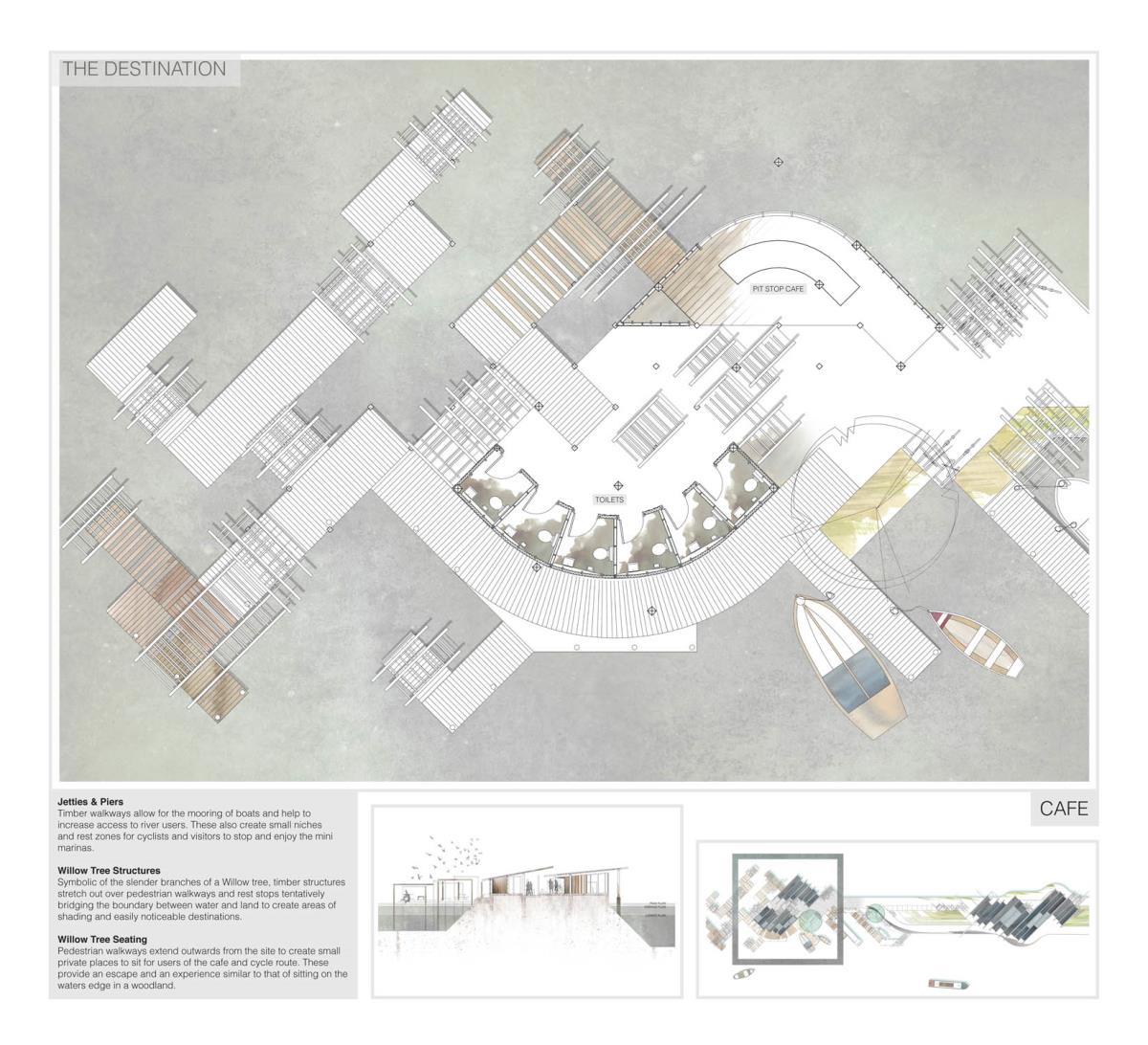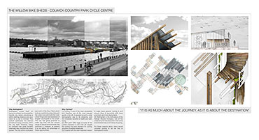 The Willow Bike Sheds Part 1 Project 2014 Miles Kelsey Nottingham Trent University | UK “There is a distinct boundary and relationship between water and land, through colour, texture, sound and many other elements. There are few instances when this boundary is successfully bridged, however riverbank vegetation, in particular Willow Trees manage to display how this barrier can be crossed and interacted with, to create a unique and romantic connection between two very different environments.”Nottingham has great potential to create seamless connections to its rural surroundings due to its compact city structure. However, at present the area is not making the most of these opportunities. The River Trent lies just south of the city centre and inadvertently acts as a constraint and a barrier to the southern expanses of countryside and natural beauty. The Willow Bike Sheds aim to turn this constraint into an opportunity by distinctly highlighting the beauty between man-made and natural, built form and landscape, water and land.Latching onto an area renown for water based activity and recreational use, The Willow Bike Sheds propose an intimate cycle centre and landscaped cycle route, uniquely placed on a linear strip of land within the river itself. Key links between the city centre and the countryside south of the River Trent are exposed to their fullest potential, allowing users to appreciate Nottingham’s ideal placement within the scenery of the Midlands.A series of spaces including a café, hire centre, retail outlet, repair space and observation tower emerge out of a twisted, undulating cycle route, and act as checkpoints or pit stops to both cyclists and pedestrians. These built elements appear as lightweight permeable structures that extend the land on which they sit, challenging the boundary between land and water. The aesthetic approach is inspired by the vegetation around the site and its influence on the relationship between these two elements. The plant life, in particular Willow Trees, that line the riverbanks act as bridging elements that compliment the relationship between water and land and it is this factor that is expanded upon, reproduced and explored through the design and delivery of The Willow Bike Sheds. Tutor(s) Andrew Wheeler