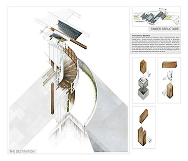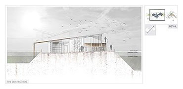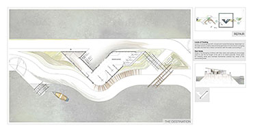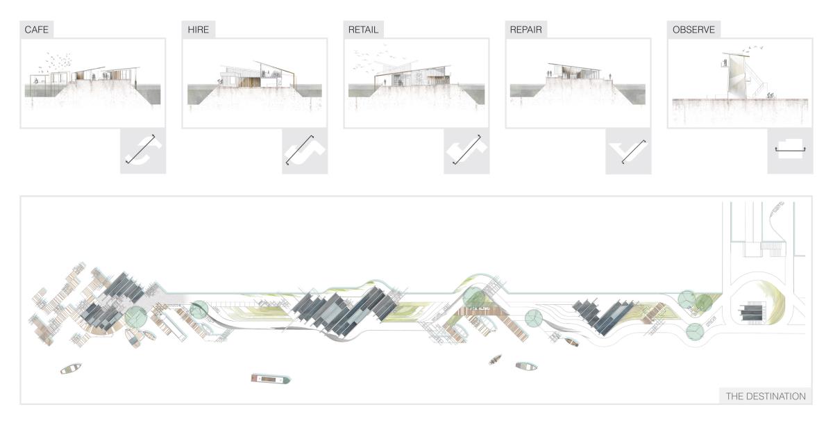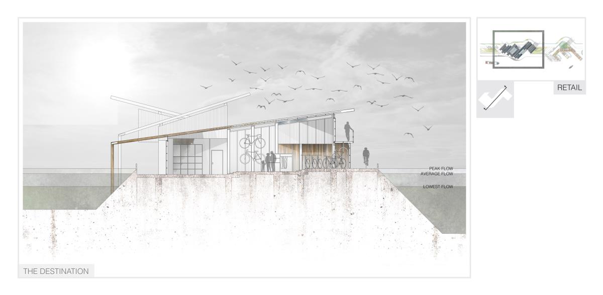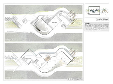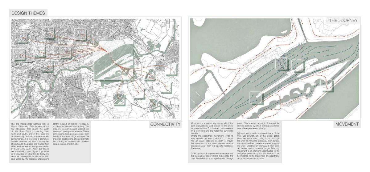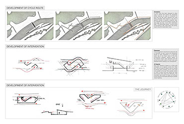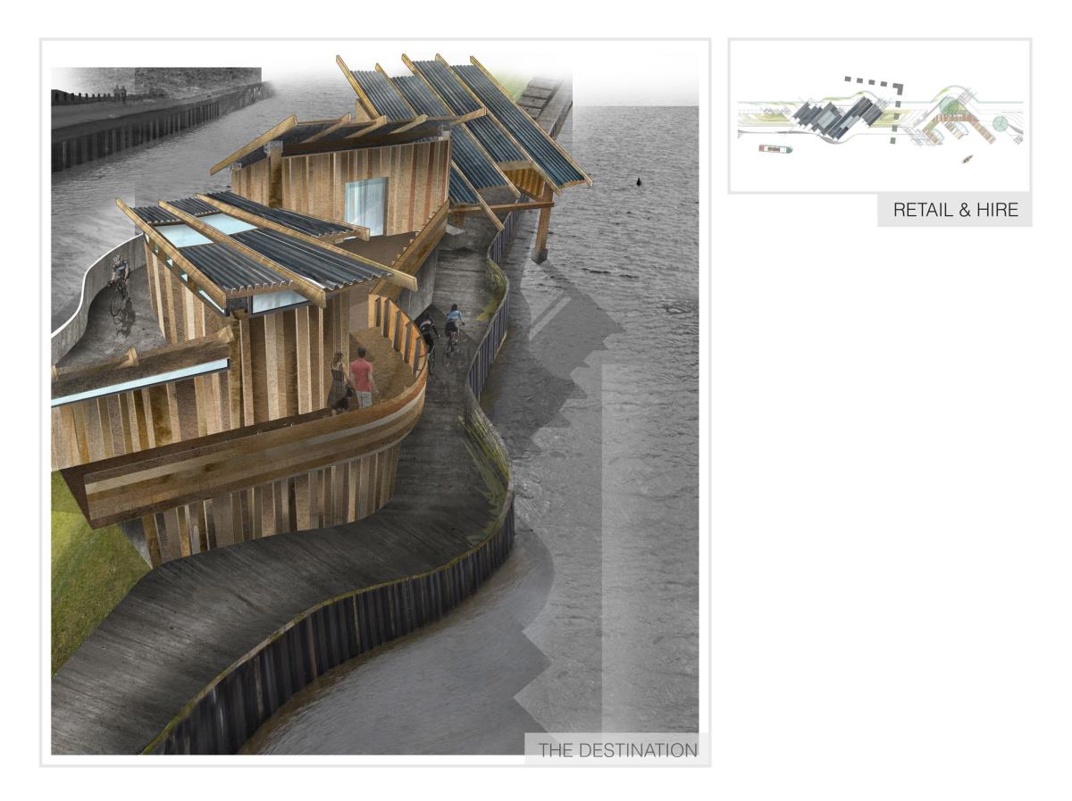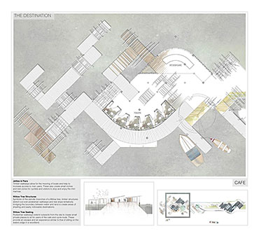 The Willow Bike Sheds Part 1 Project 2014 Miles Kelsey Nottingham Trent University | UK “There is a distinct boundary and relationship between water and land, through colour, texture, sound and many other elements. There are few instances when this boundary is successfully bridged, however riverbank vegetation, in particular Willow Trees manage to display how this barrier can be crossed and interacted with, to create a unique and romantic connection between two very different environments.”Nottingham has great potential to create seamless connections to its rural surroundings due to its compact city structure. However, at present the area is not making the most of these opportunities. The River Trent lies just south of the city centre and inadvertently acts as a constraint and a barrier to the southern expanses of countryside and natural beauty. The Willow Bike Sheds aim to turn this constraint into an opportunity by distinctly highlighting the beauty between man-made and natural, built form and landscape, water and land.Latching onto an area renown for water based activity and recreational use, The Willow Bike Sheds propose an intimate cycle centre and landscaped cycle route, uniquely placed on a linear strip of land within the river itself. Key links between the city centre and the countryside south of the River Trent are exposed to their fullest potential, allowing users to appreciate Nottingham’s ideal placement within the scenery of the Midlands.A series of spaces including a café, hire centre, retail outlet, repair space and observation tower emerge out of a twisted, undulating cycle route, and act as checkpoints or pit stops to both cyclists and pedestrians. These built elements appear as lightweight permeable structures that extend the land on which they sit, challenging the boundary between land and water. The aesthetic approach is inspired by the vegetation around the site and its influence on the relationship between these two elements. The plant life, in particular Willow Trees, that line the riverbanks act as bridging elements that compliment the relationship between water and land and it is this factor that is expanded upon, reproduced and explored through the design and delivery of The Willow Bike Sheds. Tutor(s) Andrew Wheeler