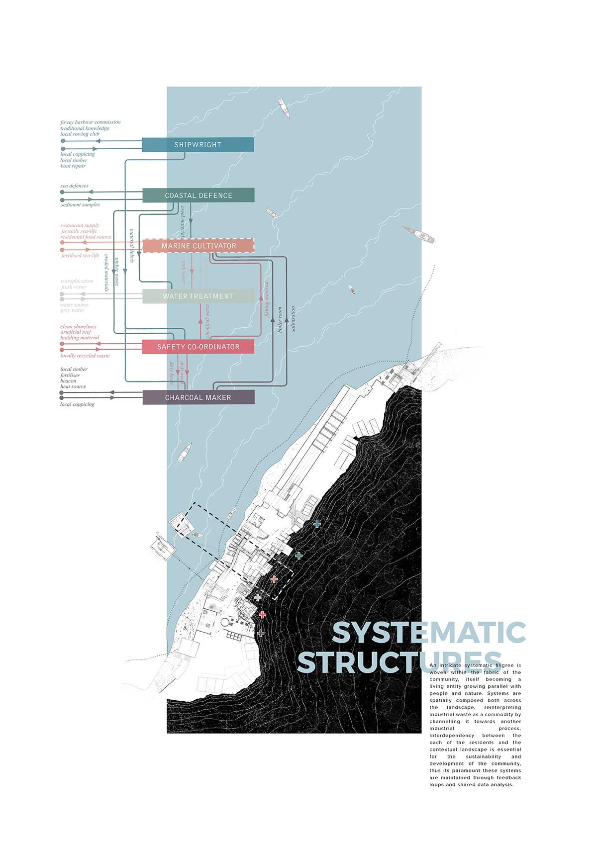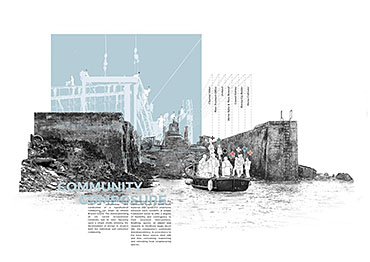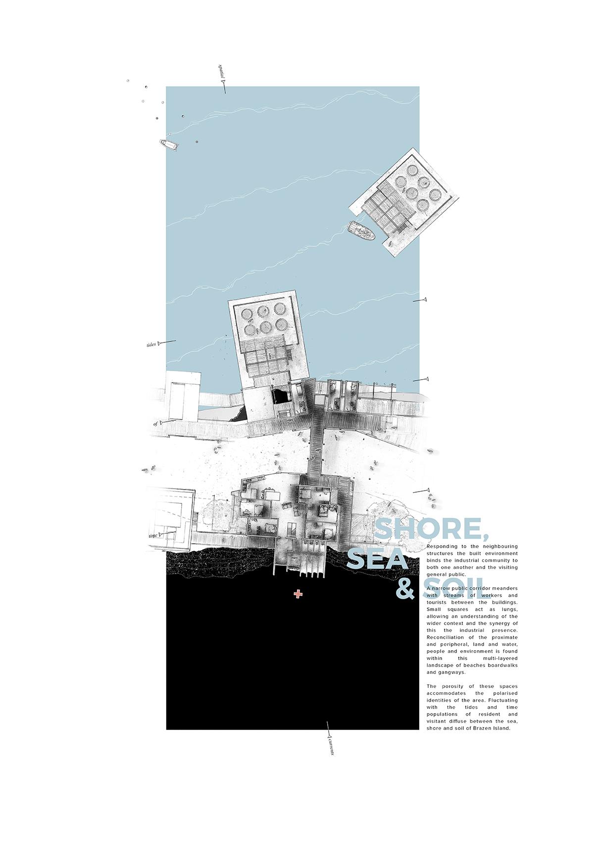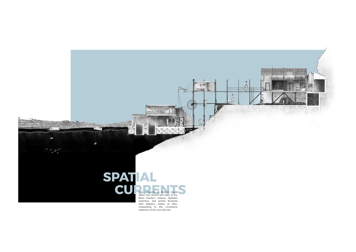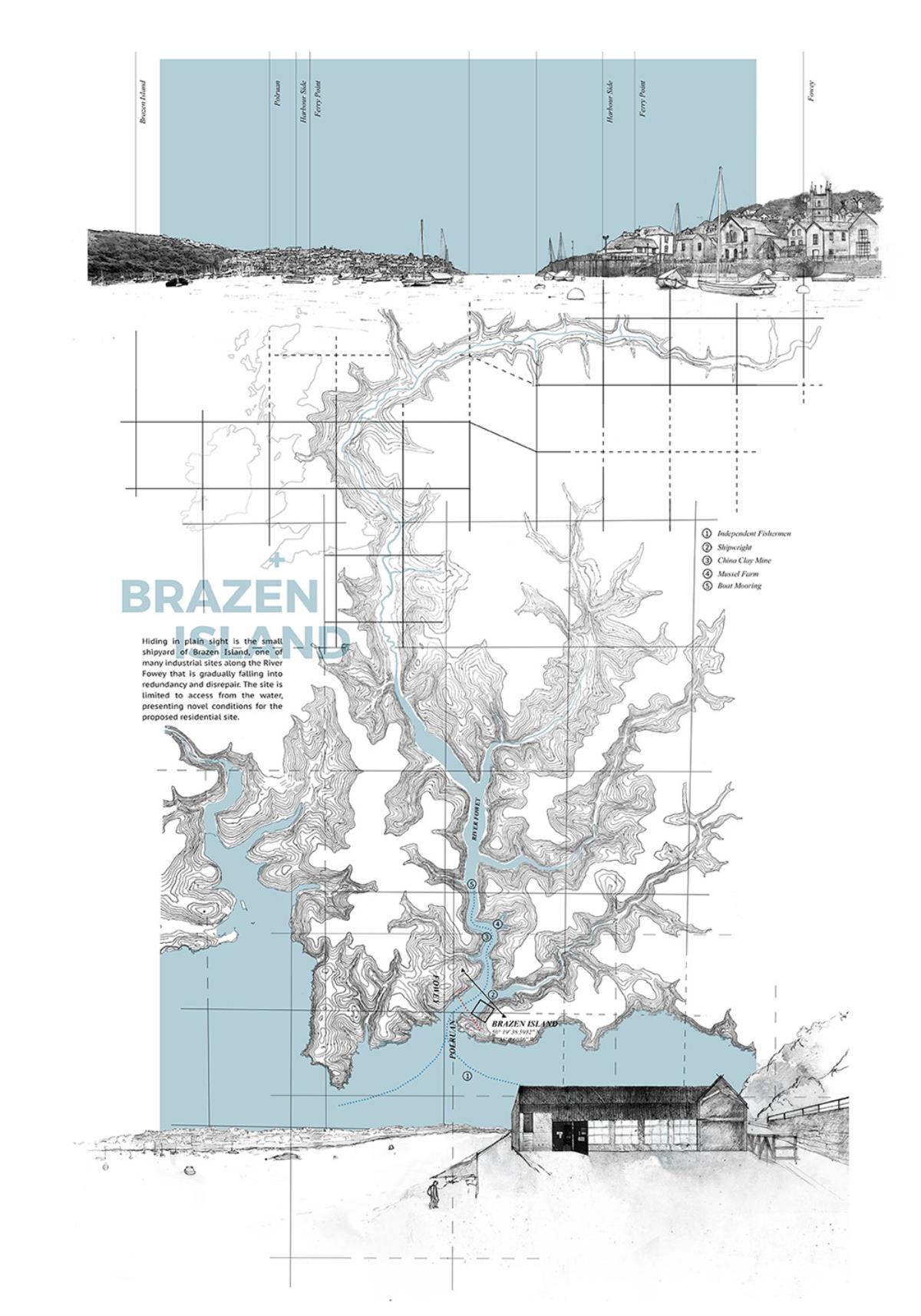 Communal Cultivation Part 1 Project 2015 Jim MacMillan University of Plymouth | UK The Janus-faced features of Cornwall’s identity are worn across the waters of the estuary between Fowey and Polruan. The development of Brazen Island acts as an intermediate, celebrating the opposing banks of the estuary by binding them through their intrinsic affiliation with its coastline.An omnipresence relationship between the sea and soil of Brazen Island led to the development of a design that responds to the biphasic rotations of both time and tide. Where spaces are composed to allow a synergetic reaction between both people and landscape. ‘Communal Cultivation’ is a hypothetical scenario of the Brazen Island redevelopment, proposing that strategic and structural intervention can develop a symbiotic community where localised devolution can generate regional melioration.The present climate of society presents global dilemmas through a rhetoric that dwarfs the individual deeming them infinitesimal and unable to generate any motion of change. This project proposes how a community may translate these issues to a tangible scale, where societal systems and strategies present palpable solutions to problems affecting economy, austerity and scarcity.This schema is a primary catalyst that shall further instigate multiple micro-movements across the deindustrialised Cornish coastline, in an attempt to regionally conduct a direct notion of societal progression. Tutor(s) Roy McCarty