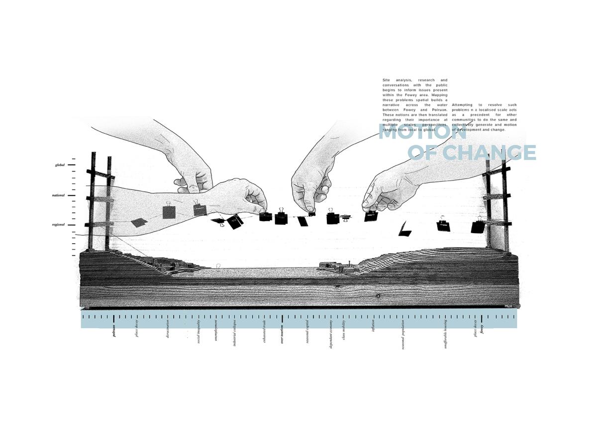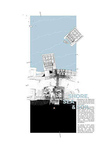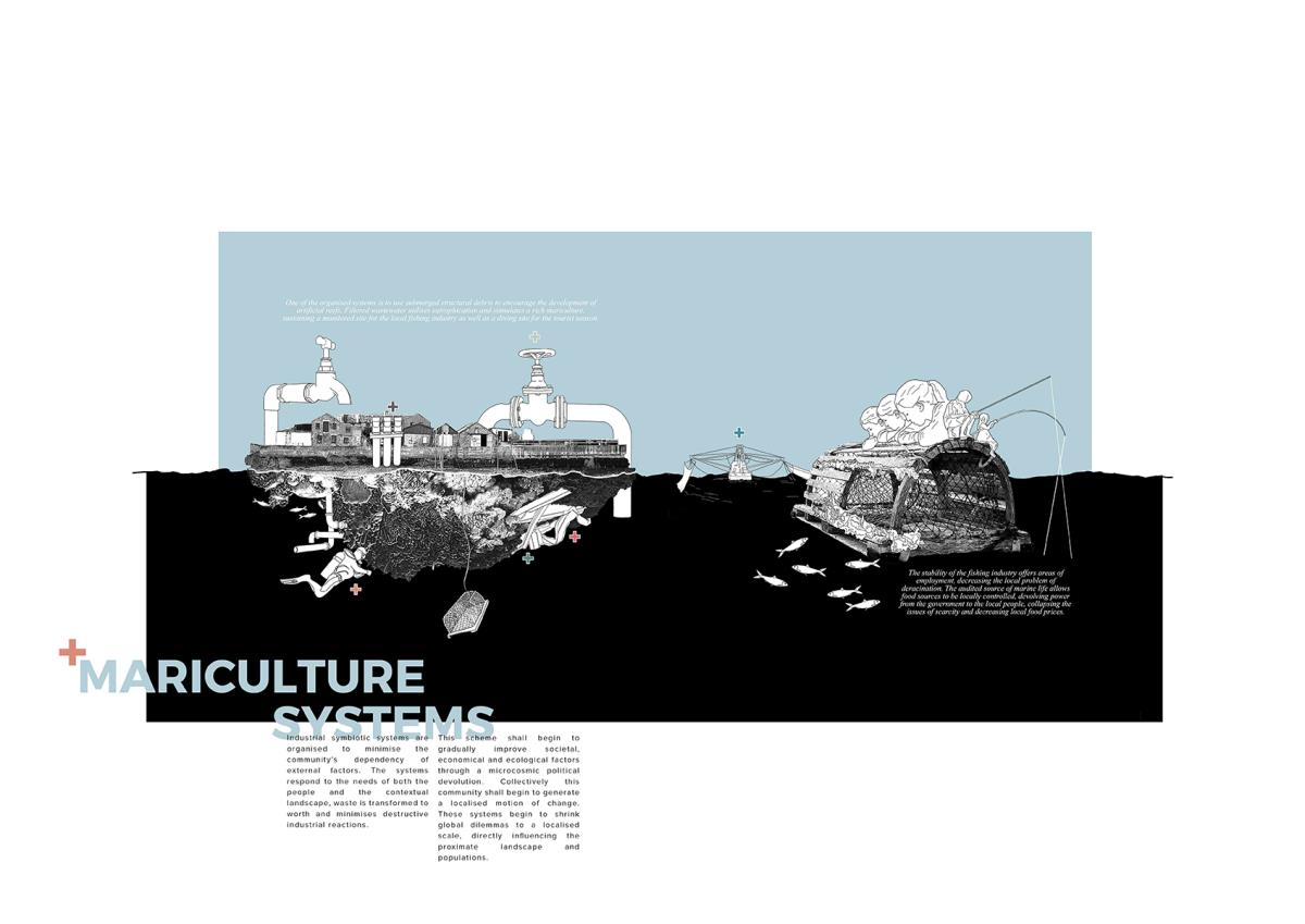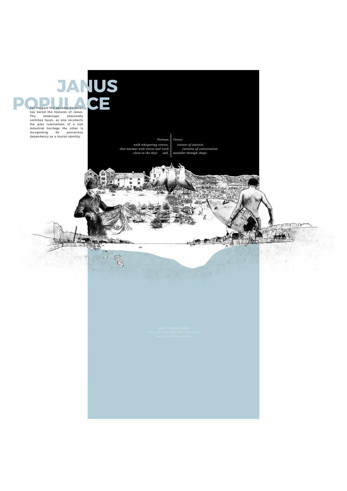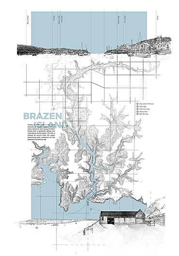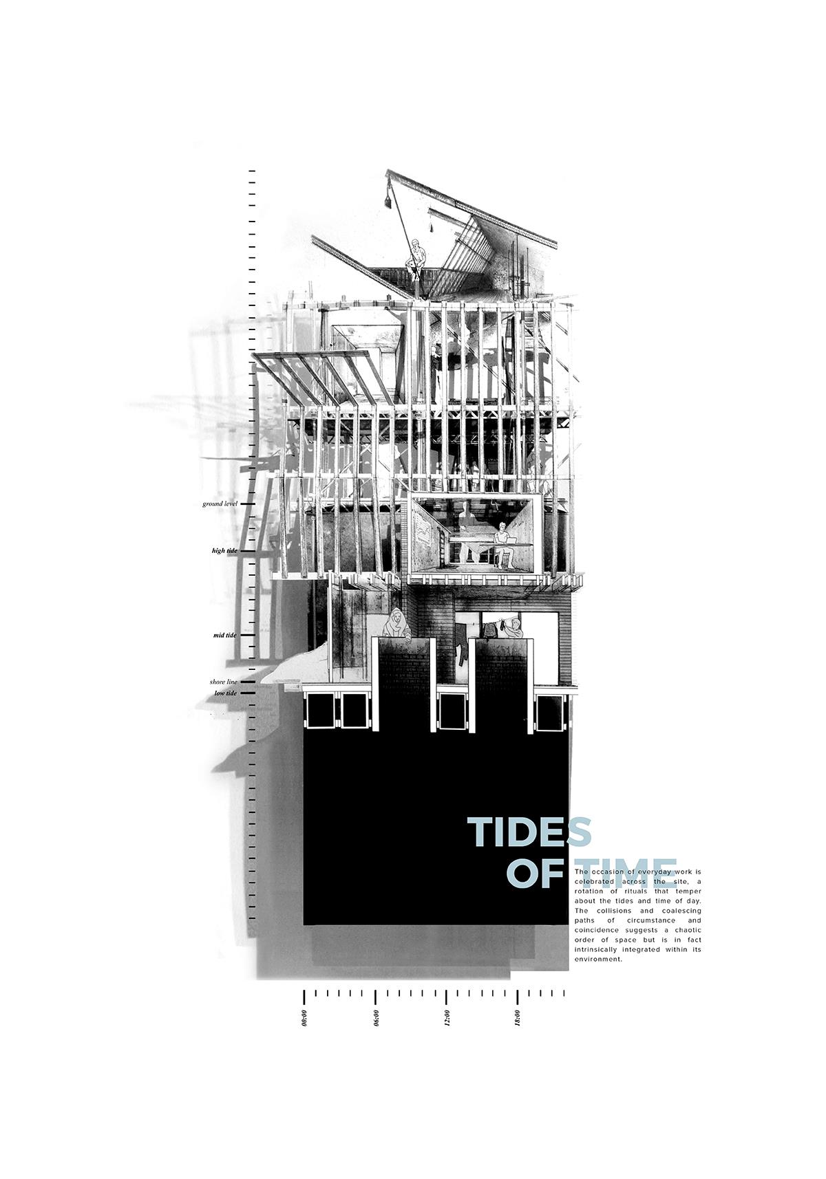 Communal Cultivation Part 1 Project 2015 Jim MacMillan University of Plymouth | UK The Janus-faced features of Cornwall’s identity are worn across the waters of the estuary between Fowey and Polruan. The development of Brazen Island acts as an intermediate, celebrating the opposing banks of the estuary by binding them through their intrinsic affiliation with its coastline.An omnipresence relationship between the sea and soil of Brazen Island led to the development of a design that responds to the biphasic rotations of both time and tide. Where spaces are composed to allow a synergetic reaction between both people and landscape. ‘Communal Cultivation’ is a hypothetical scenario of the Brazen Island redevelopment, proposing that strategic and structural intervention can develop a symbiotic community where localised devolution can generate regional melioration.The present climate of society presents global dilemmas through a rhetoric that dwarfs the individual deeming them infinitesimal and unable to generate any motion of change. This project proposes how a community may translate these issues to a tangible scale, where societal systems and strategies present palpable solutions to problems affecting economy, austerity and scarcity.This schema is a primary catalyst that shall further instigate multiple micro-movements across the deindustrialised Cornish coastline, in an attempt to regionally conduct a direct notion of societal progression. Tutor(s) Roy McCarty