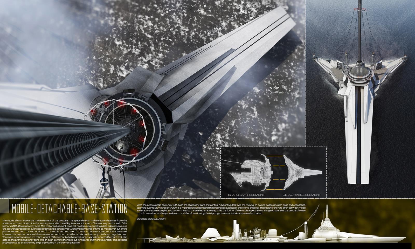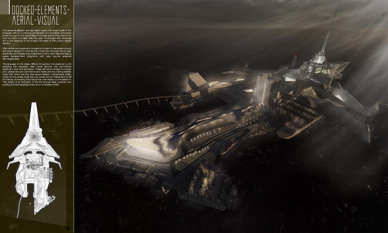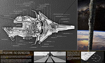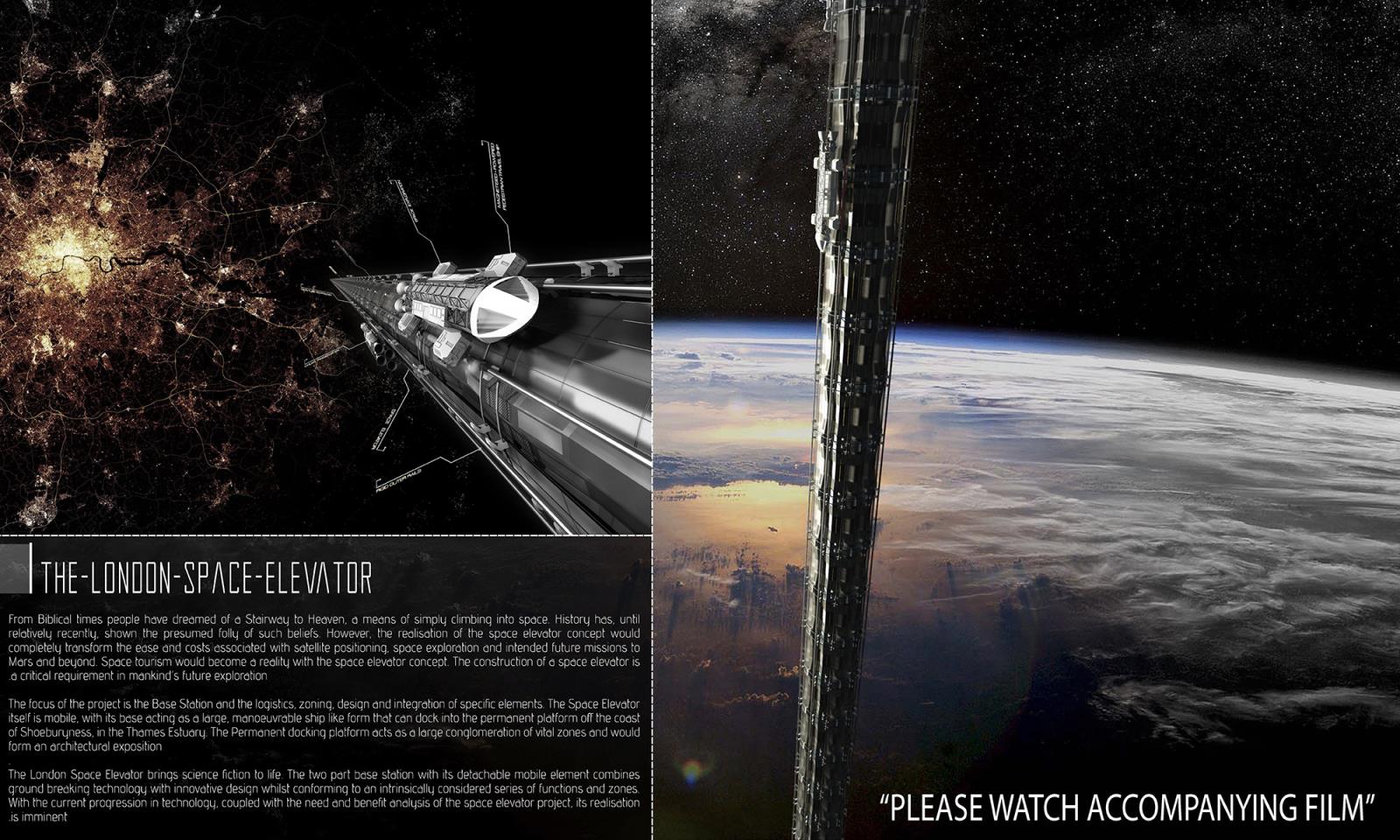 The London Space Elevator, based in the river Thames estuary, brings science fiction to life by means of providing an efficient, intuitive and sustainable transport line to space. The proposal has been strategically designed to combine the technicalities required with an architectural flare, a design that encompasses both function and form and intrinsically approaches the logistics through to the realisation and design.