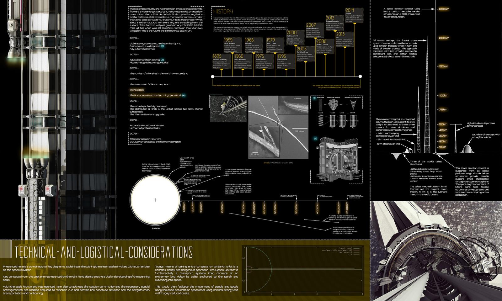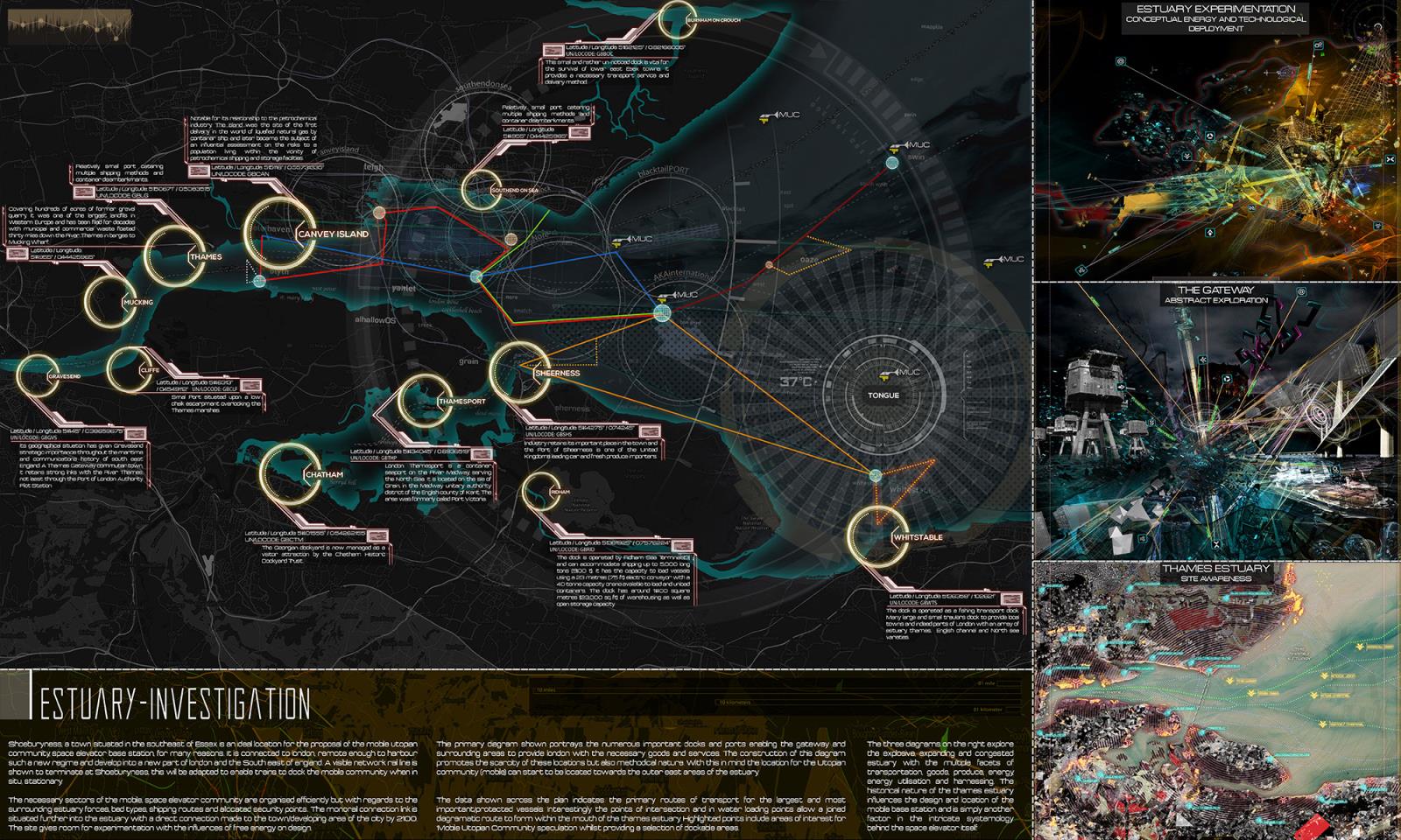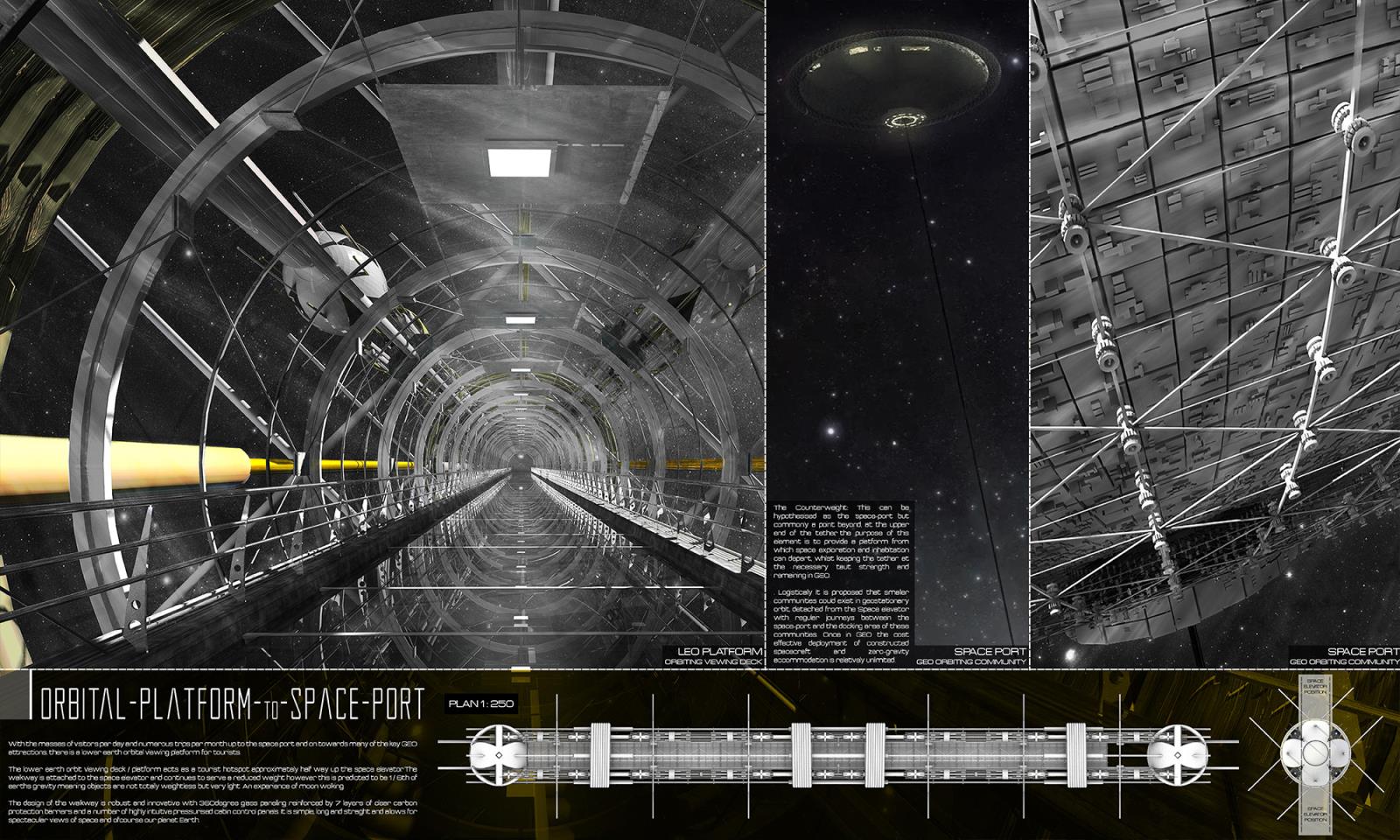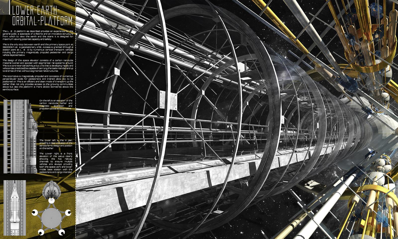 The London Space Elevator, based in the river Thames estuary, brings science fiction to life by means of providing an efficient, intuitive and sustainable transport line to space. The proposal has been strategically designed to combine the technicalities required with an architectural flare, a design that encompasses both function and form and intrinsically approaches the logistics through to the realisation and design.
