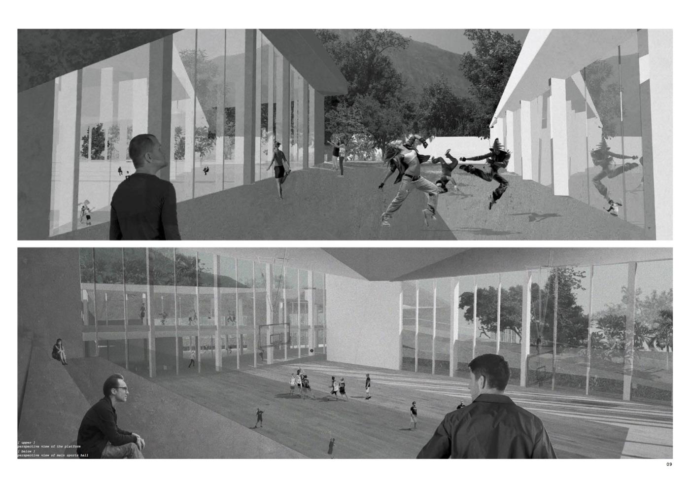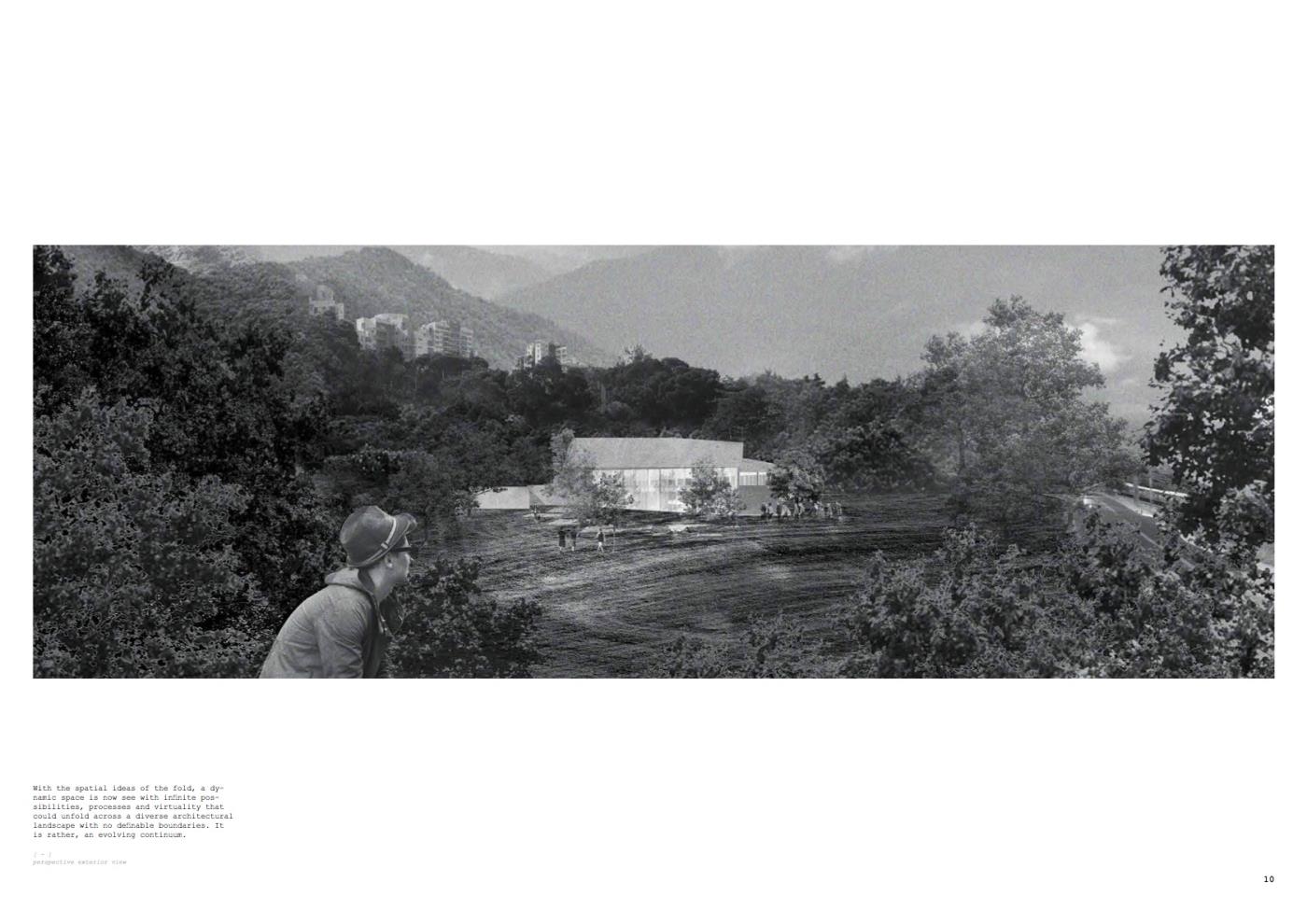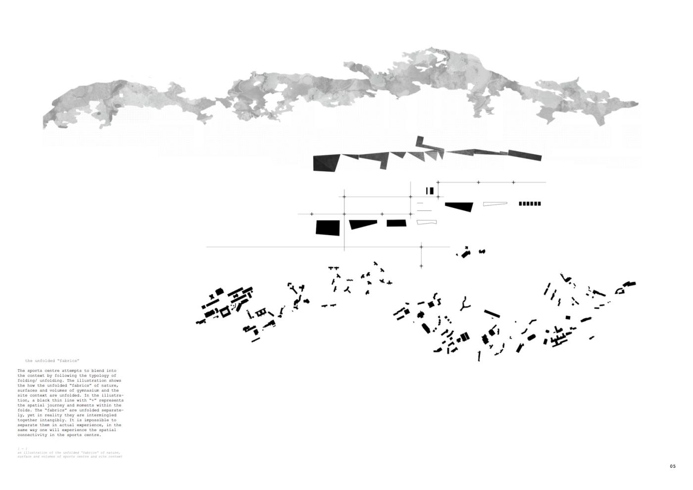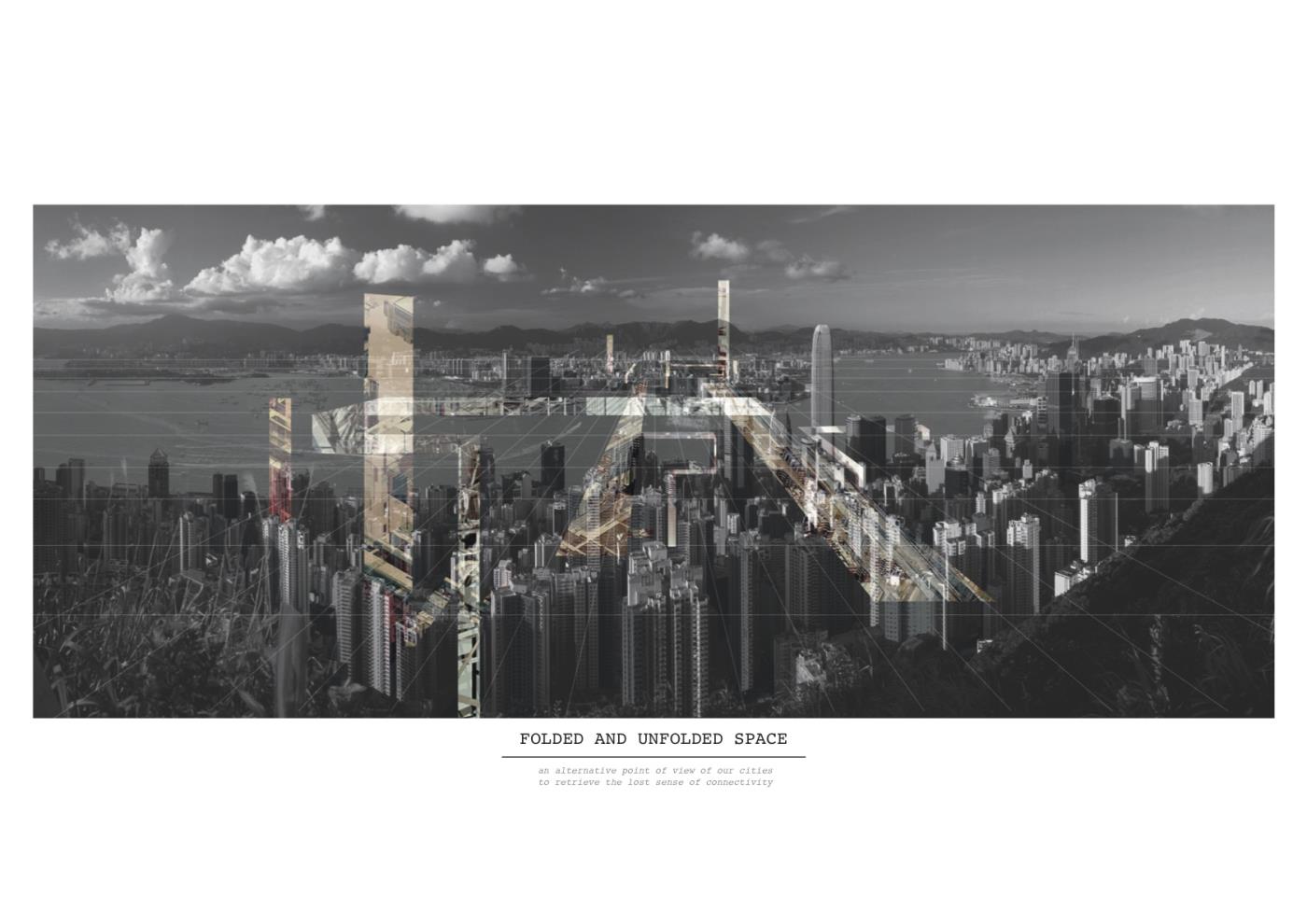 Folded and Unfolded Space: To Retrieve the Lost Sense of Connectivity Part 1 Project 2017 Chun Yu Eric Chan Chinese University of Hong Kong | China This project starts from a theoretical point of view to respond to the homogenous urban form nowadays. By introducing a typology of folding andunfolding, architecture is no longer seen as defined boundaries, but a continuous fabric across place and time. The proposed design for a sportscentre, designed with such typology, aims to bring back the lost sense of connectivity to our city. Tutor(s) Sze Wan Clover Lee