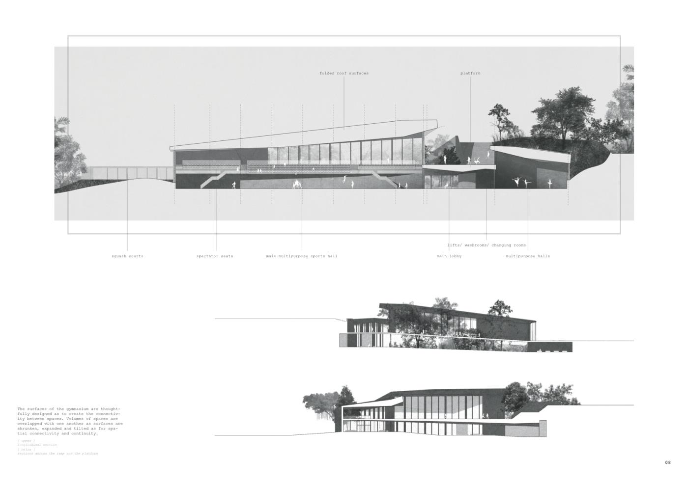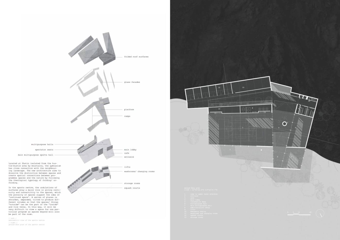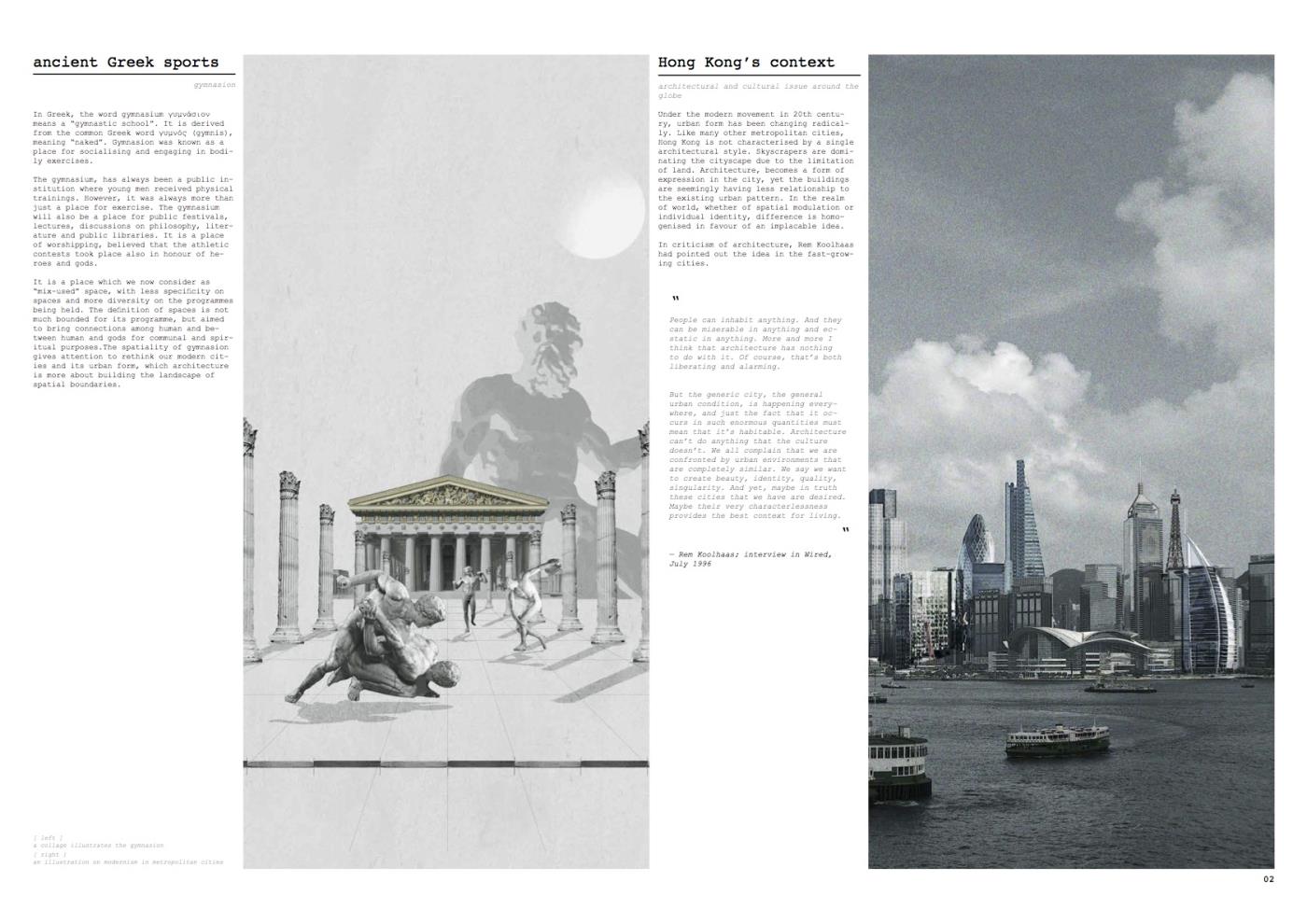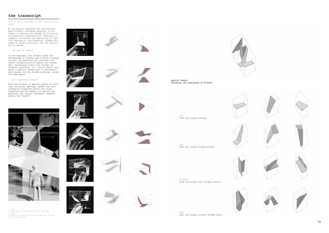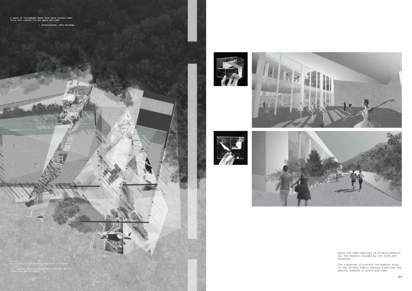 Folded and Unfolded Space: To Retrieve the Lost Sense of Connectivity Part 1 Project 2017 Chun Yu Eric Chan Chinese University of Hong Kong | China This project starts from a theoretical point of view to respond to the homogenous urban form nowadays. By introducing a typology of folding andunfolding, architecture is no longer seen as defined boundaries, but a continuous fabric across place and time. The proposed design for a sportscentre, designed with such typology, aims to bring back the lost sense of connectivity to our city. Tutor(s) Sze Wan Clover Lee