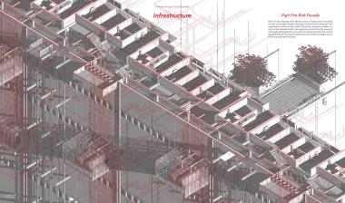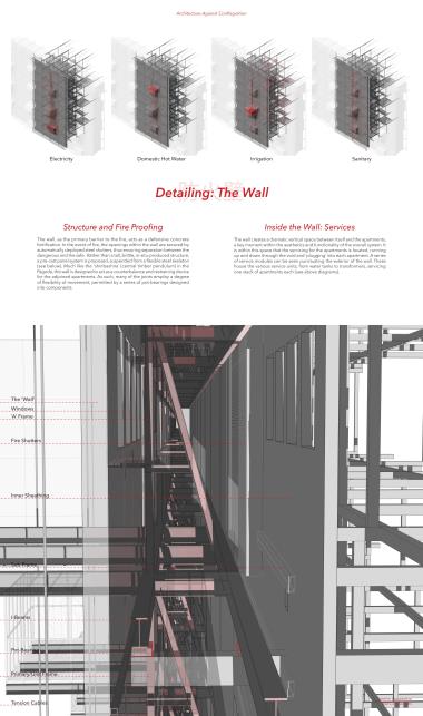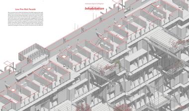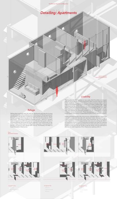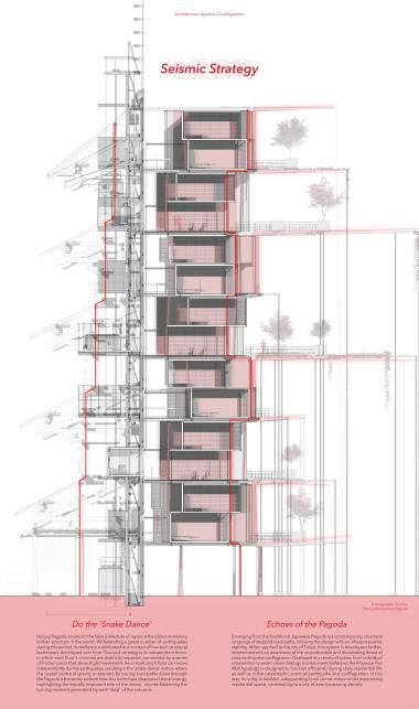 Informed by the traditional Japanese Pagoda, a contemporary structural language of stepped loads has emerged. Applied to the city of Tokyo, this system has responded to the unpredictable and devastating threat of conflagration. Operating across a variety of scales – from day-to-day life to the event of fire, and from individual intervention to urban strategy – the Kitasenju Fire Wall safeguards local communities whilst contributing to a city of ever-increasing density.