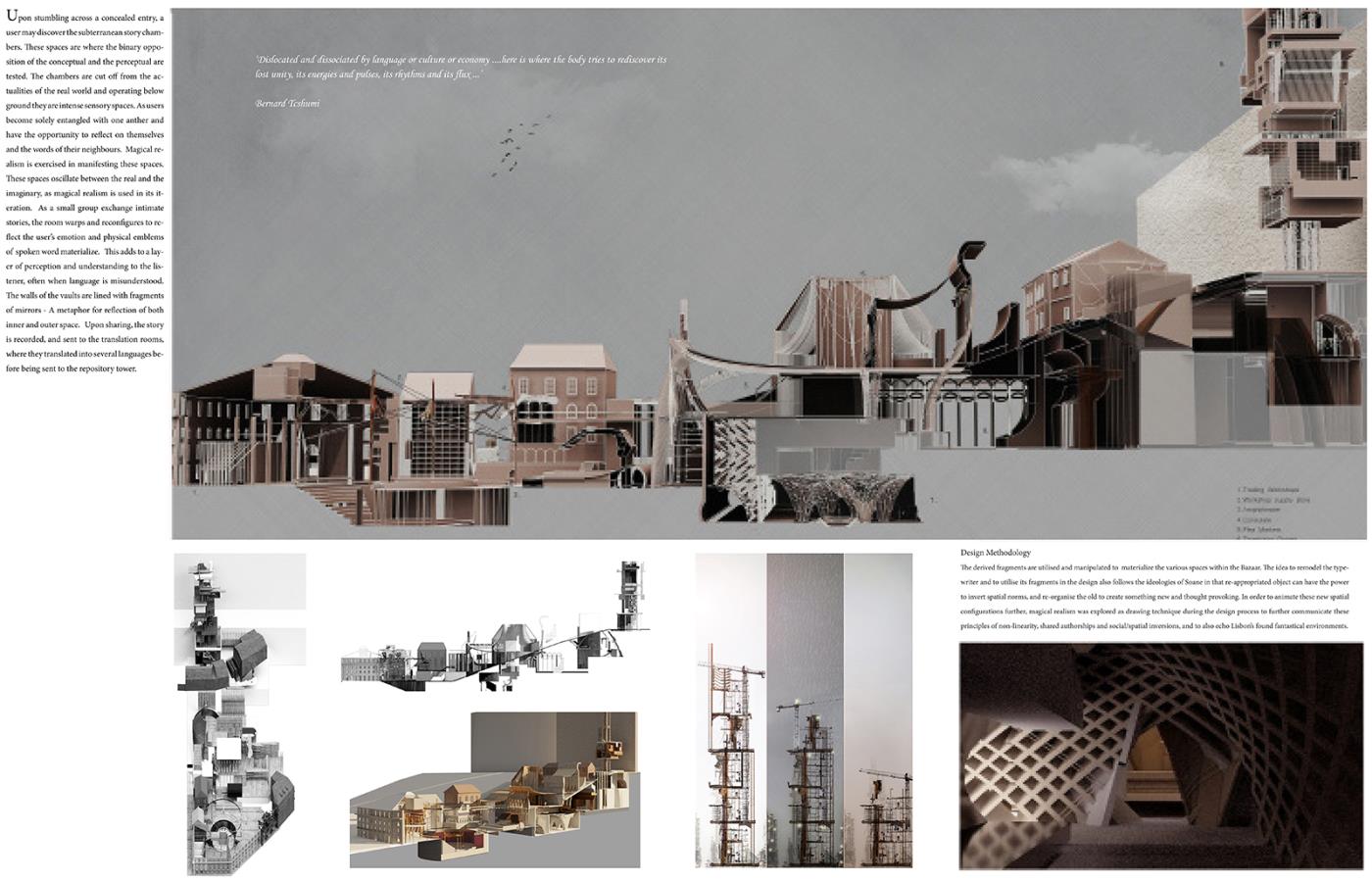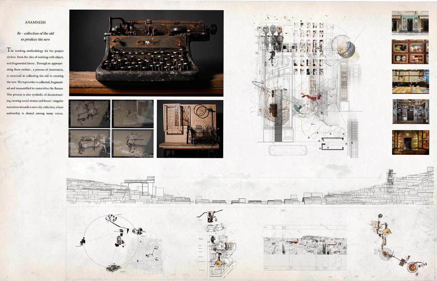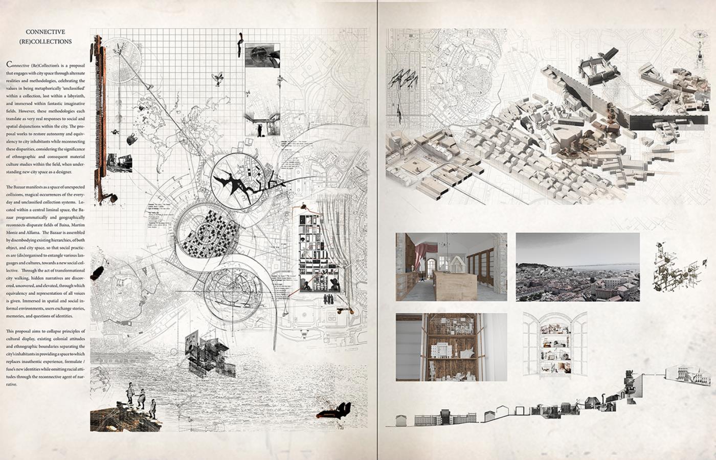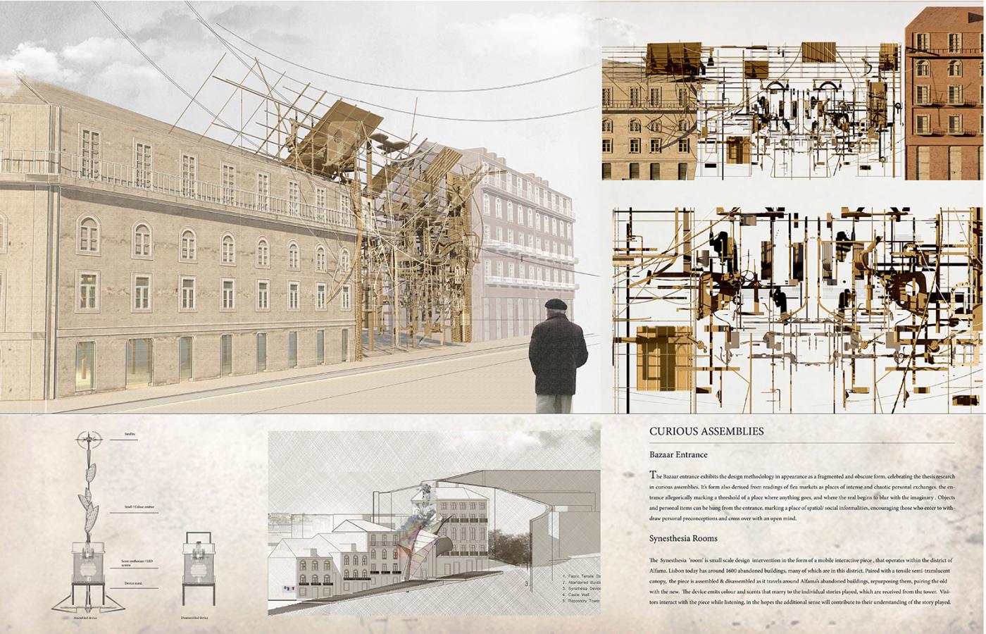 'Anamnesis: Connective (Re)Collections' is a speculative design project based in Lisbon, Portugal, and investigates the connective agent of storytelling in architectural drawing and social practices. The project engages with city space through alternate realities and methodologies, celebrating the values in being metaphorically ‘unclassified’ within a collection, lost within a labyrinth, and immersed within fantastic imaginative fields. Each methodology works to transcend existing social and spatial disjunctions within the city. The Bazaar provides a collective space which replaces inauthentic experience, while collapsing principles of cultural display, existing colonial attitudes and ethnographic boundaries separating the city's inhabitants. Identities, cultures, and languages, rather, become fused through the reconnective agent of narrative and spoken exchange. Through the collection and the re-projection of user’s stories, across the city sites, a process of anemisis occurs, resulting in a transcendence of both inner and outer space for city inhabitants. With 2020 becoming a landmark in history, with global racial injustice movements, and mass social disconnection, there is an urgency to reassemble social strata at all scales. By fragmenting and reorganising both behavioural systems and city space, new collectives can emerge which allow authorship to be shared among many voices.
