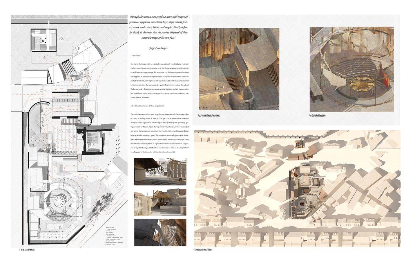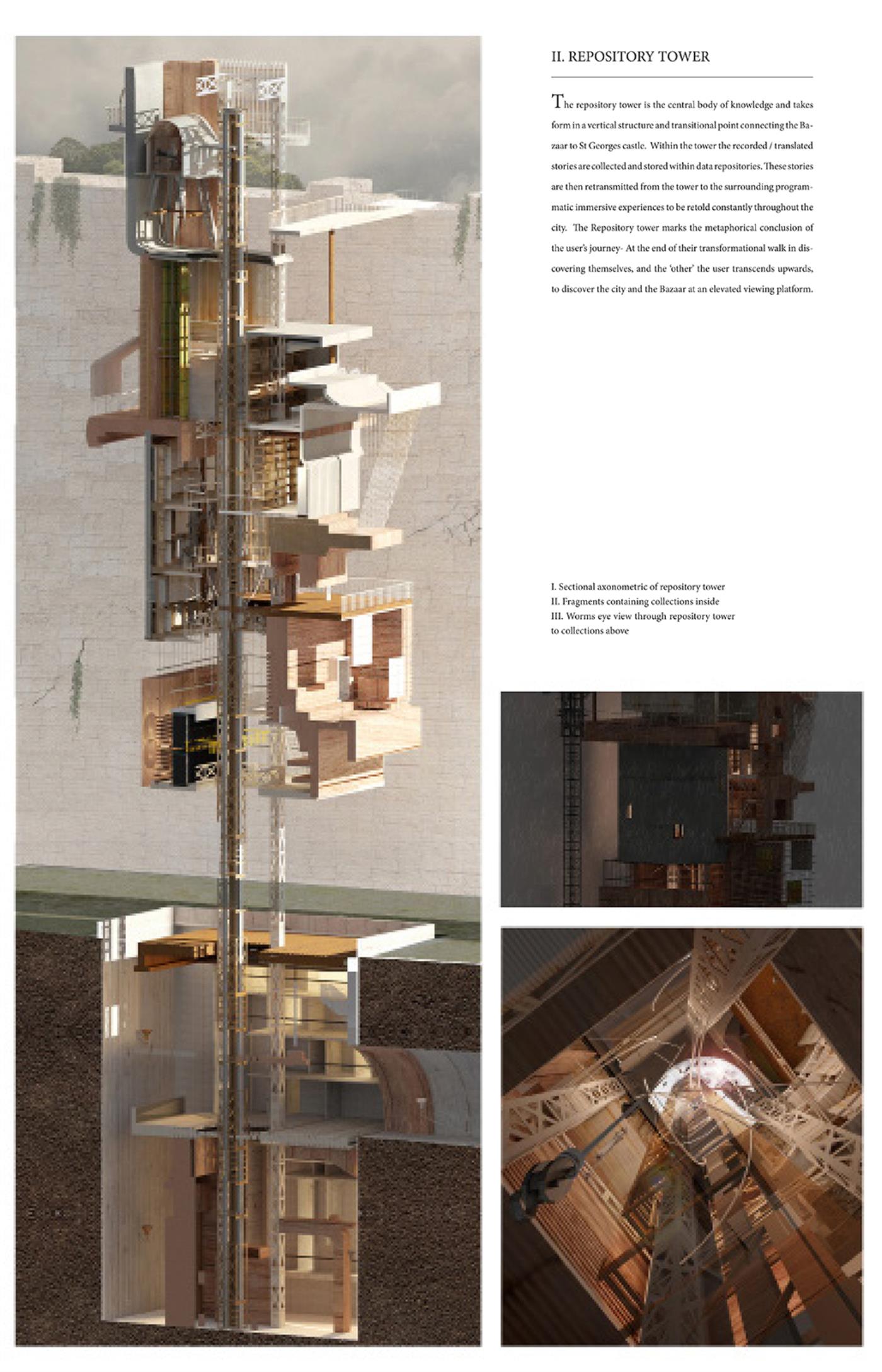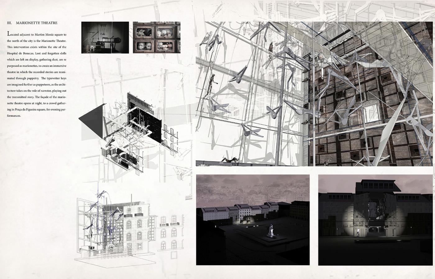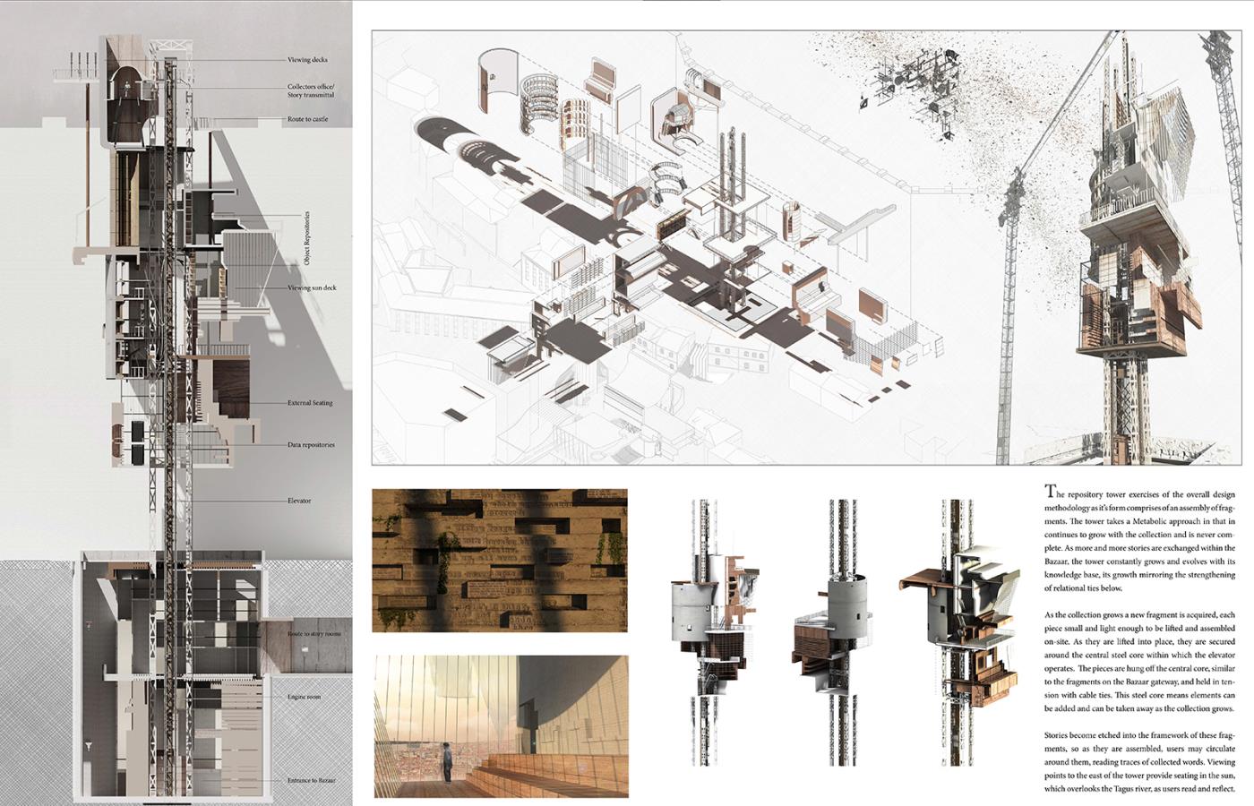'Anamnesis: Connective (Re)Collections' is a speculative design project based in Lisbon, Portugal, and investigates the connective agent of storytelling in architectural drawing and social practices. The project engages with city space through alternate realities and methodologies, celebrating the values in being metaphorically ‘unclassified’ within a collection, lost within a labyrinth, and immersed within fantastic imaginative fields. Each methodology works to transcend existing social and spatial disjunctions within the city. The Bazaar provides a collective space which replaces inauthentic experience, while collapsing principles of cultural display, existing colonial attitudes and ethnographic boundaries separating the city's inhabitants. Identities, cultures, and languages, rather, become fused through the reconnective agent of narrative and spoken exchange. Through the collection and the re-projection of user’s stories, across the city sites, a process of anemisis occurs, resulting in a transcendence of both inner and outer space for city inhabitants. With 2020 becoming a landmark in history, with global racial injustice movements, and mass social disconnection, there is an urgency to reassemble social strata at all scales. By fragmenting and reorganising both behavioural systems and city space, new collectives can emerge which allow authorship to be shared among many voices.