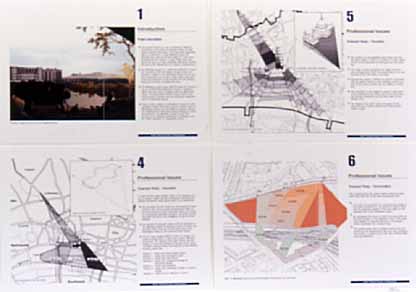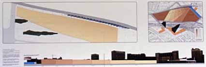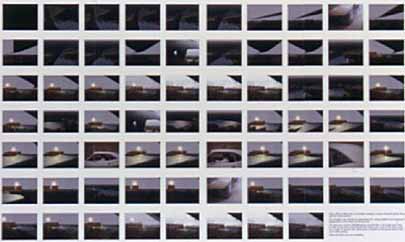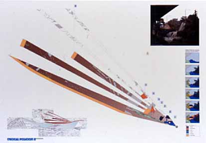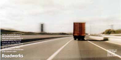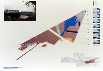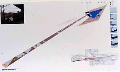 Tim Burgess’s project locates itself on the Westway at a point where it rises above the city as it rushes out to the suburbs. The work concentrates on two issues, firstly how might one use the idea employed in planning strategy - that of the ‘protected vista ‘ - to construct new vistas. Secondly, since the viewpoint from the vehicle is moving any such vista is fragmentary, more like a frame from a film, more like an after image on the retina destined to fade but remain in the memory and here to become a blur in the rear-view mirror. The controlled or ‘designed’ vista has clear classical and picturesque antecedents, in the investigation of this erratic and fleeting vista Tim Burgess exhaustively and precisely delineates the geometry of each frame in the horizontal and vertical plane with reference to speed and the existing urban terrain. As a result a system of rules are established to preserve and protect the vista of a picturesque scene that evokes the myths of the rural idyll that is the road’s conceptual destination in this way the current fetish for conservation is redirected to conserve the myths.