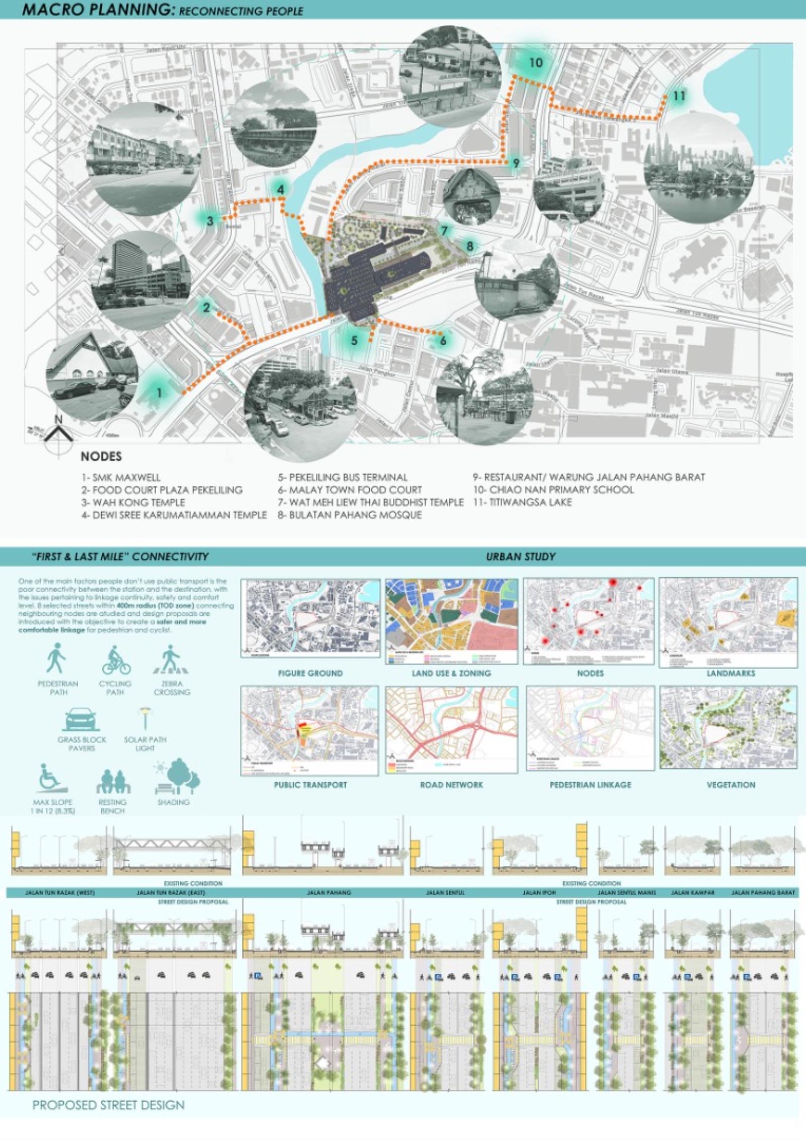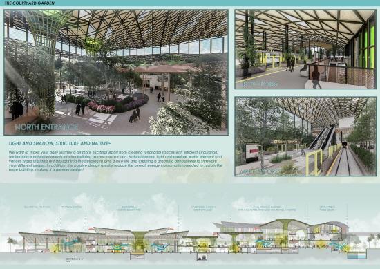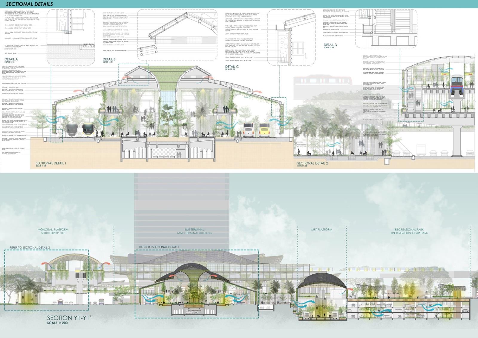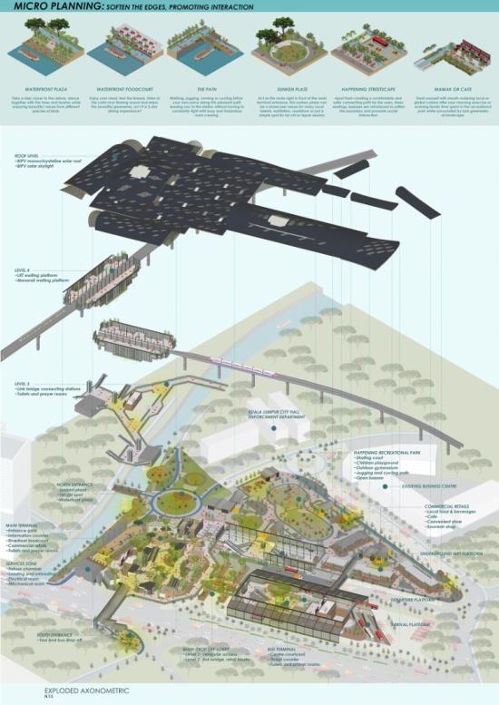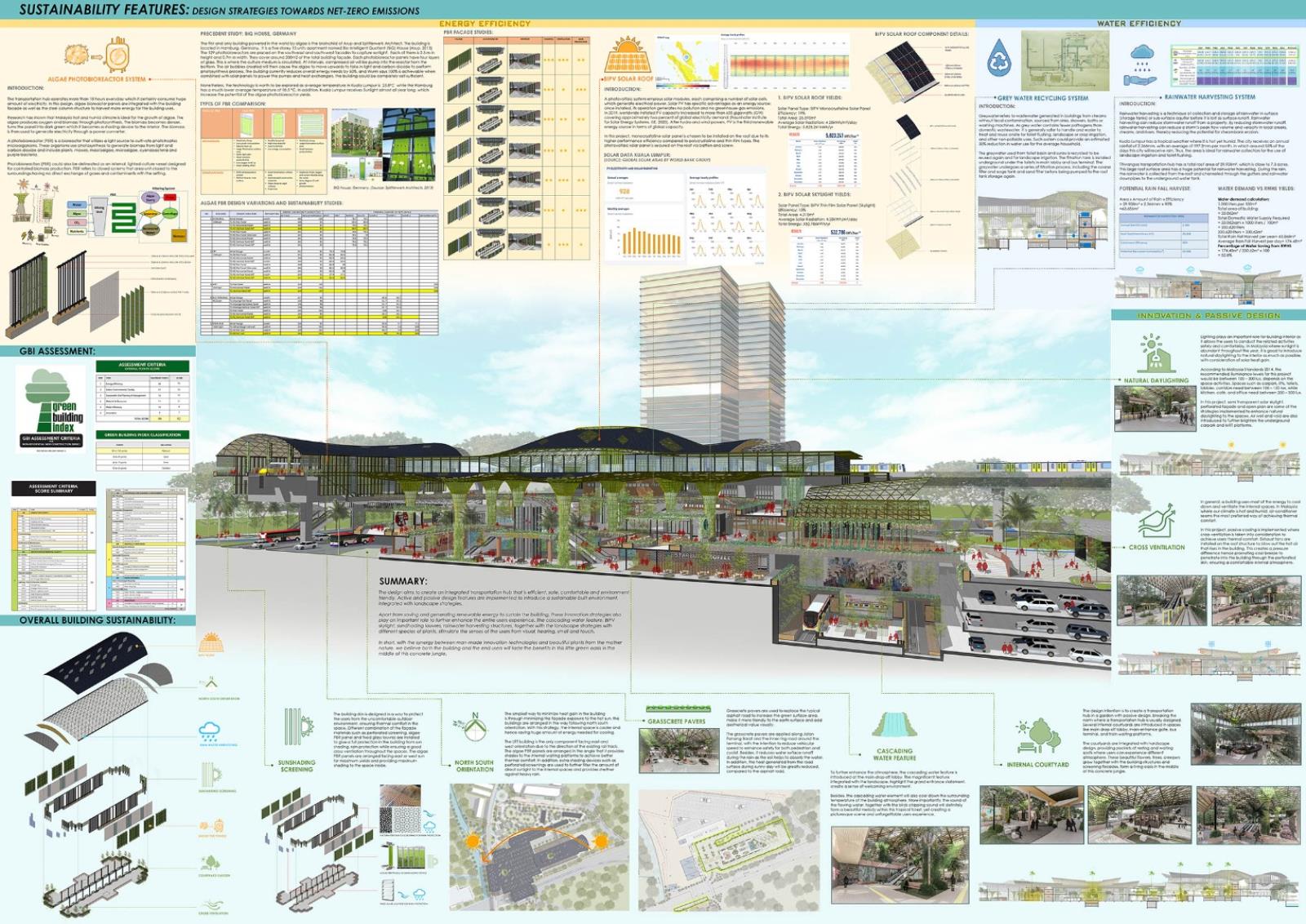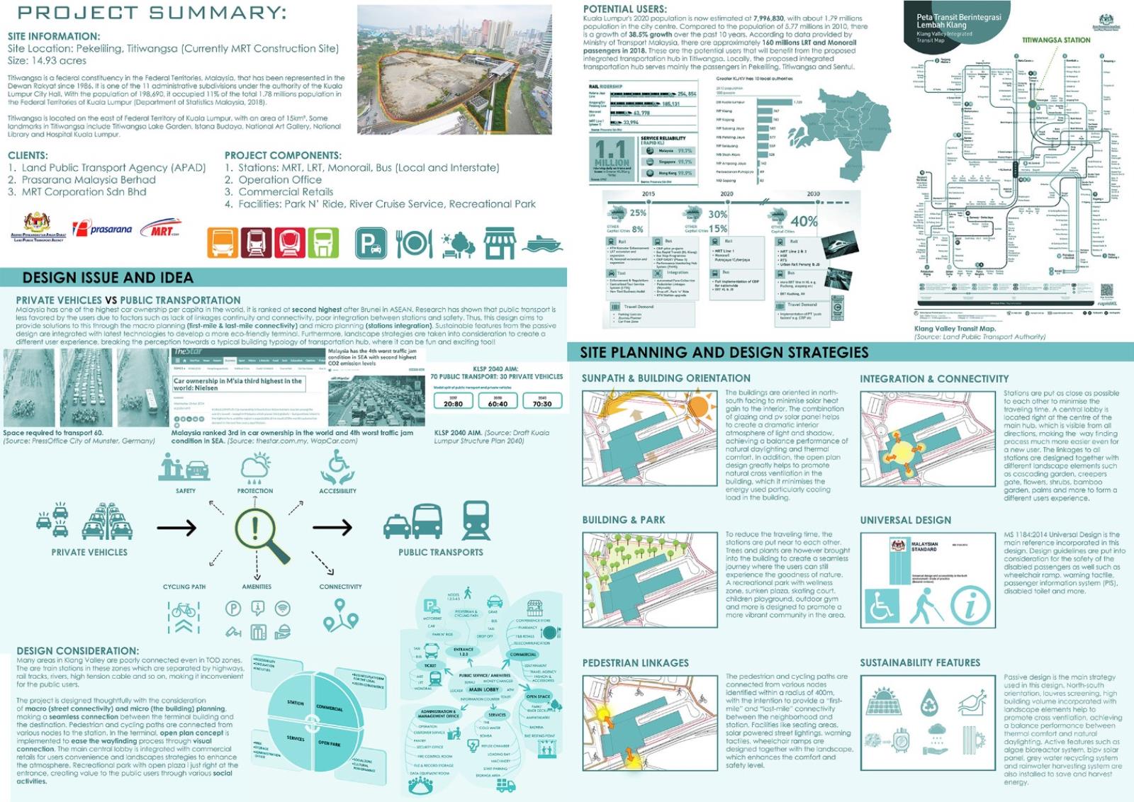 Titiwangsa Transportation Hub: The Urban Green Node Part 2 Project 2021 Phua Sai Kit University of Malaya | Malaysia The transportation hub is a crucial urban catalyst in today’s world. It operates more than 18 hours a day, 365 days a year, and consumes tonnes of energy. Contextually, Malaysia is located near the equator, and the climate here is hot and humid throughout the year. Like many others in the region, large transportation hubs are usually enclosed for air conditioning to achieve thermal comfort. These enclosures create a distinct boundary between the indoor and outdoor environment, making no connection between pedestrian linkages, human activities, buildings, and the site context.Therefore, the Titiwangsa Transportation Hub aims to be an eco-friendly terminal for various modes of transportation, equipped with sustainable features and technologies like algae photobioreactors and solar systems to achieve a net-zero energy emission. This transportation hub is located within the urban center of Kuala Lumpur. In response to the tropical climate, sustainable elements like natural daylighting, cross ventilation, rainwater harvesting systems are integrated with lush tropical landscapes to keep the users comfortable and excited.Overall, this hub is an urban green node that presents itself as an innovative and serene public tropical oasis in the hectic concrete jungle of Kuala Lumpur for the people to congregate and make friends! Tutor(s) Muhammad Azzam Bin Ismail