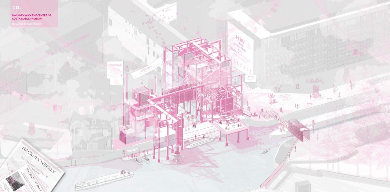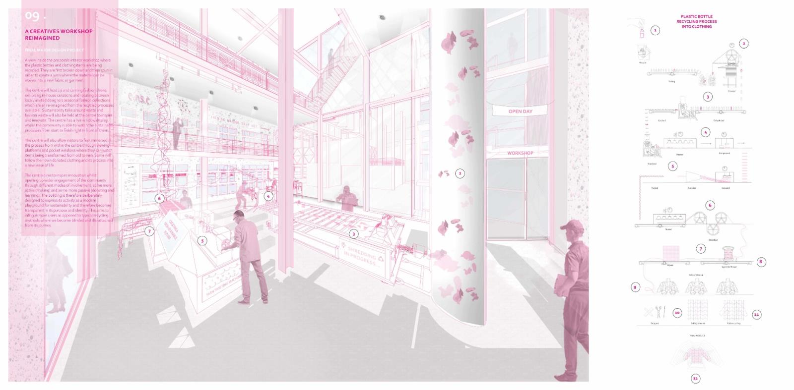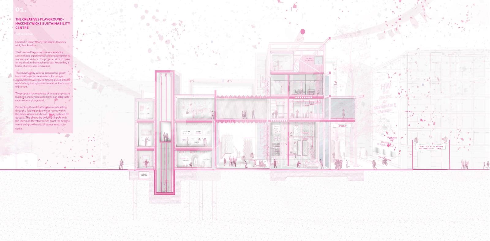 The Creatives Playground Sustainability Centre Part 1 Project 2023 Ellie Spencer London South Bank University | UK The Creatives Playground Sustainability Centre is a transformative design project situated in Hackney Wick, East London. Its main objective is to integrate itself into the community, generating positive social and economic change. The centre serves as a hub for creativity, aiming to preserve and promote the area's artistic heritage while also providing much needed job opportunities.The project prioritises sustainability by providing adaptable and affordable workspaces for creatives and emphasising waste recycling in design. It encourages a shift in perspective, viewing waste as a valuable resource for future creations.Functioning as a community gateway, the proposal features designated collection pods where locals can donate used items like plastic bottles and old clothes. These contributions are then repurposed within the centre, serving as essential materials for diverse creative endeavours.The project takes steps towards addressing the issues surrounding fashion waste by treating old clothing and plastic as valuable assets rather than disposable waste, contributing to closing the loop on fashion fashion waste and setting a positive example for sustainable practices.In conclusion, The Creatives Playground Sustainability Centre stands as a testament to environmental consciousness, community engagement, and creative empowerment, striving to leave a lasting positive imprint on Hackney Wick and Fish Island. Tutor(s) Liam Bedwell Monika Jociute