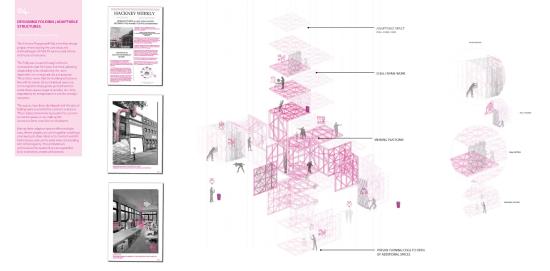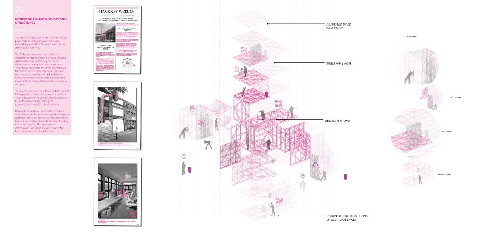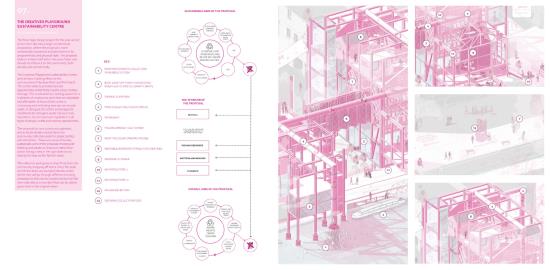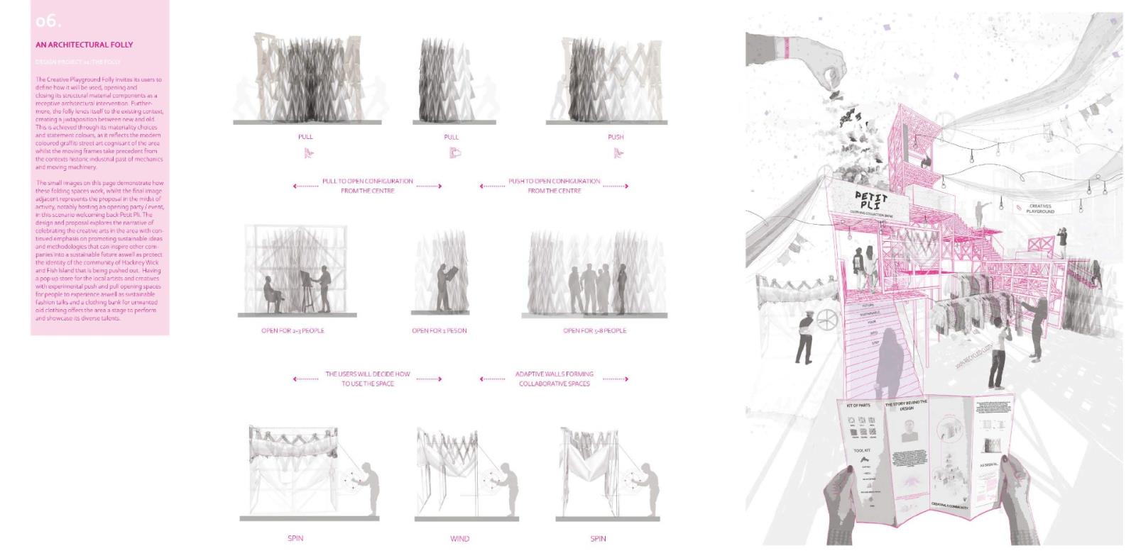 The Creatives Playground Sustainability Centre Part 1 Project 2023 Ellie Spencer London South Bank University | UK The Creatives Playground Sustainability Centre is a transformative design project situated in Hackney Wick, East London. Its main objective is to integrate itself into the community, generating positive social and economic change. The centre serves as a hub for creativity, aiming to preserve and promote the area's artistic heritage while also providing much needed job opportunities.The project prioritises sustainability by providing adaptable and affordable workspaces for creatives and emphasising waste recycling in design. It encourages a shift in perspective, viewing waste as a valuable resource for future creations.Functioning as a community gateway, the proposal features designated collection pods where locals can donate used items like plastic bottles and old clothes. These contributions are then repurposed within the centre, serving as essential materials for diverse creative endeavours.The project takes steps towards addressing the issues surrounding fashion waste by treating old clothing and plastic as valuable assets rather than disposable waste, contributing to closing the loop on fashion fashion waste and setting a positive example for sustainable practices.In conclusion, The Creatives Playground Sustainability Centre stands as a testament to environmental consciousness, community engagement, and creative empowerment, striving to leave a lasting positive imprint on Hackney Wick and Fish Island. Tutor(s) Liam Bedwell Monika Jociute