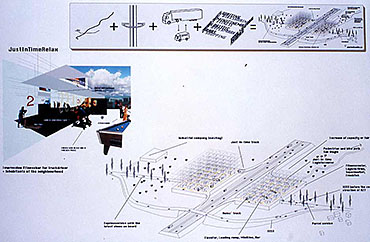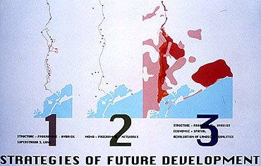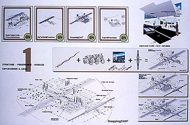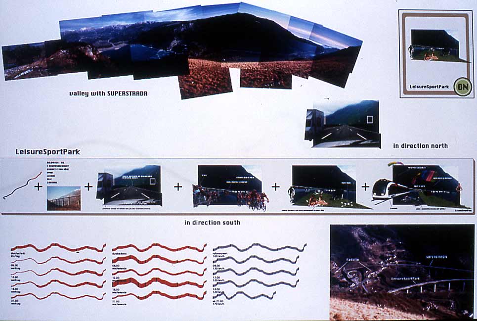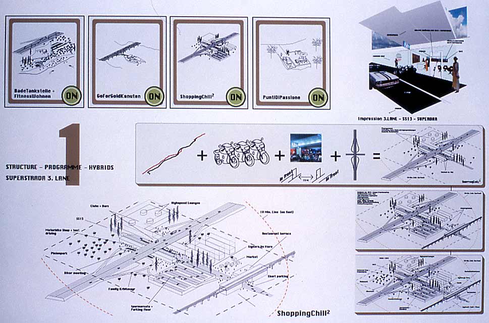 The programmatic evolution of the Autostrada Alemagna to the SUPERSTRADA and at the same time the main strategy of guiding the development to the Strip, creates conceptually and realistically a very strong and pointed new system of structure in connection with the existing monotonous sprawl.