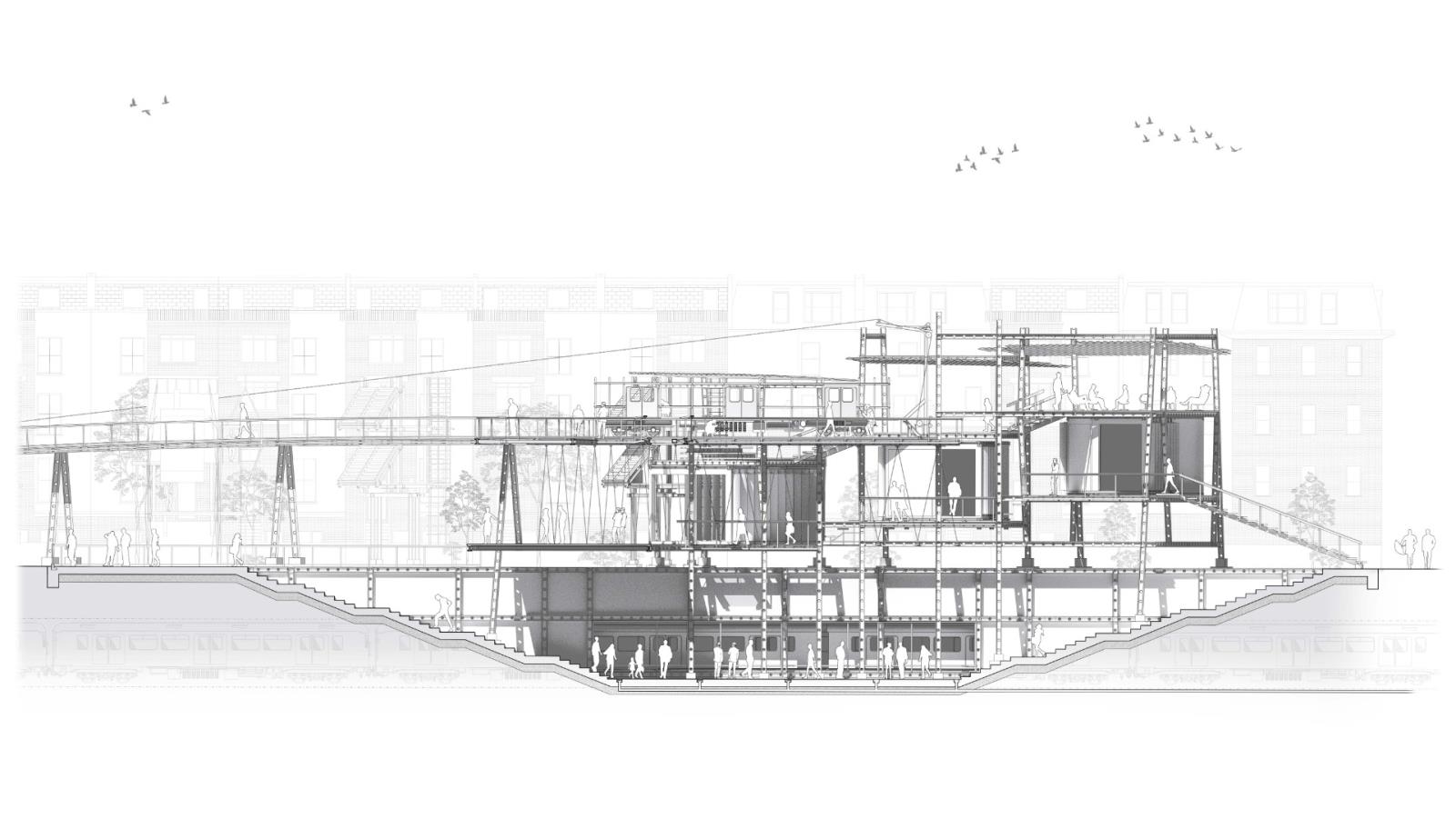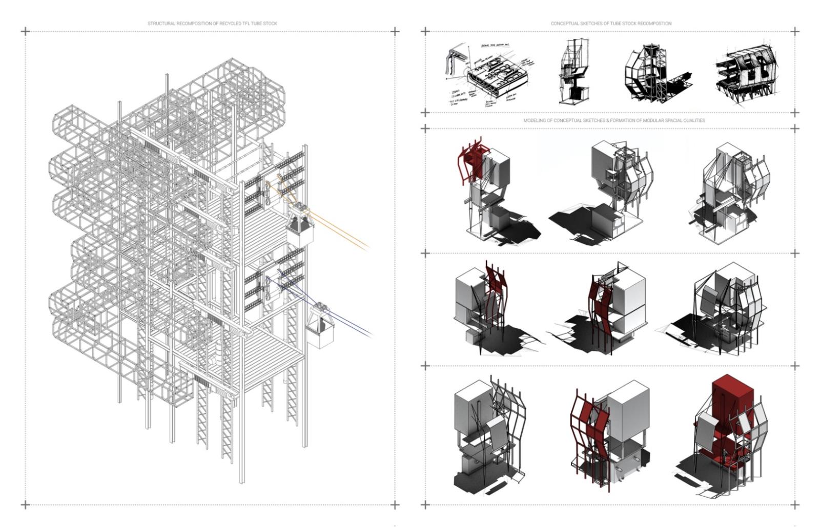 The project introduces a civic space that celebrates infrastructure while allowing users to view the live recycling process within the civic centre; deconstructing retired Transport for London (TfL) trains to sustainably produce living capsules.