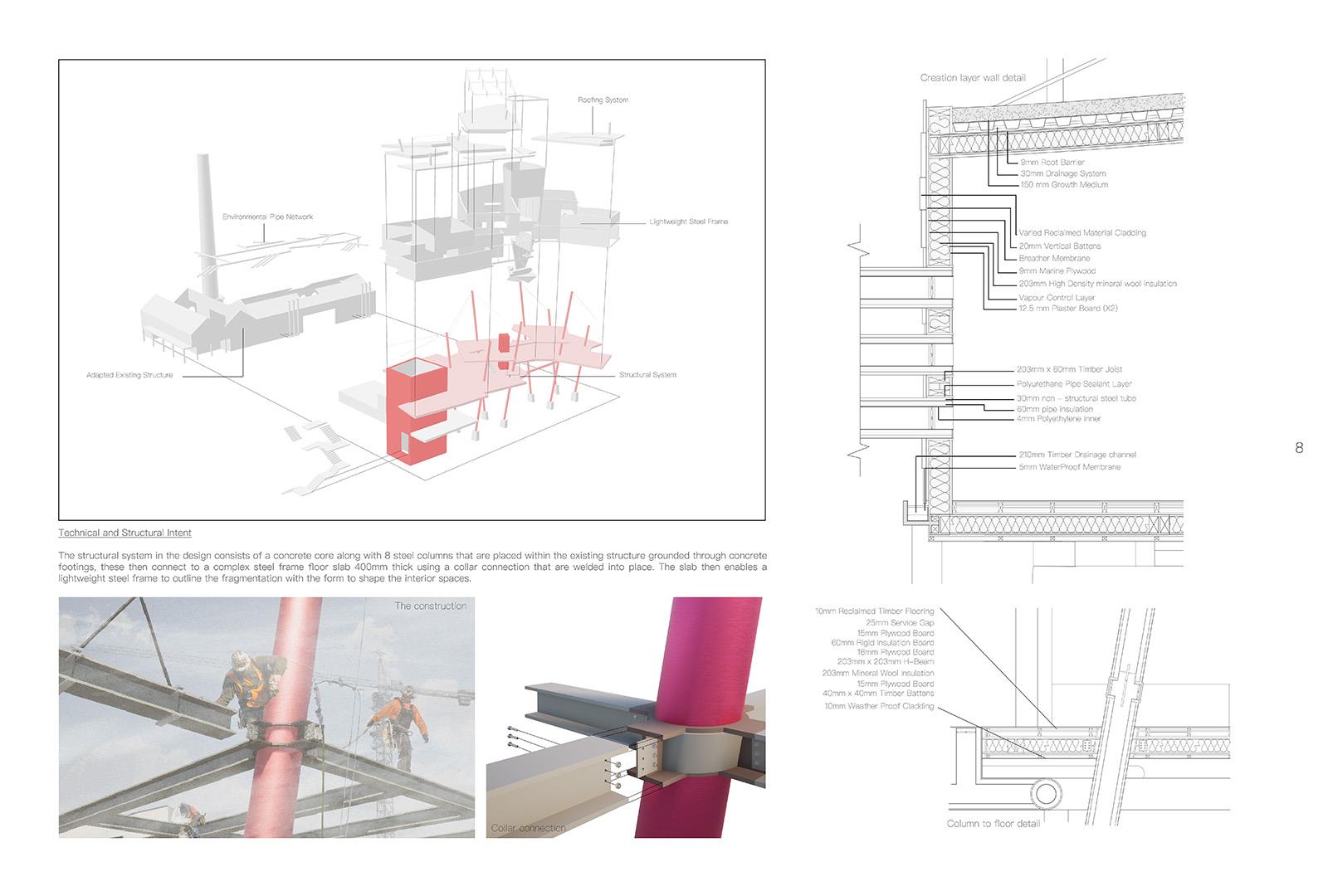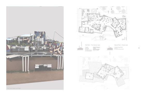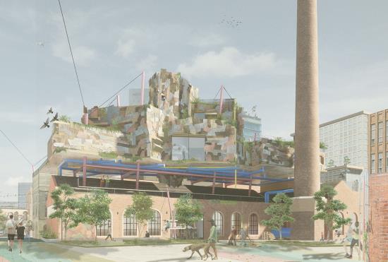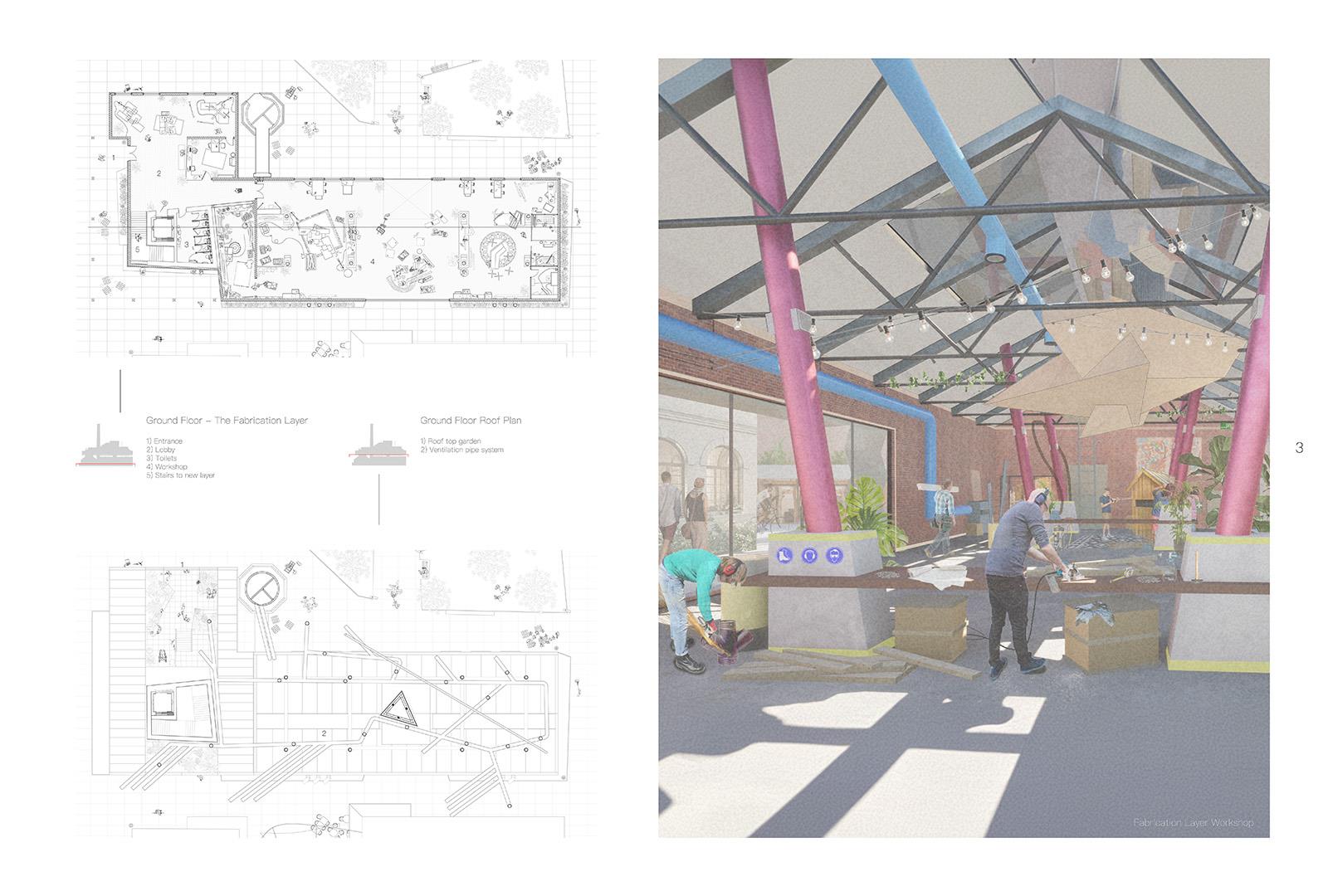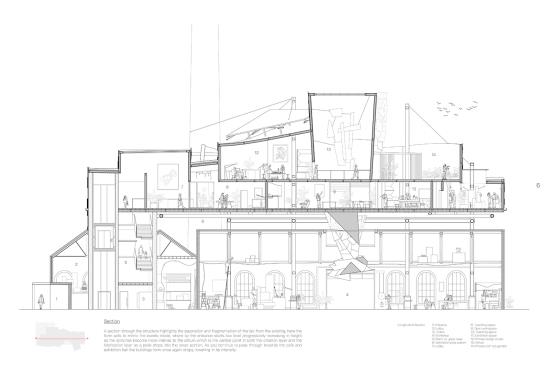The proposed Design Lab would become the core of the campus, encouraging experimentation and collaboration to enhance the community voice. Here architectural layers are used to respect the historic narrative, with the refurbished existing building becoming a fabrication layer whilst a new sculptural mass placed on top would become the creation layer.