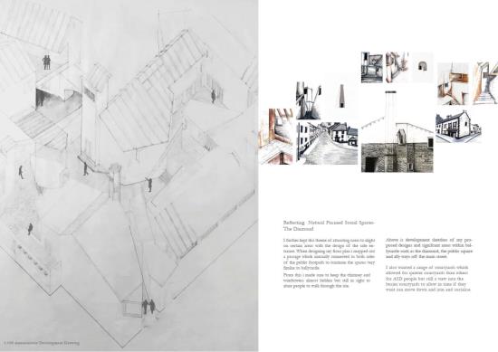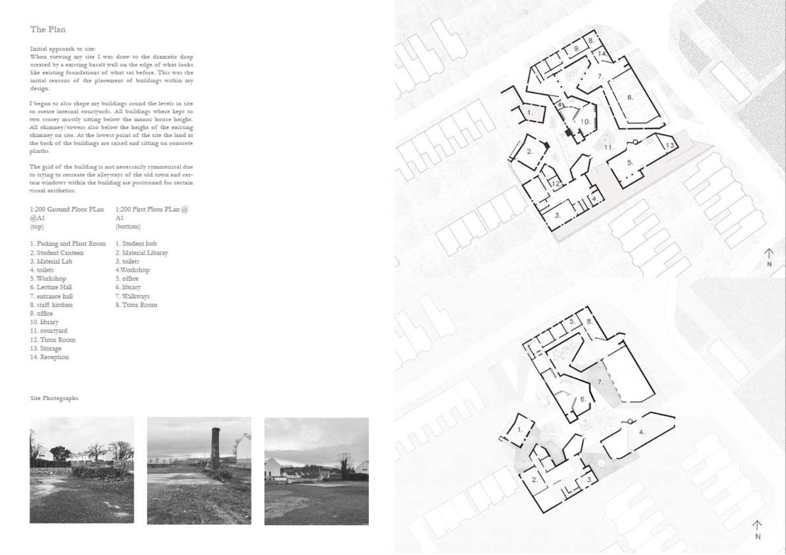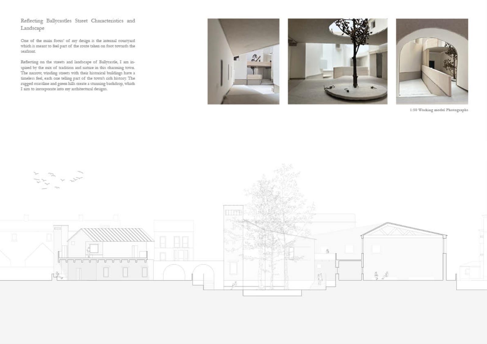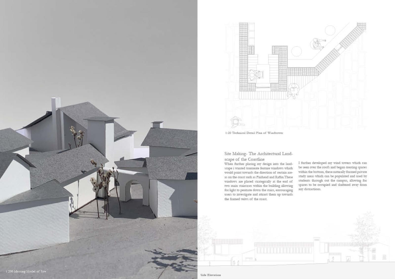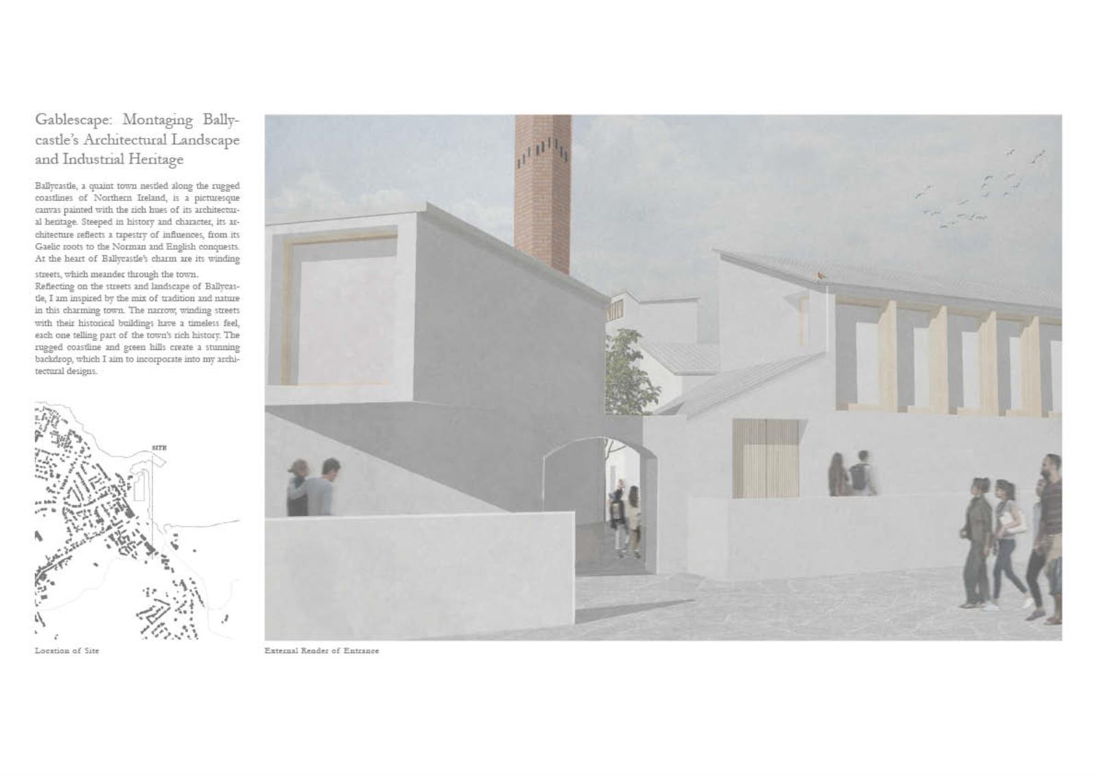 Gablescape is an exemplary design project for a state-of-the-art technical material research centre in Ballycastle, Northern Ireland. It masterfully fuses tradition and innovation, drawing inspiration from iconic forms along the journey from the town centre to the coast. Every entrance, corner, and space reflect the town's architectural and industrial heritage, paying homage to the local landscape and history.