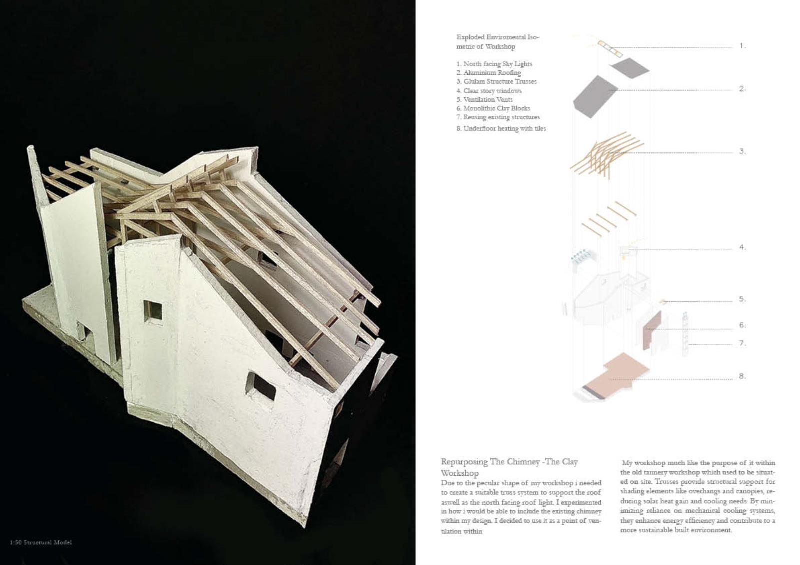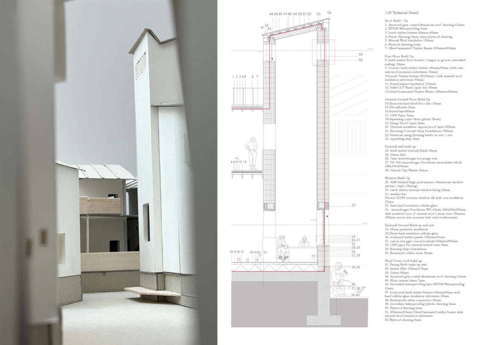 Addressing the climate emergency, Gablescape incorporates sustainable strategies like maximizing natural ventilation, reducing solar gain, enhancing thermal mass, and optimizing acoustics. Reusing materials from the historic Body Manor House minimizes embodied carbon, while the on-site chimney, repurposed as a ventilation point, is complemented by wind towers. Whitewashed monolithic brick walls provide excellent thermal mass, and the trusses offer structural shading and aesthetic appeal.
