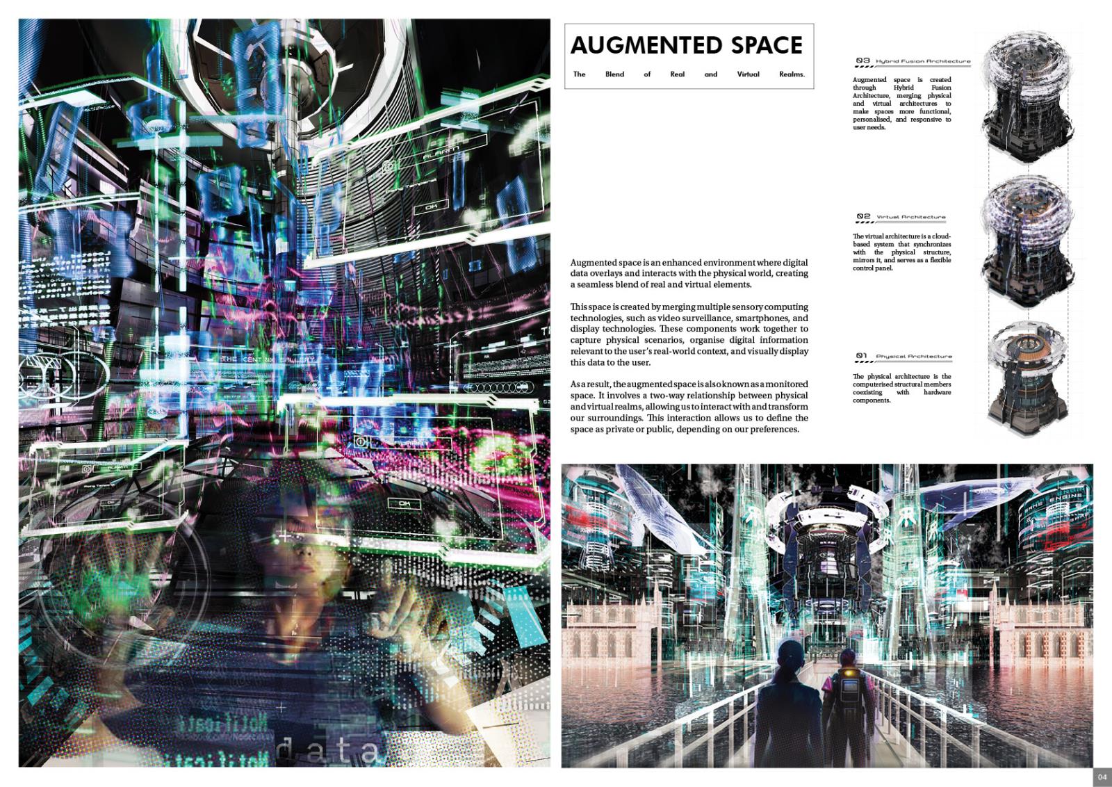 The city environment uses virtual and physical elements to create an 'Augmented Space' that adapts to users in real-time. This led to the 'Hybrid Fusion' architecture movement, which made architecture more adaptable, customisable, and personalised.