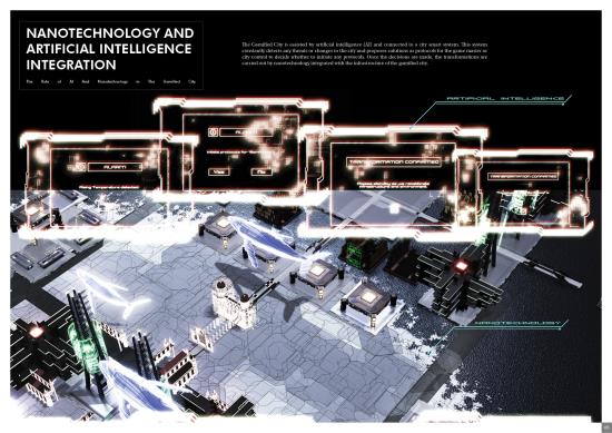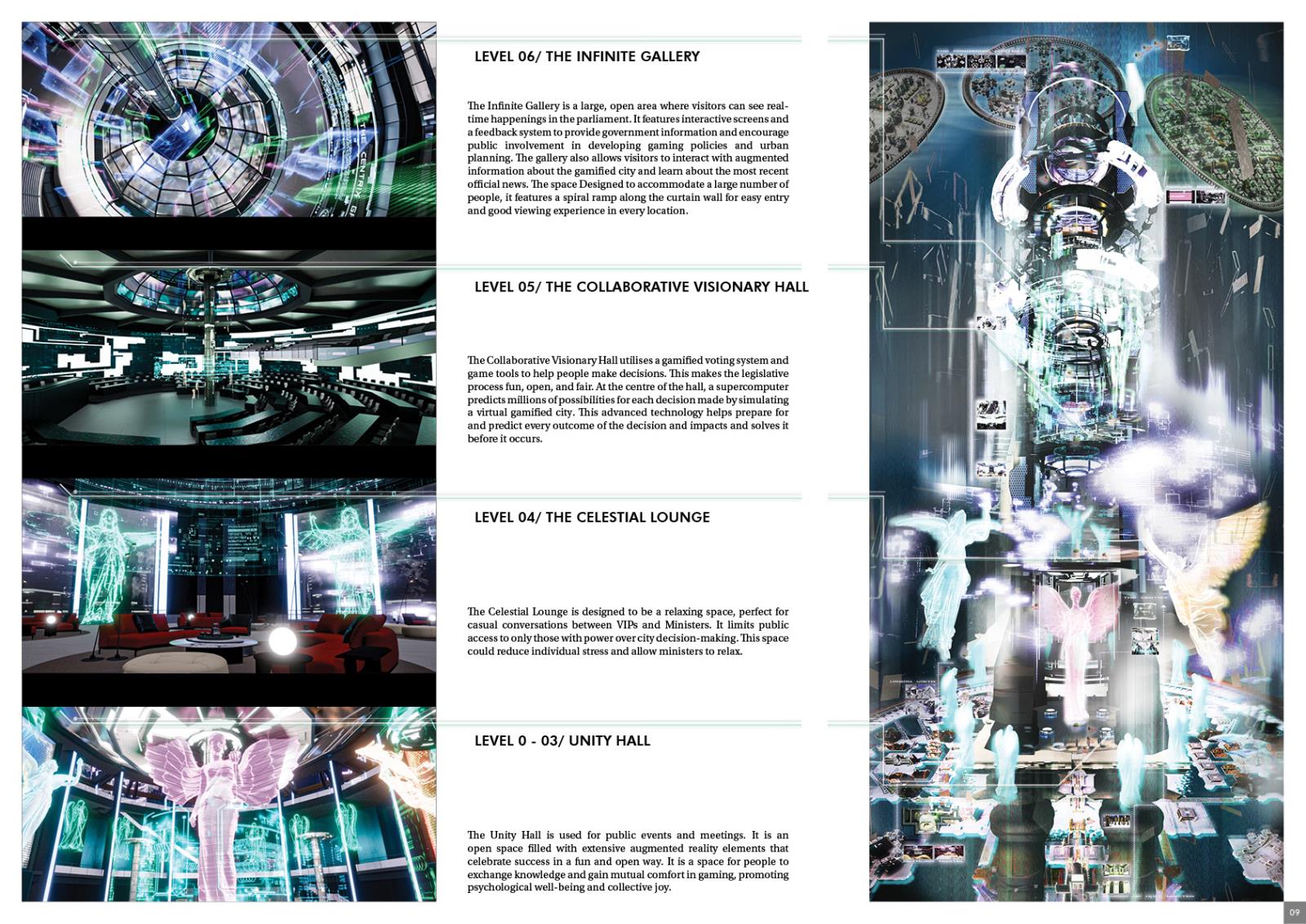 This futuristic floating city is envisioned as a 30-year development plan in which the city floats on the sea and utilises the concept of 'Play to Earn'. It combines technologies such as Artificial Intelligence (AI), Augmented Reality (AR), and Gamification to create a sustainable urban environment where life, work and Play are seamlessly integrated with AI games to transform work tasks into engaging and rewarding activities.