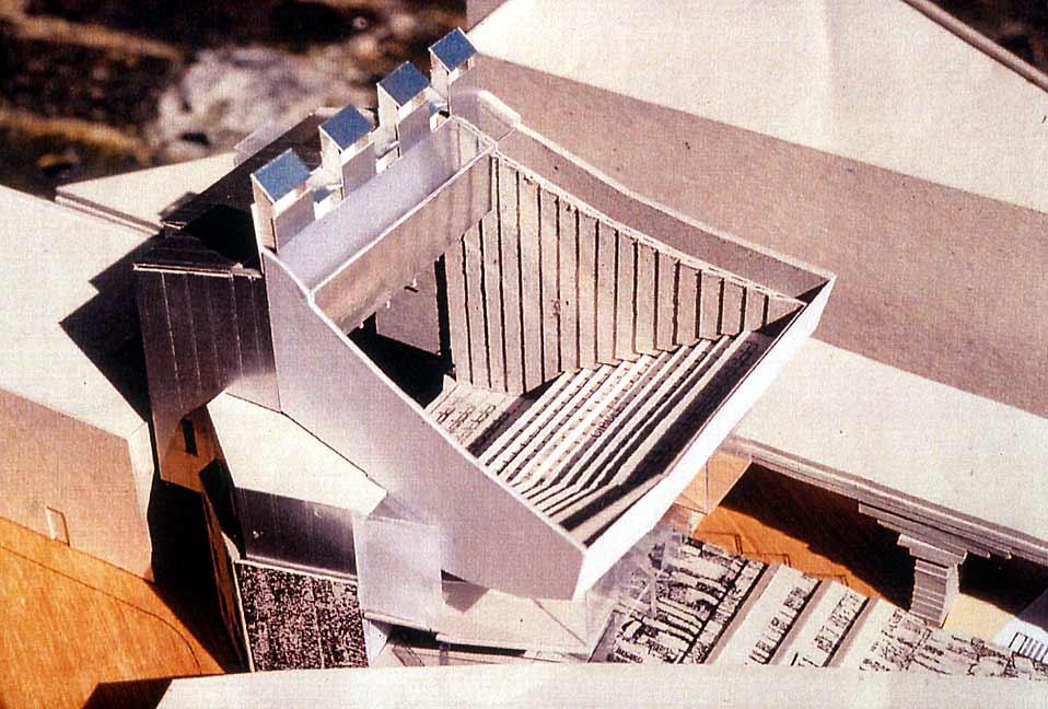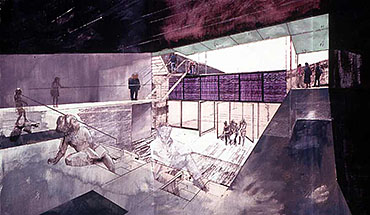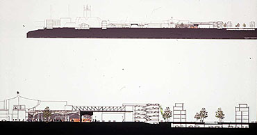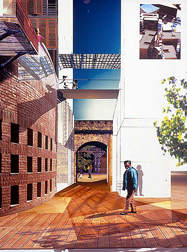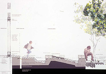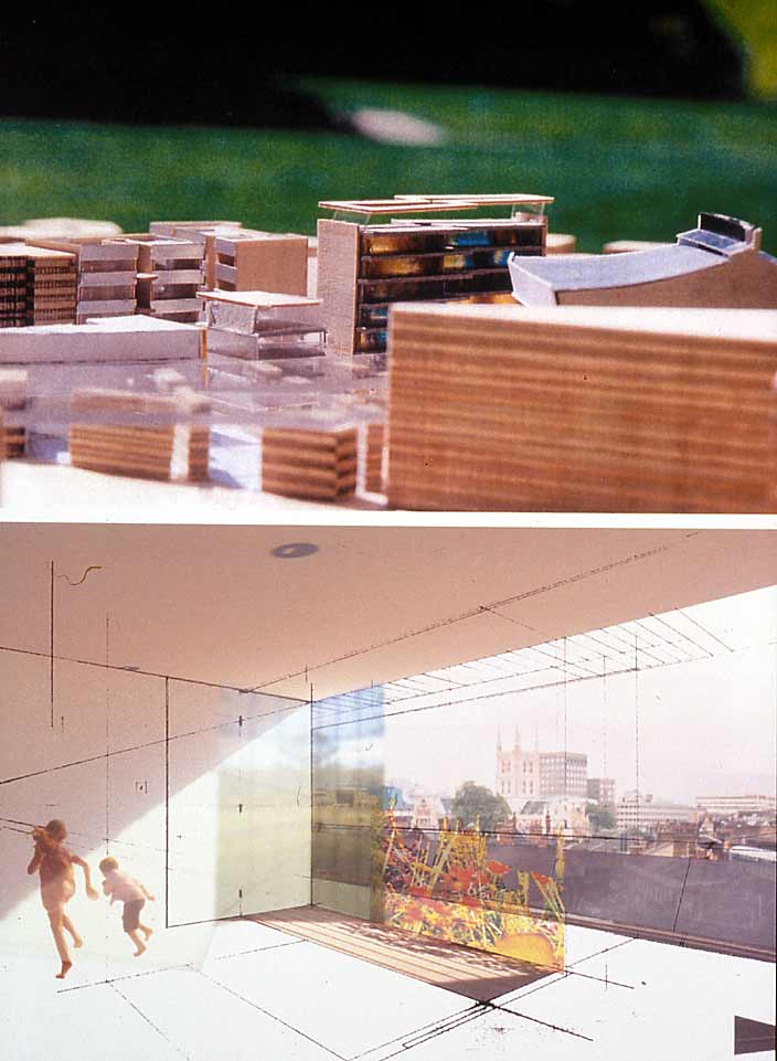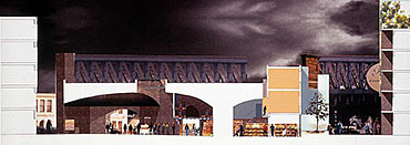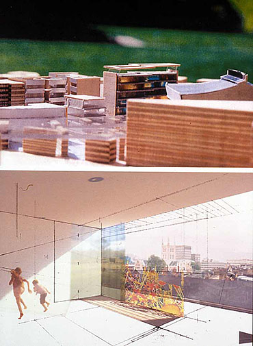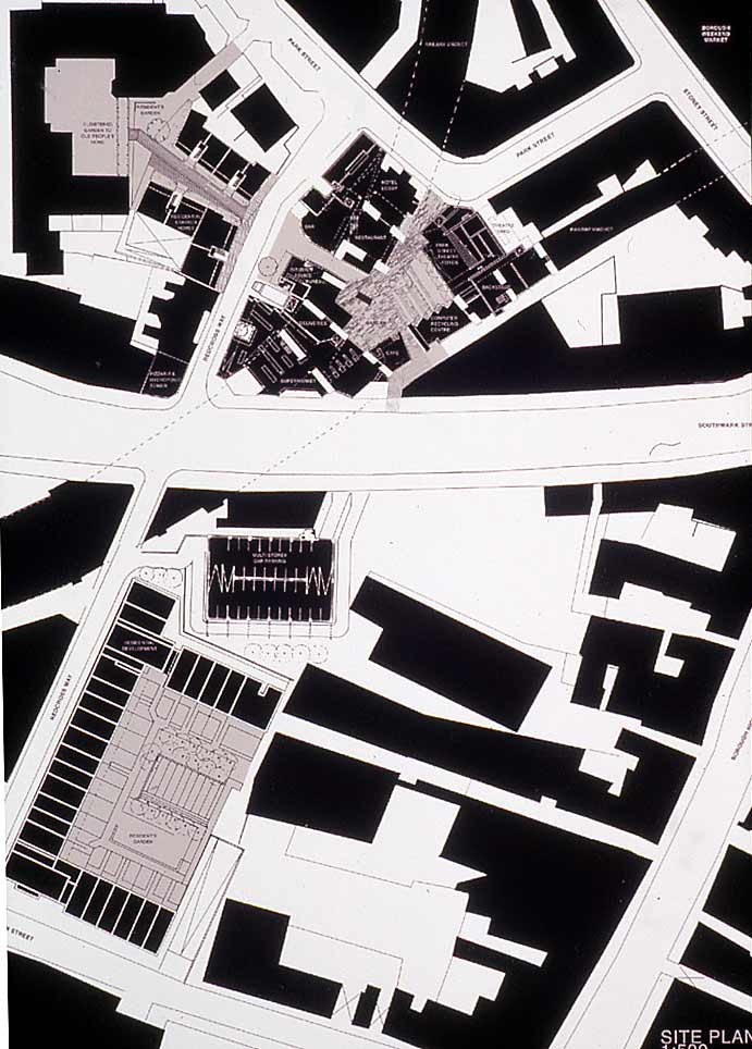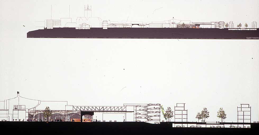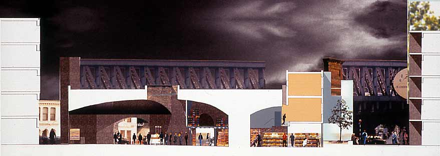 London Bridge Theatre & Masterplan Part 1 Project 2002 James Bichard University of Cambridge | UK The scheme aims to reconcile the tensions between residents in this area of Southwark and tourists, who are ever increasingly being drawn into the South Bank by Tate Modern, Globe Theatre and other initiatives. The project provides a much needed Supermarket to the area, which is then used as a physical pivot point and social catalyst for generating a sense of community and permanence to an area thwarted by persistent short term daily visitors. The theatre occupies a tight land-locked site between a triangle of railway viaducts, and its sail-like form is generated in response to environmental concerns, urban horizons and acoustic considerations. A garden running between the supermarket and theatre continues underneath the auditorium into the foyer, providing a ‘delicate’ internal garden protected from the tough urban surrounds. This is then landscaped in such a way as to provide a community debating and informal theatre space for use by the community.The auditorium above provides a flexible theatre, with optional skylights and natural ventilation, as a forum for community theatre. The urban strategy includes a 22metre high hydroponics tower and research lab, which draws grey water from high-density low embodied-energy designed housing and provides a landmark corner to the southern end of the site. A family hotel beside the theatre uses a fully shuttered façade to make explicit hotel occupancy levels to nearby residents, and help encourage within the supermarket-garden-theatre scenario an informal and dynamic environment for positive interaction between the otherwise disparate lives of locals and visitors. This second and third year vertical studio was based near London Bridge, in the atmospheric Borough Market. Students grappled with restricted vertical space determined by deteriorating Victorian rail viaducts, and explored problems of transition, the area having recently arrived on the tourist map with the opening nearby of Tate Modern, etc. City spill-over has added both economic pressure and regeneration. Borough Market itself is rapidly expanding and has become a tough but posh insertion into the ragged terrain of Southwark. The area’s historical role as theatre and entertainment district and magnet for travellers, prostitutes, gamblers and other outsiders offered a grounding for design strategies built around alternative theatres and hotels. On a restricted site between the market and Southwark neighbourhoods, James Bichard’s project shows an exceptionally high level of lateral thinking. In attempting to forge realistic links between community, market and tourists, his urban design proposals have broken the line of gentrification along the Thames to extend well into Southwark.The supermarket, at a critical junction under the rail bridge, is an example of the inspired everyday and is imaginatively balanced by the high architectural profile of the theatre. The two buildings put in play high and low culture across a garden and the whole complex is bounded by rail viaducts in a series of juxtapositions that echo well the incongruities of the market area. Green space – theatre garden, hydroponic tower, hotel eco-balconies, and a smattering of residential backyards, both existing and proposed - makes important links in the urban fabric, and, typically, Bichard uses the opportunity to explore the ecological possibilities of his proposal.